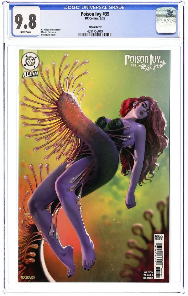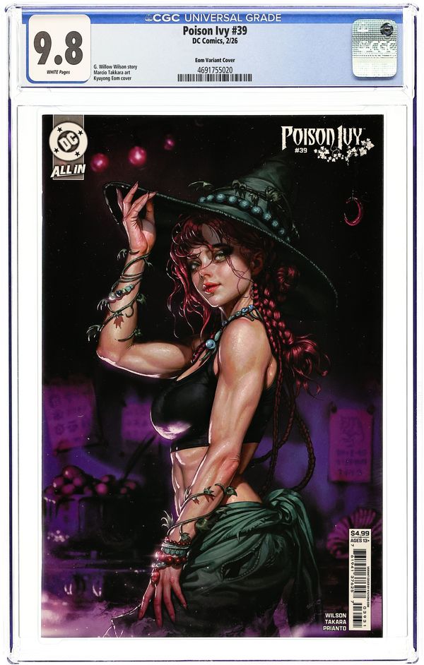 The 616 Comics, Comic Traders, and Big Dex Comics Exclusive Foil Edition Virgin Cover by Cedric Poulat. Written by G. Willow Wilson. Art by Marcio Takara. BATTLE IN SEATTLE! The Order of the Green Knight's leadership hangs in the balance as Poison Ivy and the Gardener go head-to-head in a brutal fight to see who will control the organization and who will be stripped of their power (and perhaps even more). Can Ivy count on her new allies within the Order to have her back, or will they turn on her? 32 pages, full color. Rated T+