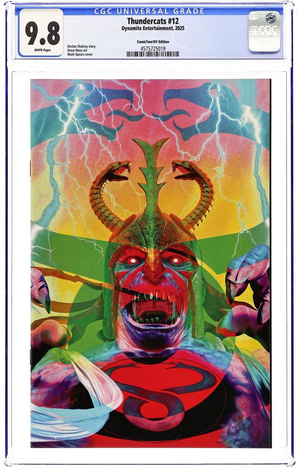 Limited 1 for 10 Retailer Incentive Variant Cover. Written by Declan Shalvey. Art by Drew Moss. Cover by Declan Shalvey. Fleeing through space to escape their dying home world, the ThunderCats were attacked en route by their mortal enemies, the Mutants of Plun-Darr. After diverting their damaged flagship to a planet called Third Earth, the surviving ThunderCats now strive to rebuild their society in harmony with the new world's natives. But the Mutants, determined to possess the ThunderCats' mystical gem, the Eye of Thundera, have tracked them down - and they've also forged an alliance with Mumm-Ra, the devil-priest of Third Earth! Now the ThunderCats, led by an inexperienced Lion-O, must band together as never before to protect their legacy from this combined enemy. But will they be able to withstand the onslaught of Mumm-Ra the Ever-Living, once he sets his eyes upon them? The triple-threat talents (writers, artists, and ThunderCats superfans) of DECLAN SHALVEY and DREW MOSS join forces to bring this exciting new entry in the ThunderCats canon to life! This premier issue features 24 story pages as well as a host of the finest cover artists the galaxy has ever seen, including SHALVEY, DAVID NAKAYAMA, LUCIO PARRILLO, JAE LEE & JUNE CHUNG, and IVAN TAO! 32 pages, full color. Rated T Cover price $4.99.