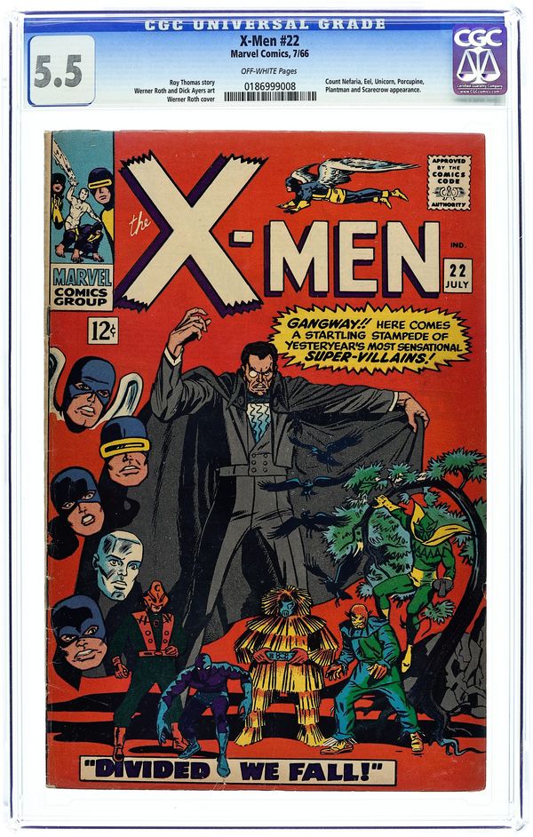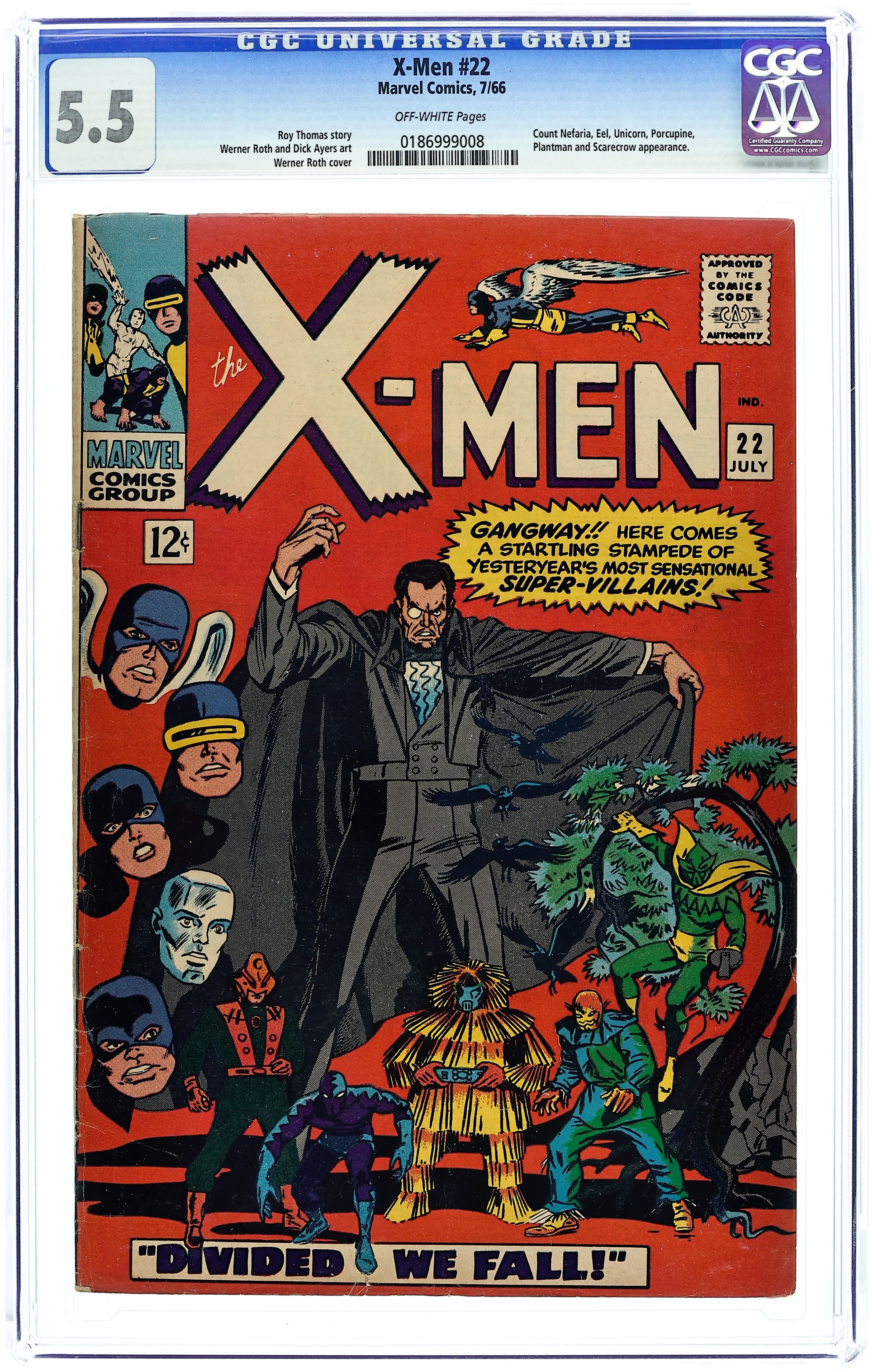 Count Nefaria, the Plantman, the Scarecrow, the Porcupine, the Eel, and the Unicorn appear. Cover pencils by Werner Roth, inks by Dick Ayers. Divided--We Fall!, script by Roy Thomas, pencils by Werner Roth (as Jay Gavin), inks by Dick Ayers; Trying once again to take a vacation, the X-Men are individually drawn to Central Park where they encounter phantom versions of themselves; One by one, they fall to five super powered villains; The X-Men are brought to Count Nefaria's fortress and he tries to convince them to join his plot to steal Washington D.C. and hold it for ransom. 36 pgs. $0.12. Cover price $0.12.