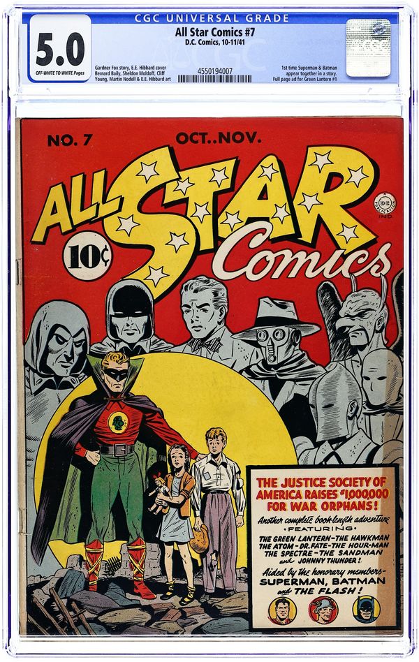 Winter 1940. 1st appearance of the Justice Society of America. Full-length story, "The First Meeting of the Justice Society of America" by Gardner Fox with individual episodes featuring the Flash (art by Everett E. Hibbard), the Spectre (art by Bernard Baily), Doctor Fate (art by Howard Sherman), the Hawkman (art by Sheldon Moldoff), the Sandman (art by Creig Flessel), the Hour Man (art by Baily), Green Lantern (art by Martin Nodell), and the Atom (art by Ben Flinton). Red Tornado and Johnny Thunder cameos (art by Sheldon Mayer). Two-page Johnny Thunder text story, "Guarding an Heiress" (art by Mayer). Hibbard cover. 68 Pages, Full Color. Cover price $0.10.