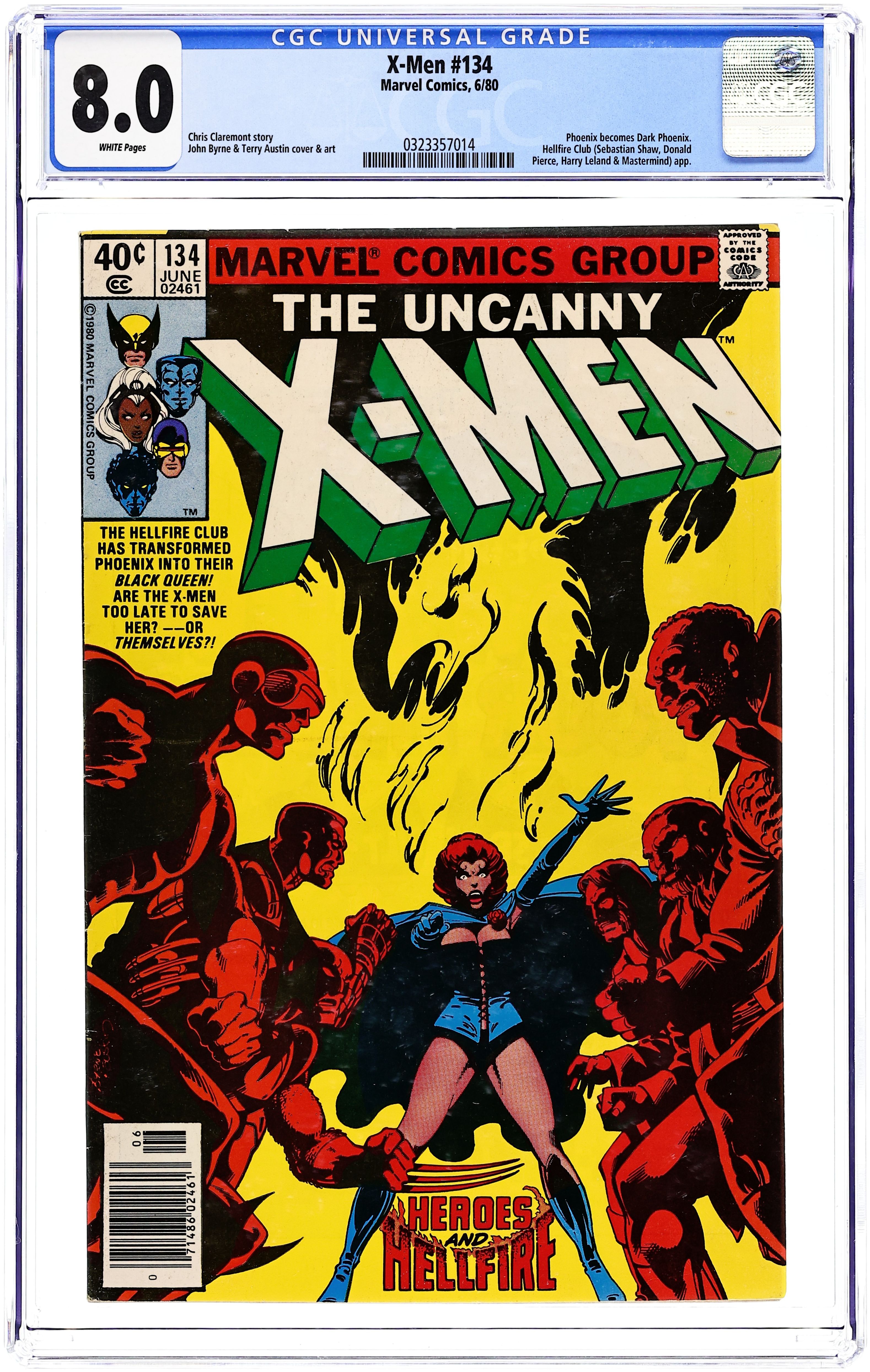 Newsstand Edition. The Dark Phoenix Saga: Part 6 of 9 - "Too Late, The Heroes!" Story by Chris Claremont and John Byrne. Art by John Byrne and Terry Austin. The X-Men finally turn the tables on their captors, but too late to help Jean Grey. For months the Master of Illusion, Mastermind, in the guise of Jason Wyngarde, has been psychically seducing Jean. However, his mental tampering has unleashed the most dangerous creature this universe has ever seen. Thus, the Dark Phoenix is born, and no force on earth may be able to stop her. 36 pgs. Cover price $0.40.