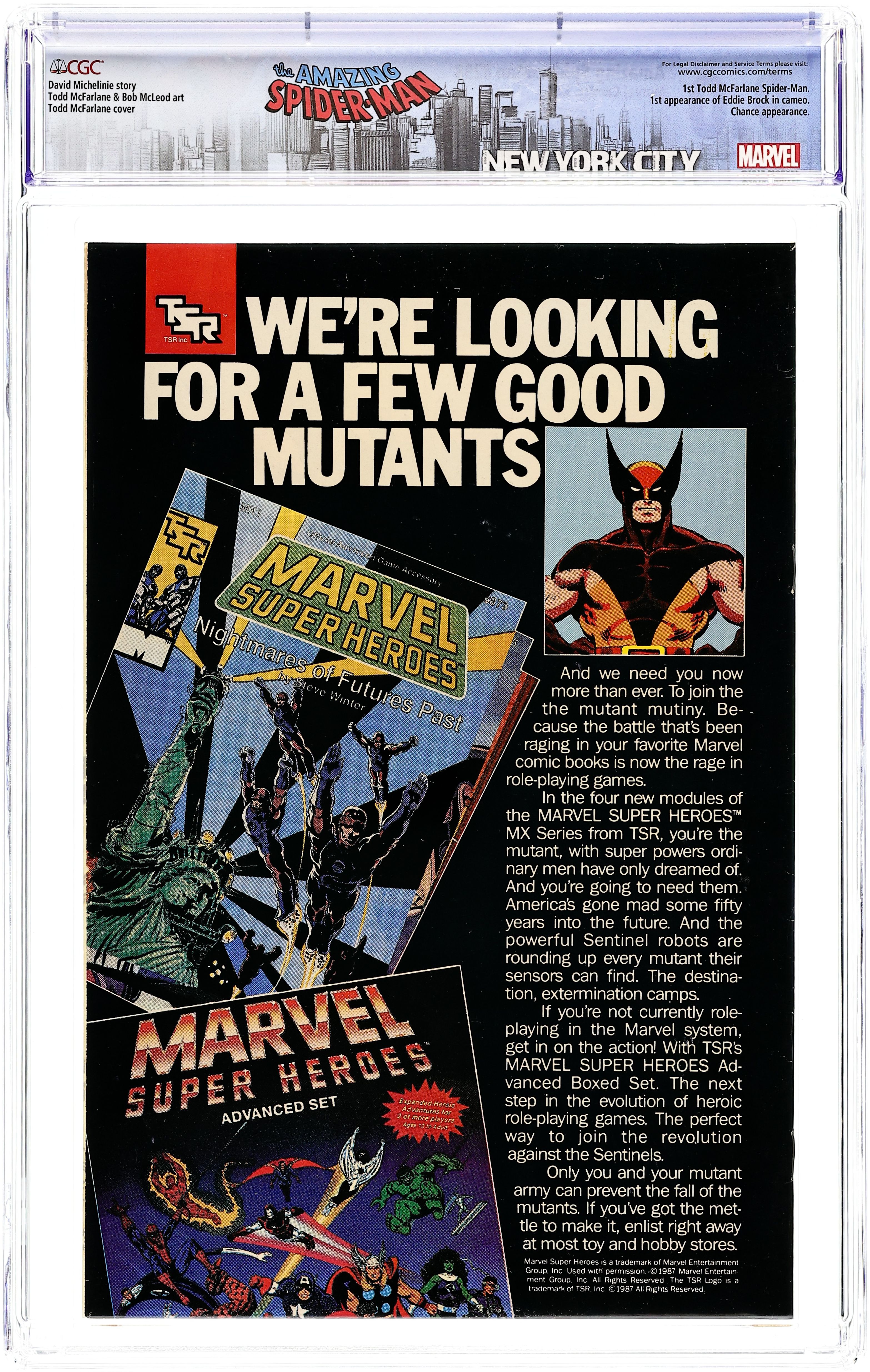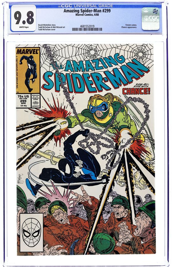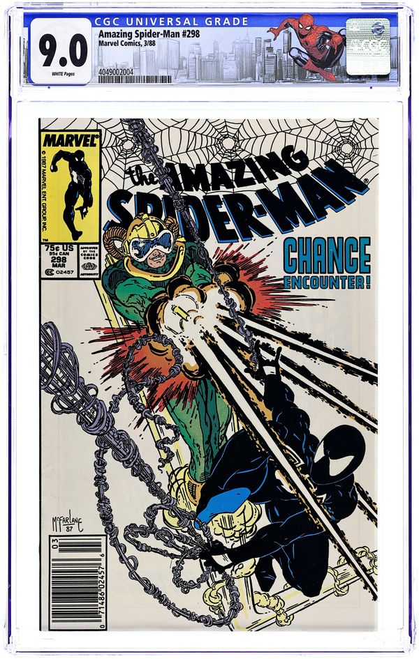 Ends Feb 16 7:17 PM CST Bid History 9 bids Current Bid $561 Your Secret Max Bid If you'd like to bid, please log in or register. Direct Edition. Giant-sized 25th anniversary issue. First full appearance of Venom in "Venom!", script by David Michelinie, art by Todd McFarlane; Spidey's old alien costume has merged with reporter Eddie Brock who thinks his career was ruined by Spider-Man and the symbiote of the two, Venom, takes on the web slinger; At MJ's request, Spidey returns to the blue and red costume as she now finds his black duds way too creepy; This is the last issue in which Spider-Man appears in his black costume; Thing (of the Fantastic Four) cameo.. Stan's Soapbox Special in place of letters page: Full page editorial by Stan on the occasion of Spider-Man's 300th issue. 52 pgs., full color. Cover price $1.50.