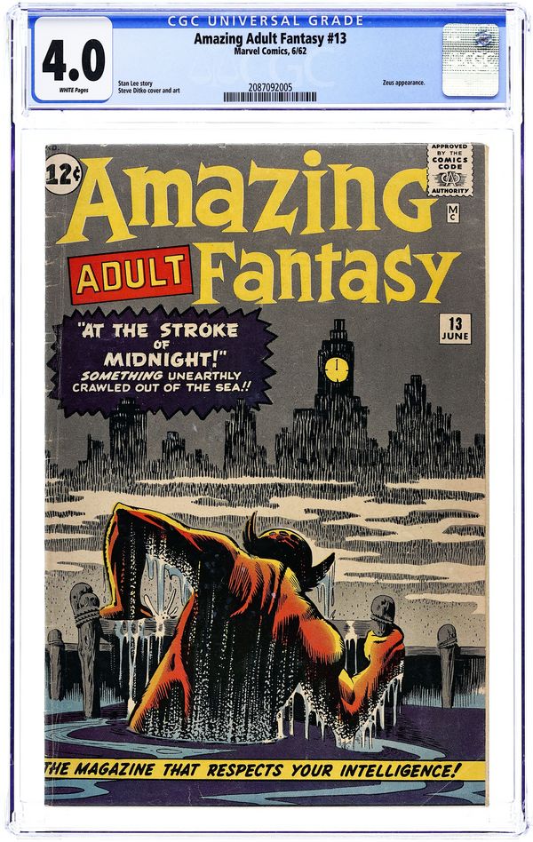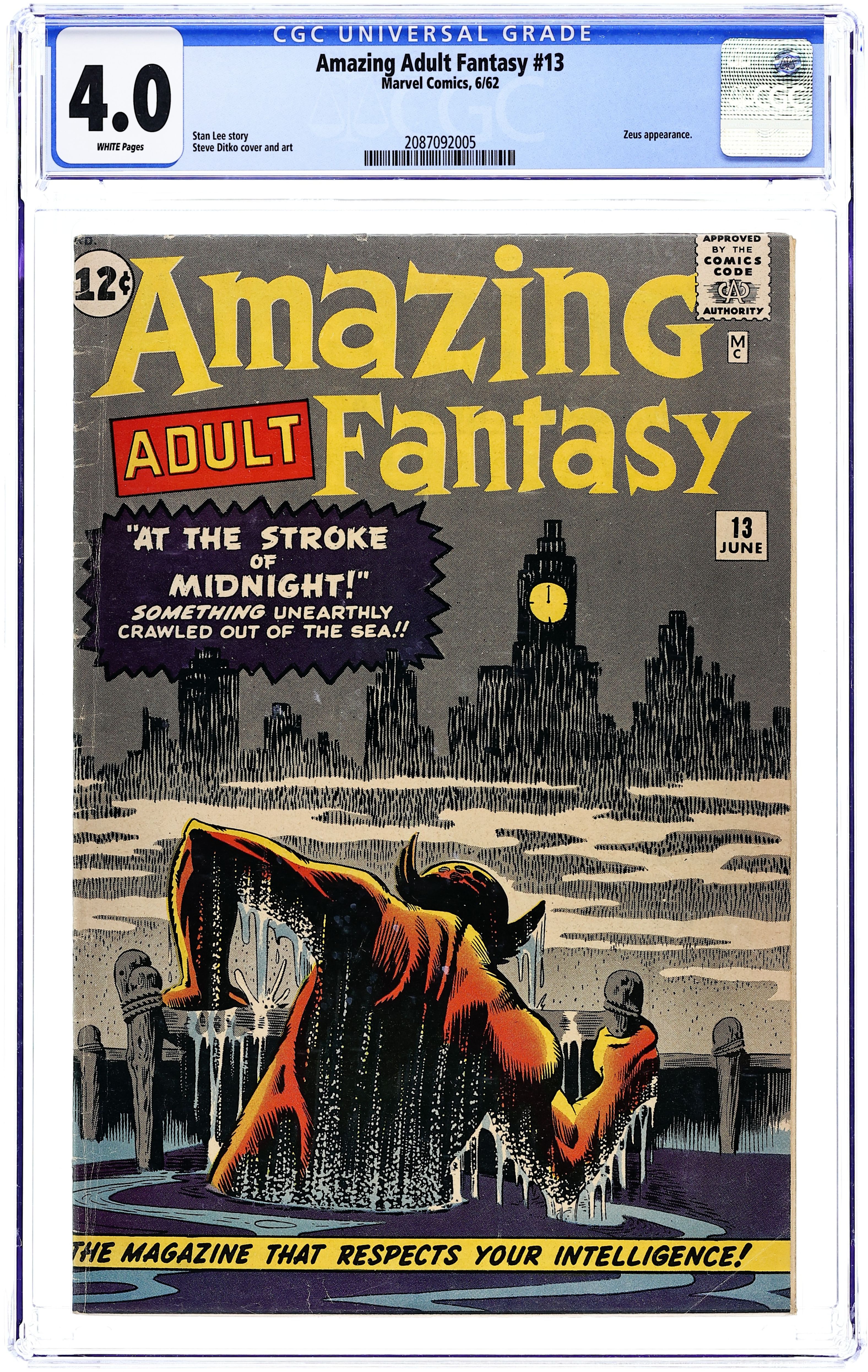 1st Printing. Cover art by Steve Ditko. The Unsuspecting; Shape-shifting aliens invade Earth, taking the form of TV sets in order to influence people's thinking. Great Zeus; Zeus decides to leave Mt. Olympus and return to Earth, but when he arrives, far from his lightning bolts intimidating mortals, they find him a source of entertainment and want to book him as an act. The Little Gypsy Tea Room; A criminal forces a gypsy to hide him from the police, but gets more than he bargained for when she does help him. The Ultimate Weapon. At the Stroke of Midnight! All scripts by Stan Lee, all art by Steve Ditko. 36 pgs. $0.10. NOTE: 1994 JC Penney reprint exists. Can be identified by having a Stridex ad on the back cover. Cover price $0.12.