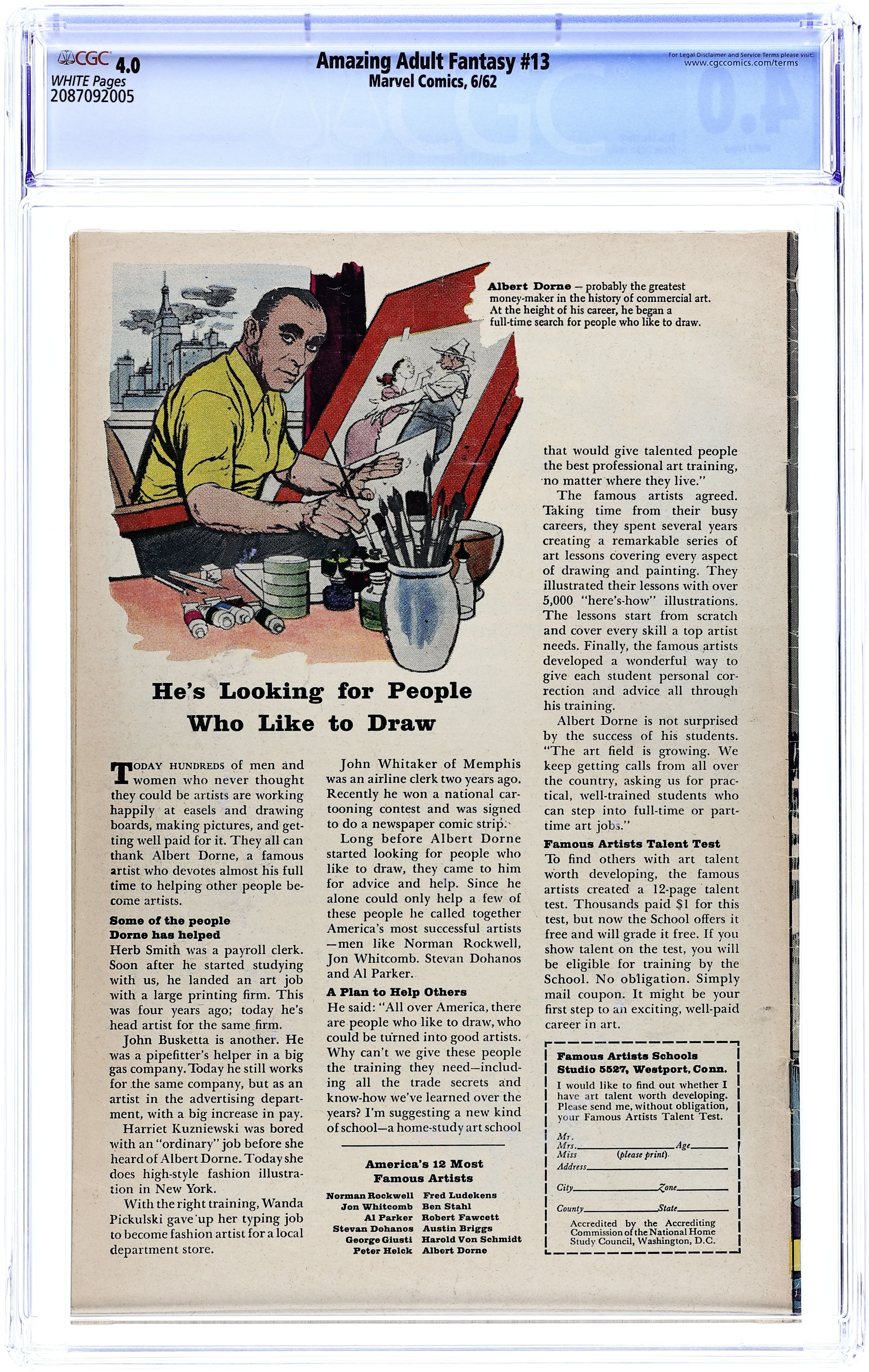 Cover pencils by Jack Kirby, inks by Sol Brodsky. 2nd appearance of Dr. Droom (1st Marvel Age Super-Hero) in The World Below!, script by Stan Lee, pencils by Jack Kirby, inks by Dick Ayers; Dr. Droom defeats an attempt by Atlantis to conquer the surface world. I Led the Strange Search for Manoo!, script by Larry Lieber, pencils by Jack Kirby, inks by Dick Ayers; A college student aids an alien policeman hunt down an alien criminal hiding on earth, or is it the other way around? The Comic text story. Rocky's Last Ride, script by Stan Lee, art by Steve Ditko; Chisler Rocky gets a deal thats too good to be true, when a customer just "gives" him his car. 36 pgs. $0.10. Cover price $0.10.