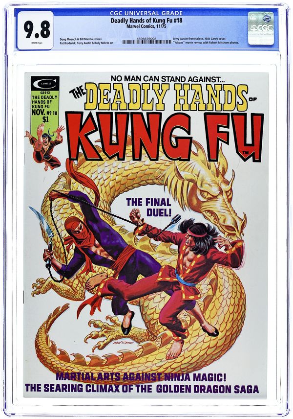 Stan Lee Presents: The Deadly Hands of Kung Fu. Cover by Nick Cardy. Includes: "Enter the Letters!" A letters page with readers' thoughts on previous issues. "Re-Enter the Editor." An editorial by Archie Goodwin. Shang Chi, the Master of Kung Fu, stars in "Secret of the Dragon!" Story by Doug Moench. Art by Rudy Nebres. "The Yakuza a Sword to the Mind!" An article by Don McGregor. "Michi: Spirit of the Sword!" A photographed lesson in the use of the sword, text and photos by Valerie Eads. Iron Fist stars in "Fists of Darkness, Fists of Death!" Guest-starring the Sons of the Tiger. Story by Bill Mantlo. Art by Pat Broderick and Terry Austin. Black and white. Cover price $1.00.