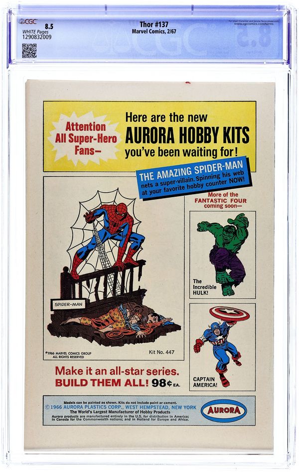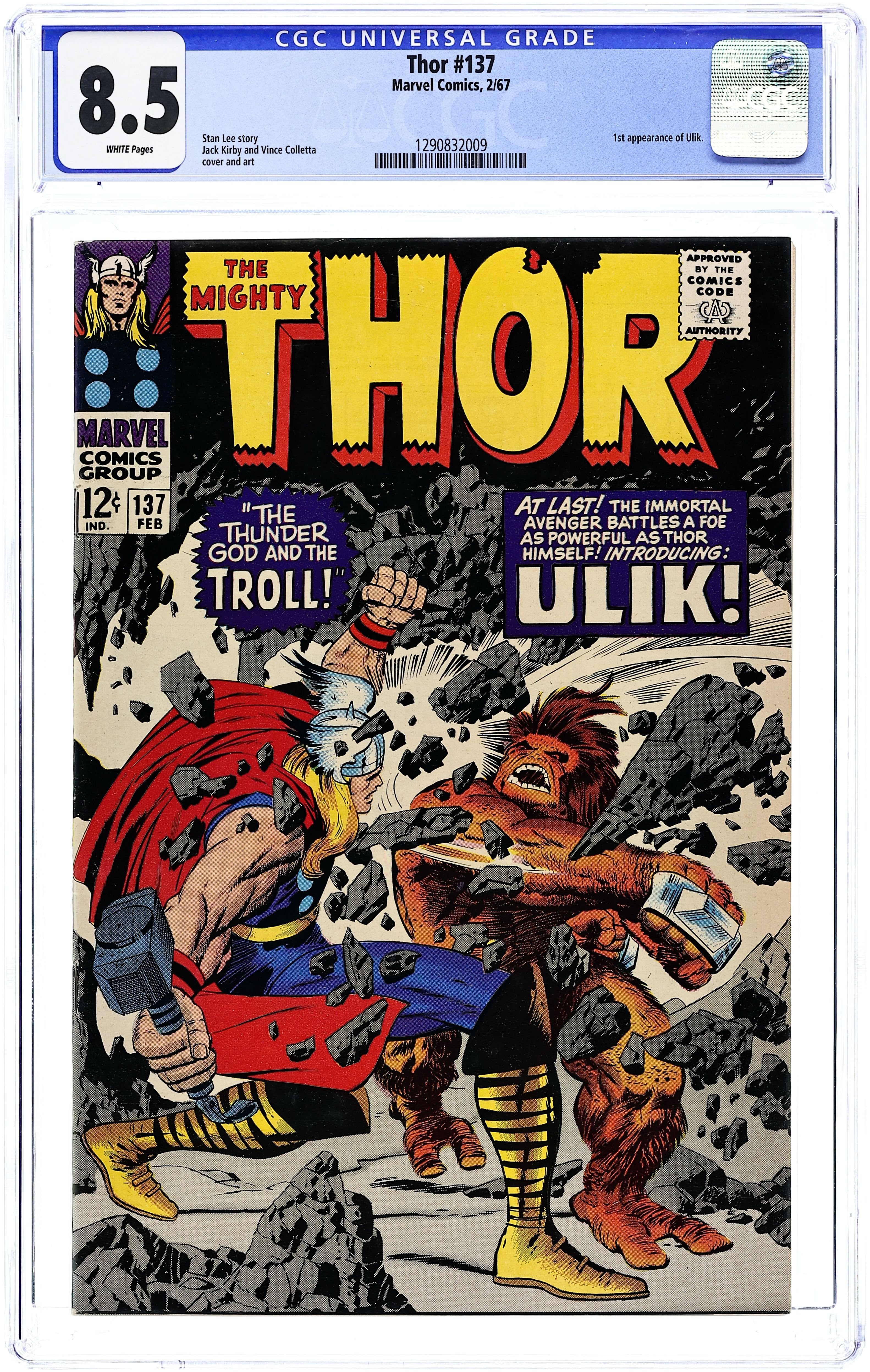 Cover pencils by Jack Kirby, inks by Vince Colletta. First appearance of Ulik of the Rock Trolls in "The Thunder God and the Troll!"; Geirrodur's trolls capture Sif and lure Thor after her; Thor must battle Ulik, mightiest of the Rock Trolls. Tale of Asgard: "The Tragedy of Hogun!", script by Stan Lee, pencils by Jack Kirby, inks by Vince Colletta; Thor and his companions find the dying Saguta who is a countryman of Hogun's; Hogun swears vengeance on Mogul, lord of the Mystic Mountain, who did this. 36 pgs., full color. $0.12. Cover price $0.12.