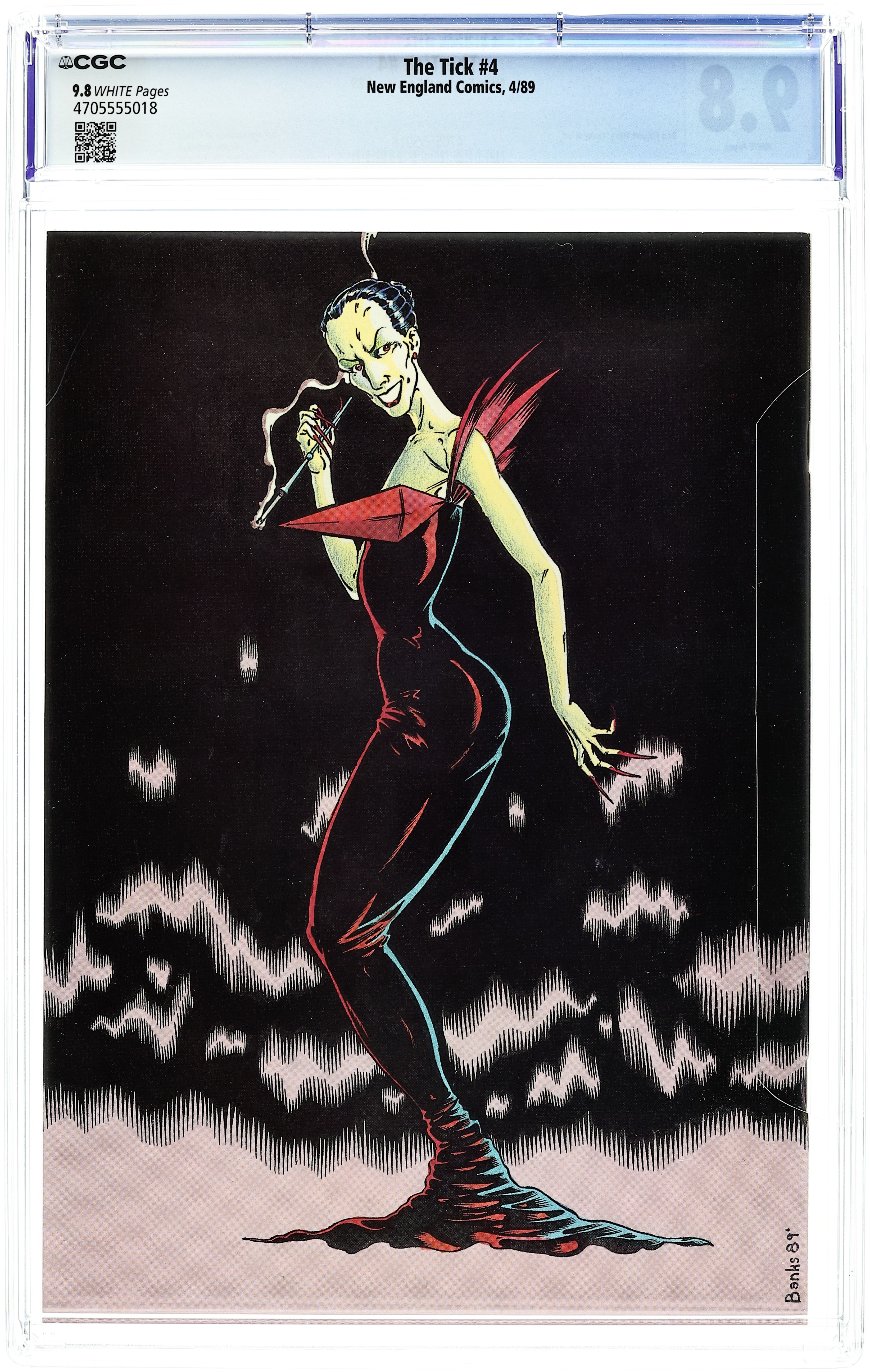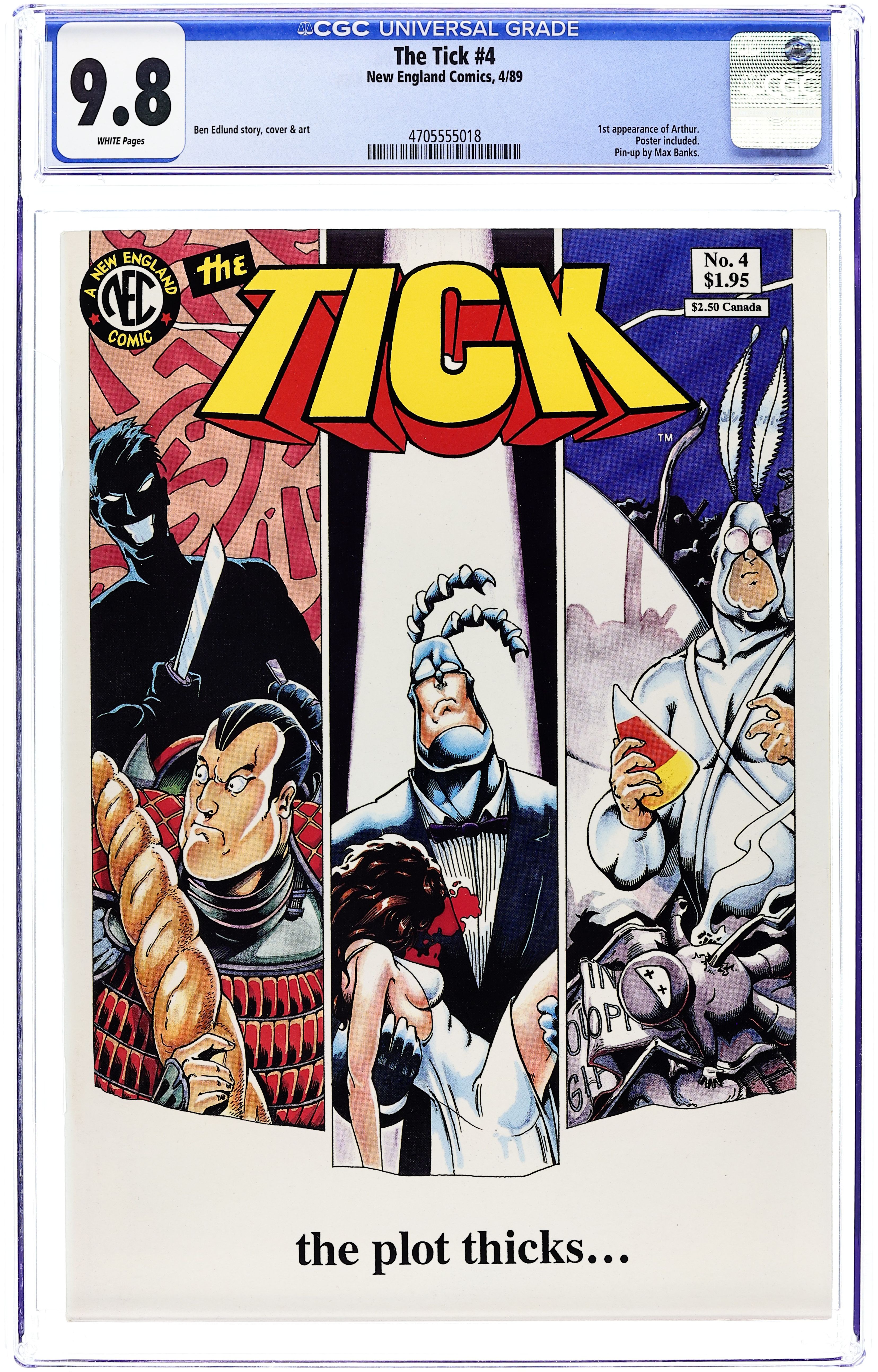 First printing. NOTE: This is a 1st Printing. 1st printings do not have a 2nd or later printing notice in indica. Written by Ben Edlund. Art and cover by Ben Edlund and Max Banks. 1st appearance of Paul The Samurai. Tick and Oedipus are attacked at her parents' dinner party by a group of ninjas. After Oedipus is injured, Tick has a crisis of sanity and decides the best thing to do is destroy Ninja World. Which he does. Conflict ensues over the Thorn of Destiny and Tick comes close to losing it until Arthur shows up to make sense of a few things. Paul the Samurai trails his enemy Sagin from Japan and prepares to take him down with a loaf of deadly French bread. Centerfold poster of an interior splash page.44 pgs., B&W. $1.95. Cover price $1.95.