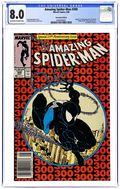 Newsstand Edition. Giant-sized 25th anniversary issue. First full appearance of Venom in "Venom!", script by David Michelinie, art by Todd McFarlane; Spidey's old alien costume has merged with reporter Eddie Brock who thinks his career was ruined by Spider-Man and the symbiote of the two, Venom, takes on the web slinger; At MJ's request, Spidey returns to the blue and red costume as she now finds his black duds way too creepy; This is the last issue in which Spider-Man appears in his black costume; Thing (of the Fantastic Four) cameo.. Stan's Soapbox Special in place of letters page: Full page editorial by Stan on the occasion of Spider-Man's 300th issue. 52 pgs., full color. Cover price $1.50.