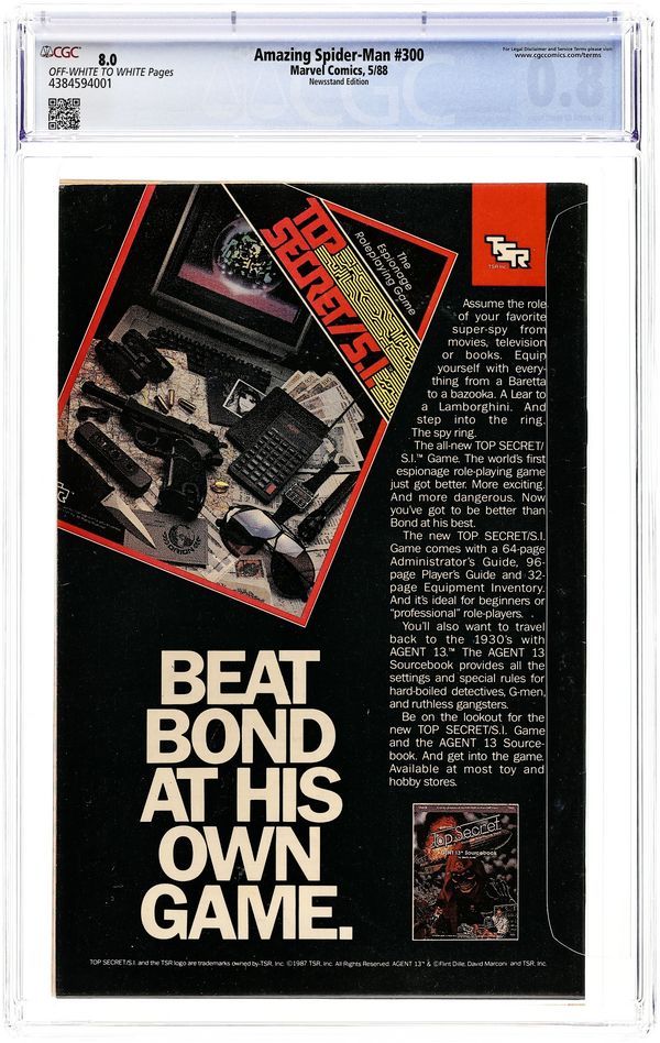 Direct Edition. Giant-sized 25th anniversary issue. First full appearance of Venom in "Venom!", script by David Michelinie, art by Todd McFarlane; Spidey's old alien costume has merged with reporter Eddie Brock who thinks his career was ruined by Spider-Man and the symbiote of the two, Venom, takes on the web slinger; At MJ's request, Spidey returns to the blue and red costume as she now finds his black duds way too creepy; This is the last issue in which Spider-Man appears in his black costume; Thing (of the Fantastic Four) cameo.. Stan's Soapbox Special in place of letters page: Full page editorial by Stan on the occasion of Spider-Man's 300th issue. 52 pgs., full color. Cover price $1.50.