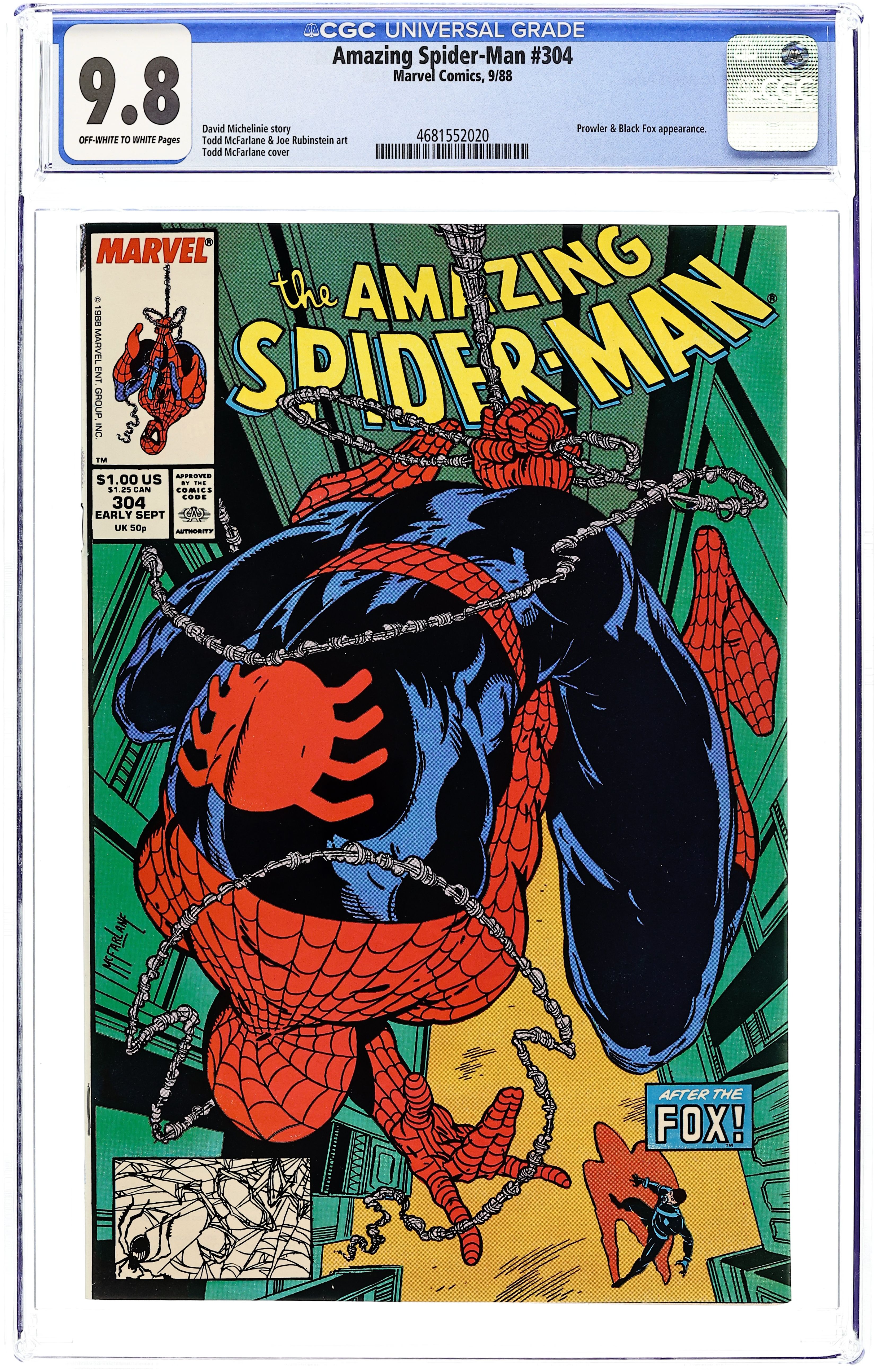 Ends Feb 16 7:18 PM CST Bid History 5 bids Current Bid $16 Your Secret Max Bid If you'd like to bid, please log in or register. Newsstand Edition. "California Schemin'!" Part 1 of 2. Script by David Michelinie. Pencils by Todd McFarlane. Finishes by Joe Rubinstein. Cover by Todd McFarlane. The Daily Bugle publishes a book featuring Peter Parker's best photos of Spider-Man! And now the Bugle's ace photographer and Mary Jane are on their way to Los Angeles for the publicity tour! It should be all fun in the sun in the city of angels! But Peter's first promotional event at the L.A. civic center hits a snag when an old acquaintance shows up: the Black Fox! The wily fox steals a priceless chalice and the chase is on! Is the web-slinger ready for his Hollywood debut? Cameo appearances by Aunt May, J. Jonah Jameson, and the Prowler. First appearance of Jonathan Caesar. (Notes: The Black Fox previously appeared in Web of Spider-Man 15. The Amazing Spider-Man title was published bi-monthly for the next 5 issues.) 36 pgs. Cover price $1.00.