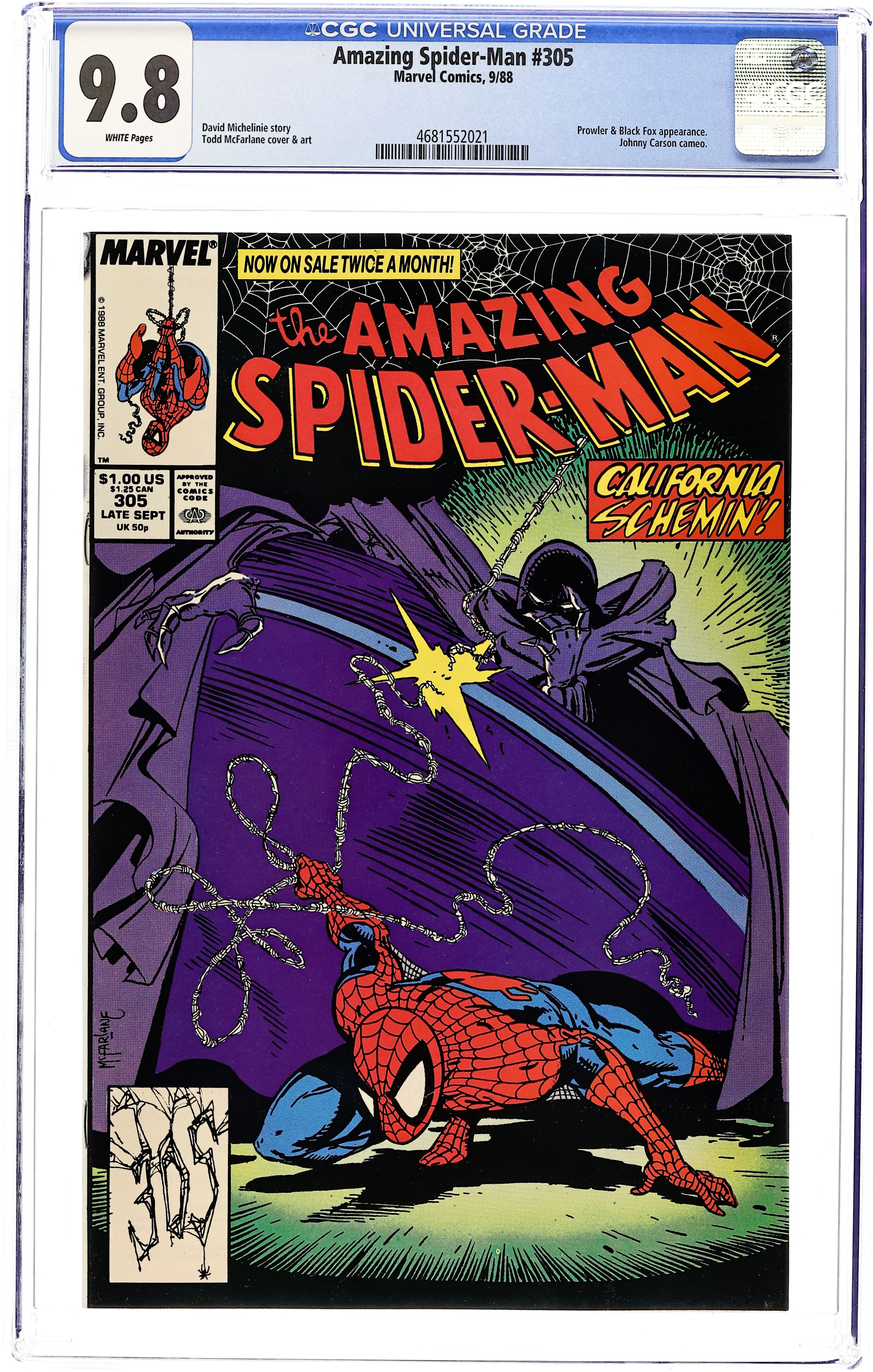Newsstand Edition. "California Schemin'!" Part 1 of 2. Script by David Michelinie. Pencils by Todd McFarlane. Finishes by Joe Rubinstein. Cover by Todd McFarlane. The Daily Bugle publishes a book featuring Peter Parker's best photos of Spider-Man! And now the Bugle's ace photographer and Mary Jane are on their way to Los Angeles for the publicity tour! It should be all fun in the sun in the city of angels! But Peter's first promotional event at the L.A. civic center hits a snag when an old acquaintance shows up: the Black Fox! The wily fox steals a priceless chalice and the chase is on! Is the web-slinger ready for his Hollywood debut? Cameo appearances by Aunt May, J. Jonah Jameson, and the Prowler. First appearance of Jonathan Caesar. (Notes: The Black Fox previously appeared in Web of Spider-Man 15. The Amazing Spider-Man title was published bi-monthly for the next 5 issues.) 36 pgs. Cover price $1.00.