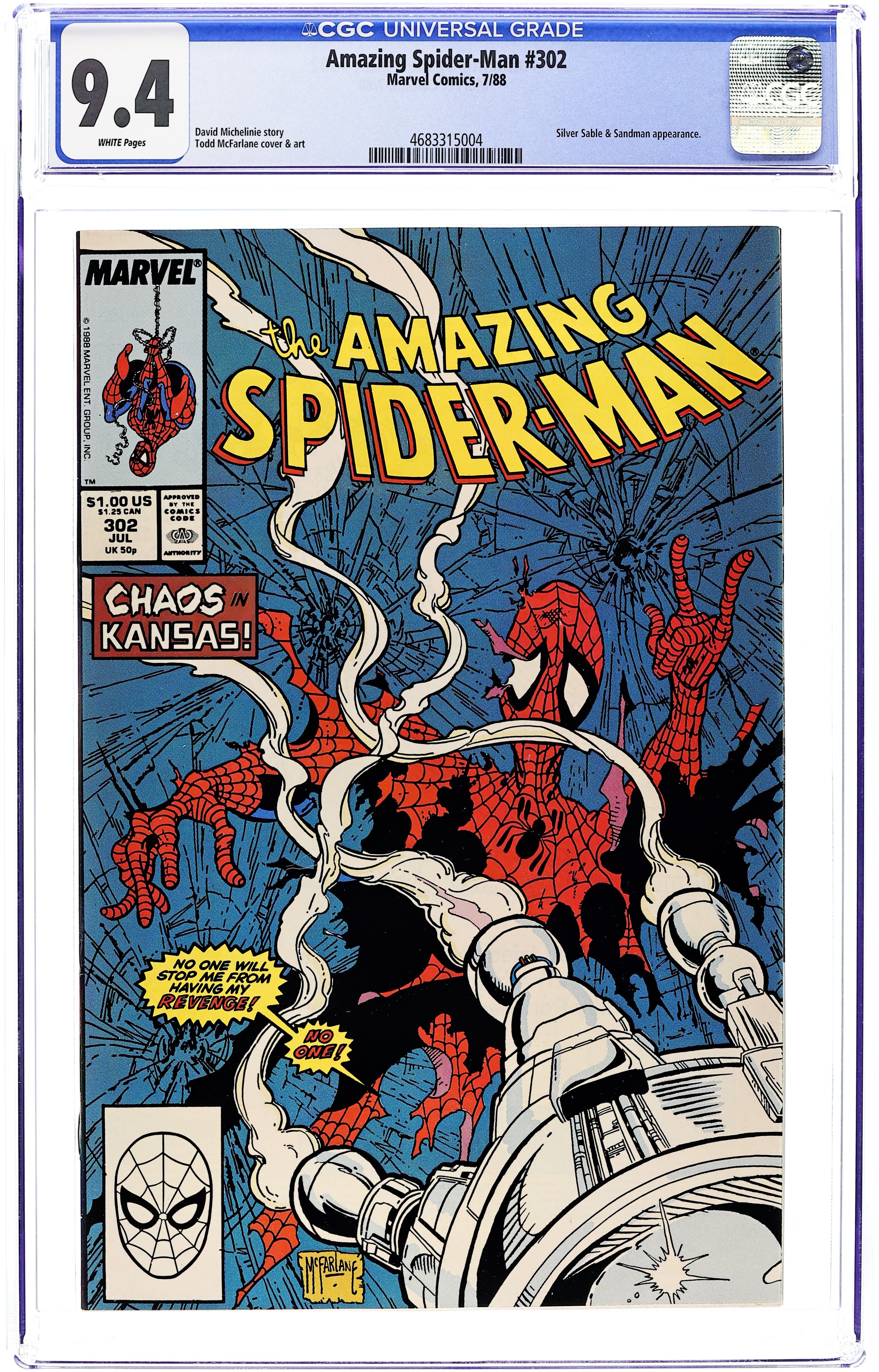 Newsstand Edition. "Dock Savage!" Guest-starring Silver Sable. Script by David Michelinie. Art by Todd McFarlane. Cover by Todd McFarlane. While trying to make up his mind about the research company's job offer in Kansas, the wondrous wall-crawler receives another employment offer! However, this one is from Silver Sable and requires brawn not brains! The Symkarian mercenary wants Spider-Man to team up with the Sandman to take down a neo-nazi and his private army! The web-slinger quickly accepts sable's offer and swings into action! As for the other offer, your friendly neighborhood Spider-Man has to talk to his wife first! Cameo appearances by Mary Jane Watson and J. Jonah Jameson. (Notes: Beginning with this issue, Todd McFarlane produces small drawings in the UPC box on the front cover. These sketches only appear on the cover of the direct sales issues. The newsstand editions have the regular bar code.) 36 pgs. Cover price $1.00.