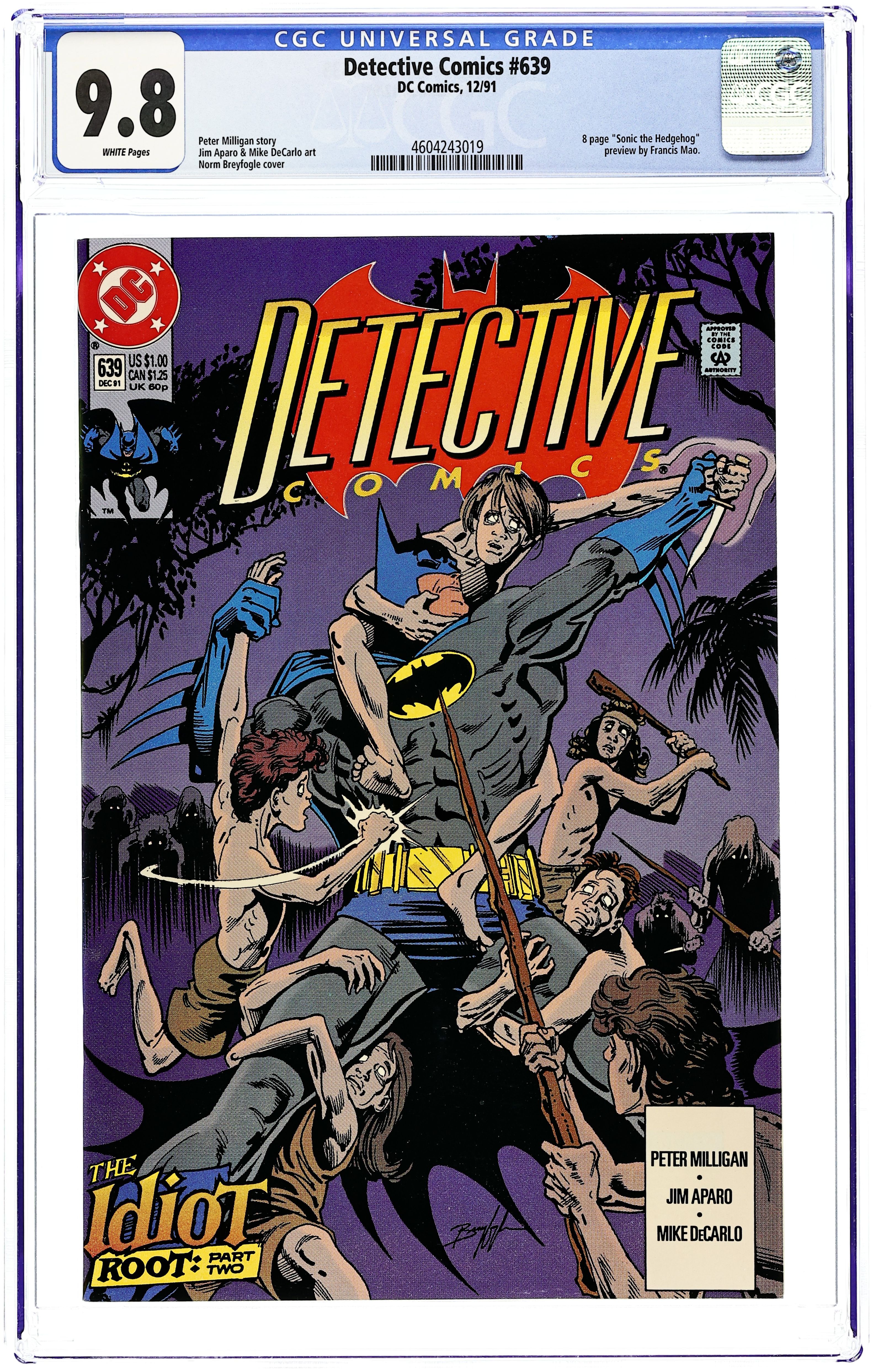 "The Idiot!" Part 2 of 4. Story by Peter Milligan. Art by Jim Aparo and Mike DeCarlo. Cover by Norm Breyfogle. Story continued from Batman (1940) #472, and continues in Batman (1940) #473. Batman travels to an abandoned temple in the heart of the Amazon to confront the Idiot, the master of unreality. Plus: 16-page Sonic the Hedgehog insert advertisement comic with story and art by Francis Mao. 52 pgs. Cover price $1.00.