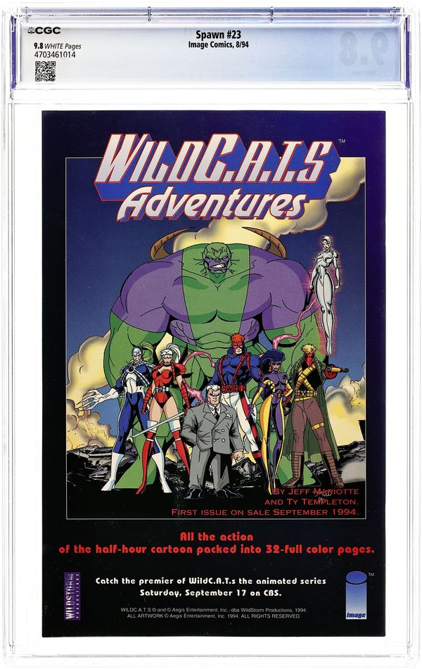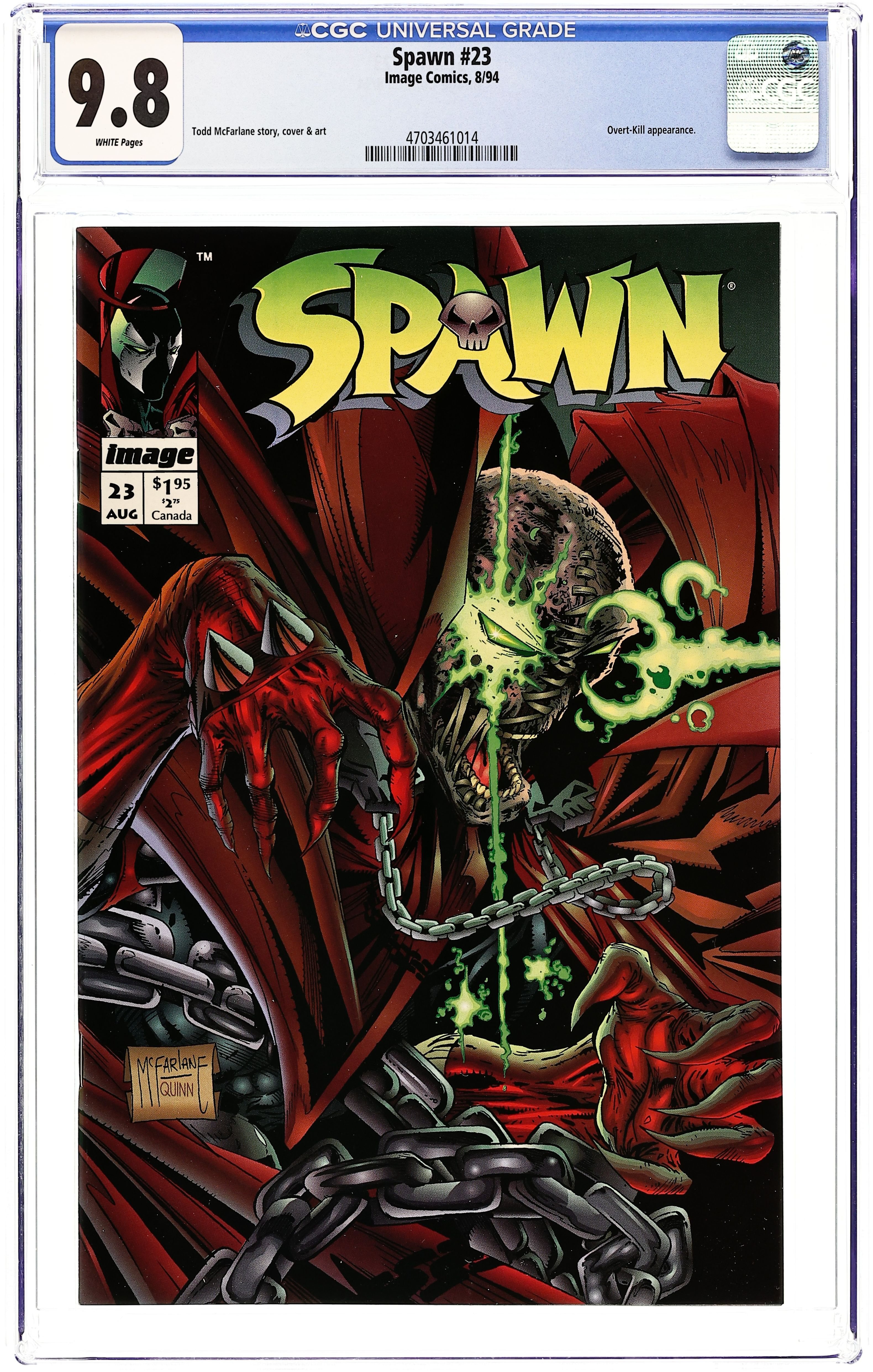 Newsstand Edition (has bar code on cover). "Protector!" Story by Todd McFarlane. Art by Todd McFarlane and Greg Capullo. Tired of all the psychos who keep attacking him and the denizens of his alleys, Spawn decides to make a haunting example of the latest creep to try and kill him. Plus, Spawn comes face-to-face with Wanda. Includes 2 pin-ups of Angela. Cover price $1.95.