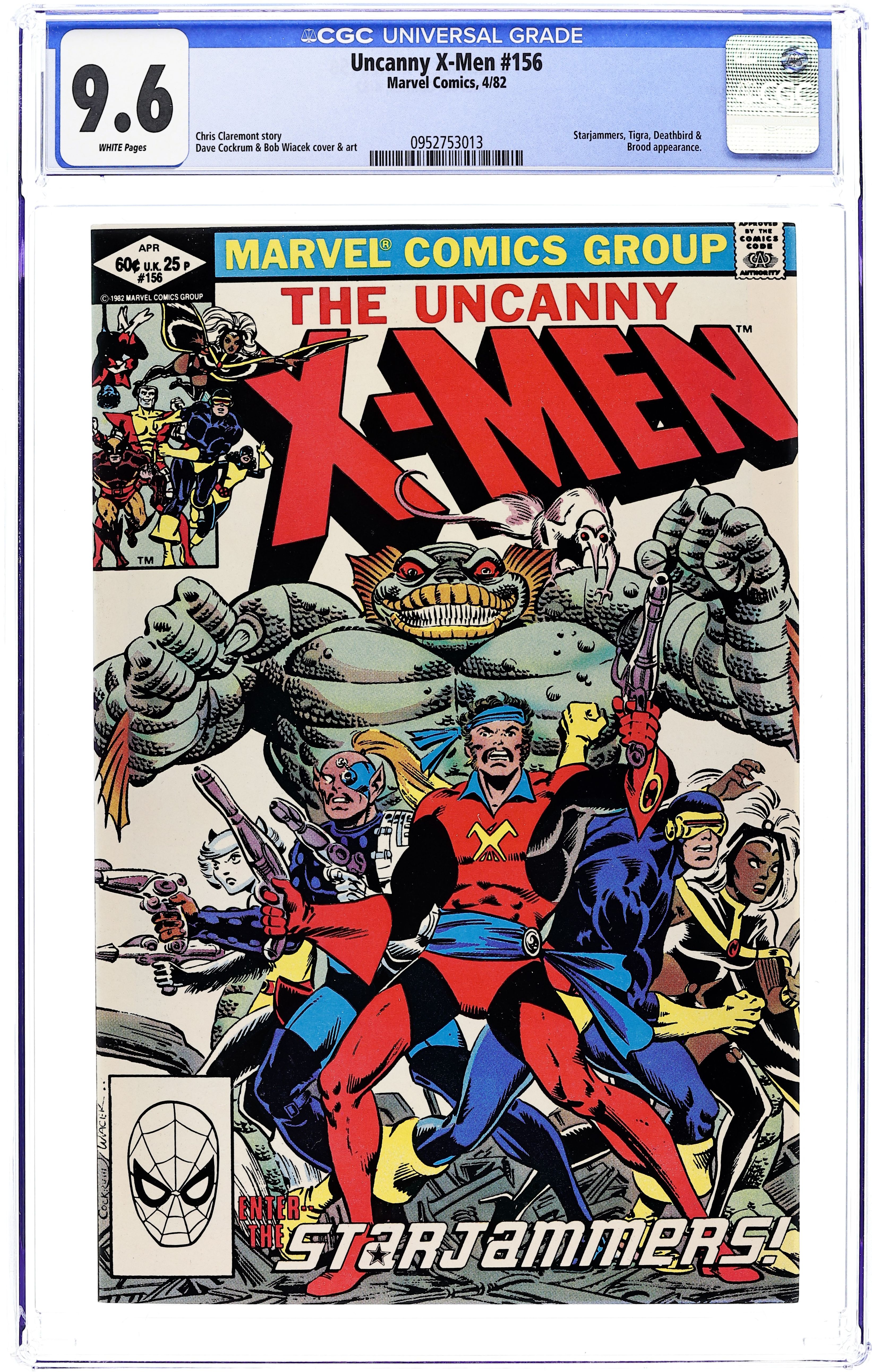Direct Edition. "Pursuit!" Part 3 of 4. Guest-starring the Starjammers and Tigra. Story by Chris Claremont. Art by Dave Cockrum and Bob Wiacek. The Professor has been taken captive, Colossus has been mortally wounded, and the Earth is running out of time. The hard-luck heroes the X-Men team-up with the space-pirates the Starjammers to pursue their adversaries - the Shi'ar renegade Deathbird and the sinister Brood - to the far reaches of the space itself. Plus, the origin of Cyclops' father, Corsair, is revealed. 36 pgs. Cover price $0.60.