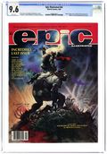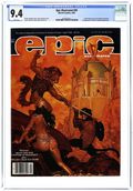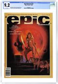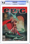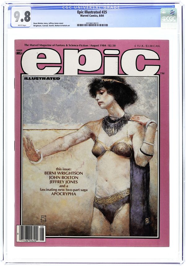 Cover by Paul Gulacy. Written by Roy Thomas, Jim Starlin, Archie Goodwin, Doug Moench, Dennis O'Neil, Mike W. Barr, Robert Wakelin, Paul Kirchner and Bruce Jones. Art by P. Craig Russell, Jim Starlin, George Bush, Paul Gulacy, Tim Conrad, Terry Lindall, Michael Golden, Robert Wakelin, Paul Kirchner and Michael Saenz. Epic Illustrated was touted as a new experience in adult fantasy and science fiction adventure. Published by Marvel Comics, this magazine was aimed at a more mature audience. In this issue: Elric of Melnibone in "The Dreaming City (Part 1)" (Michael Moorcock adaptation) by Roy Thomas and P. Craig Russell; "Vanth (Metamorphosis Odyssey Chapter V)" by Jim Starlin; "Forest Magic" (illustrated text story) by Archie Goodwin and George Bush; "Libido" by Doug Moench and Paul Gulacy; Almuric in "Episode Two" (Robert E. Howard adaptation) by Roy Thomas and Tim Conrad; "The Worker in the City" by Goodwin and Terry Lindall; "The Gamesmen of Earth Prime" (illustrated text story) by Dennis O'Neil, Mike W. Barr and Michael Golden; "The Meeting (Metamorphosis Odyssey Chapter VI)" by Starlin; "A Midsummer Nights Dream" by Robert Wakelin; "My Room" by Paul Kirchner; and "Tomb Stones" by Bruce Jones and Michael Saenz. Magazine, 96 pages, PC/PB&W. Cover price $2.00.