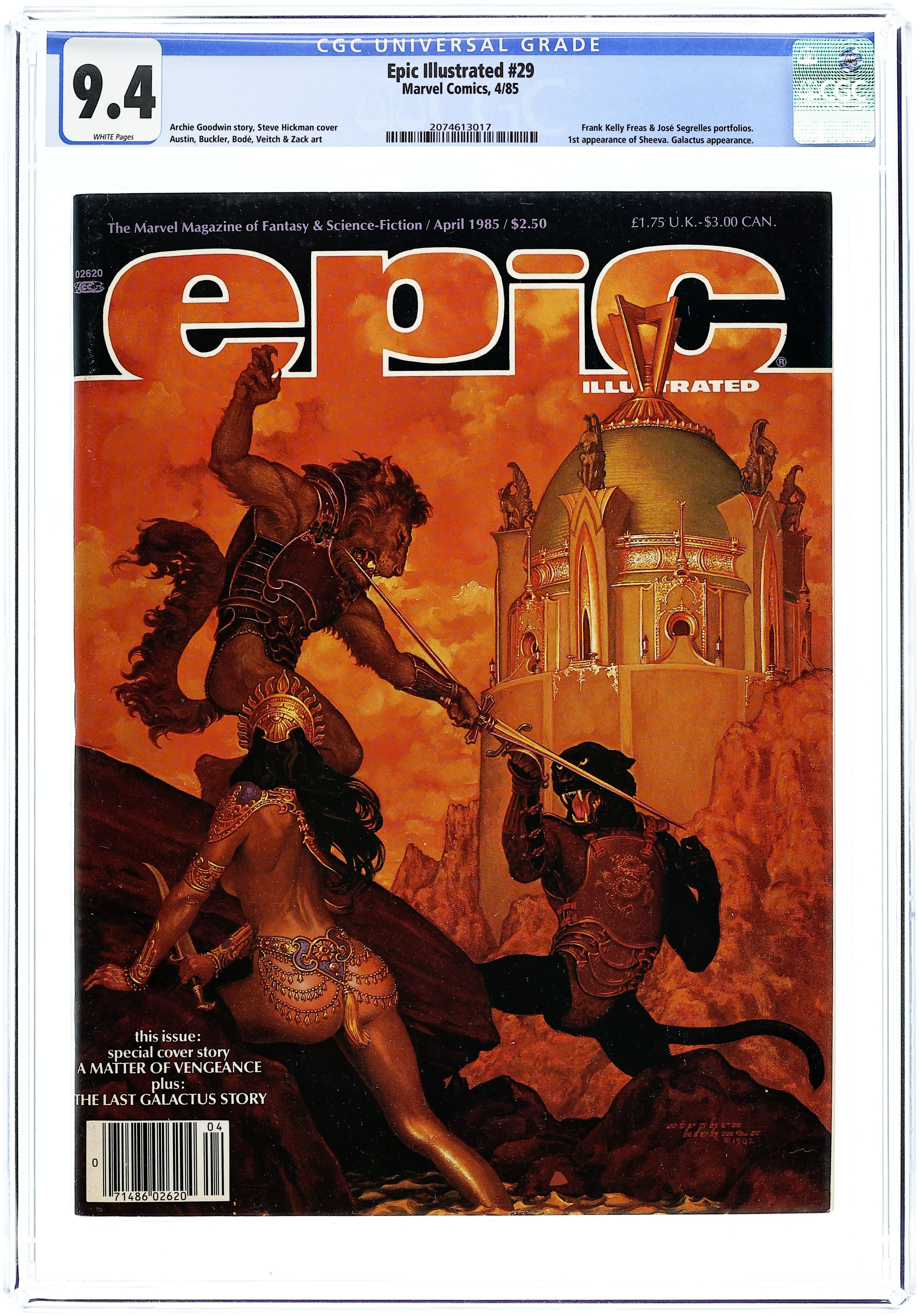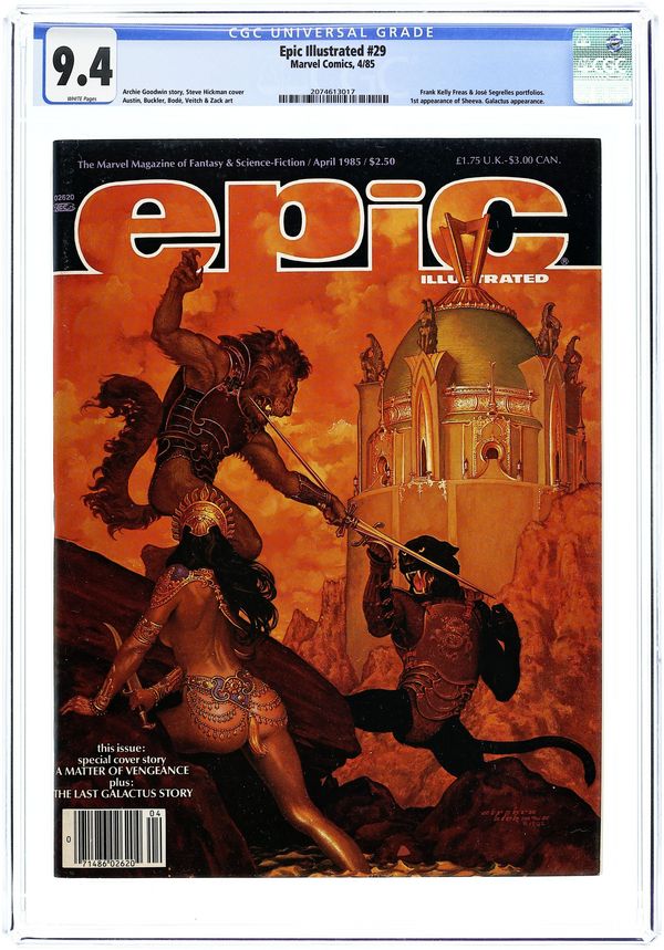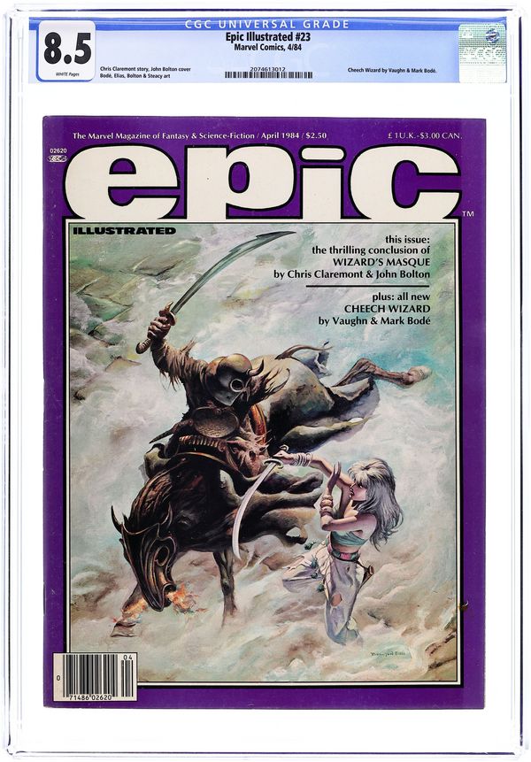 Cover art by Stephen Hickman. Night Run, script and art by Kent Williams. The Rhyming Robot (Chapter Four)--The Last Galactus Story, script and pencils by John Byrne, inks by Terry Austin. The Art of Jose Segrelles. Rider, script by Archie Goodwin, art by Jonn Zack. Frank Kelly Freas' A Separate Star article by Jo Duffy. Knock Knock, script and art by Phil Hale. In Search of Ancient Myths starring Dr. Watchstop, script and art by Ken Macklin. Mediaview article by Dennis O'Neil. Ghosts in the Machine, script and art by Rick Veitch. The Apes of a Cold God, script and art by Zoran Vanjaka. Cobalt- 60 story, script by Larry Todd, art by Mark Bode. A Matter of Vengeance, script by Archie Goodwin, art by Rich Buckler. Little Otis's 5 Cent Ride, script and art by John Lakey and Laura Lakey. 100 pgs. April, 1985. $2.50. Cover price $2.50.