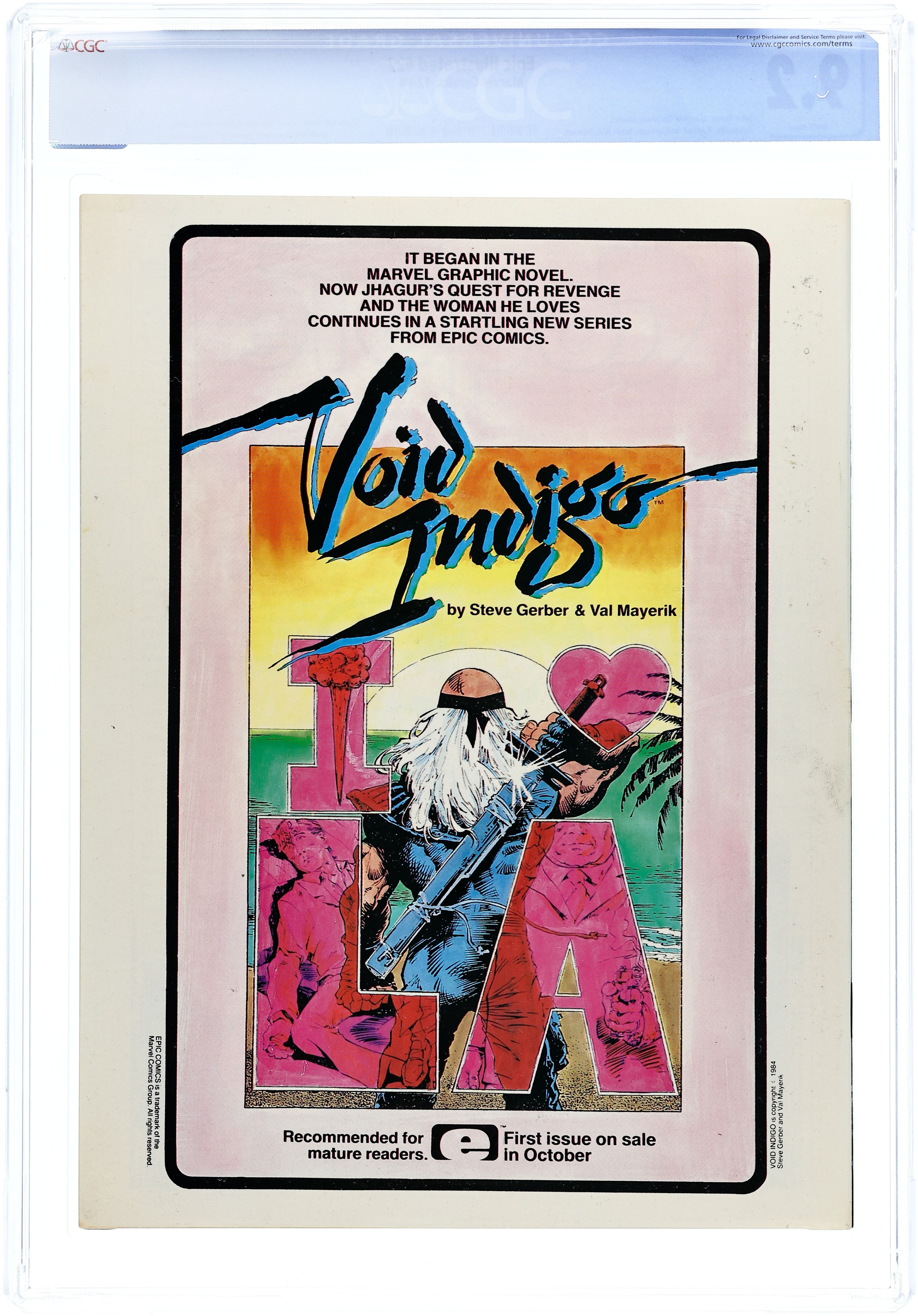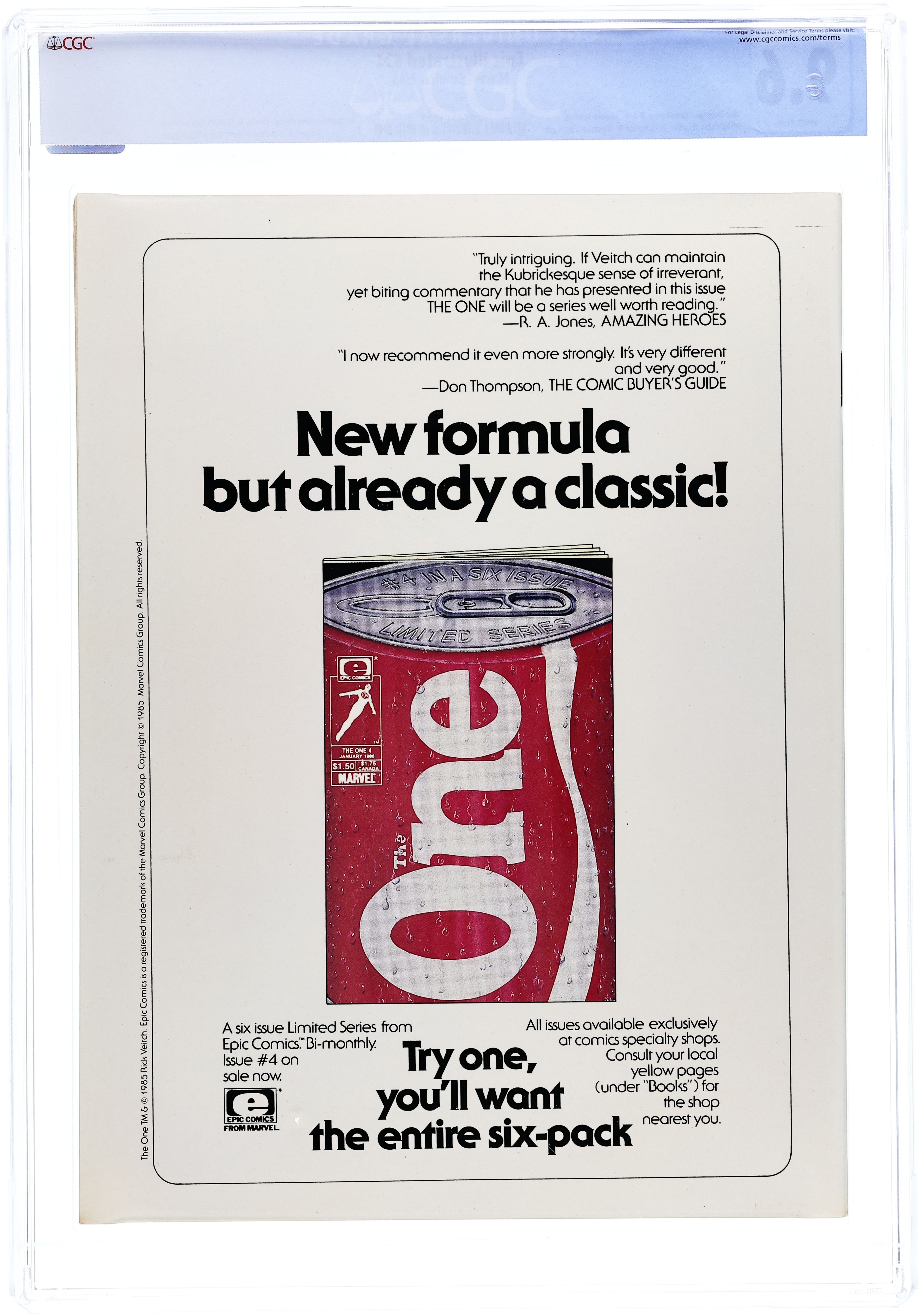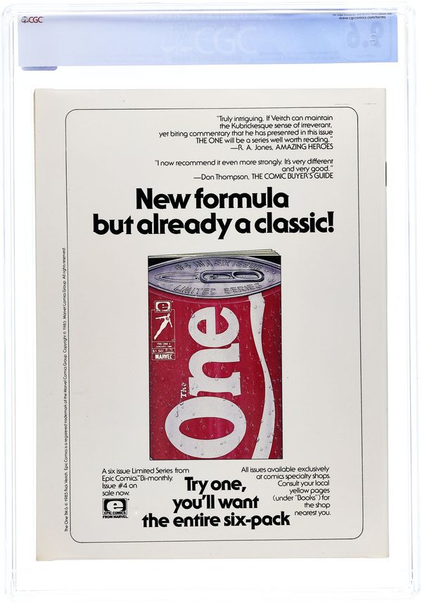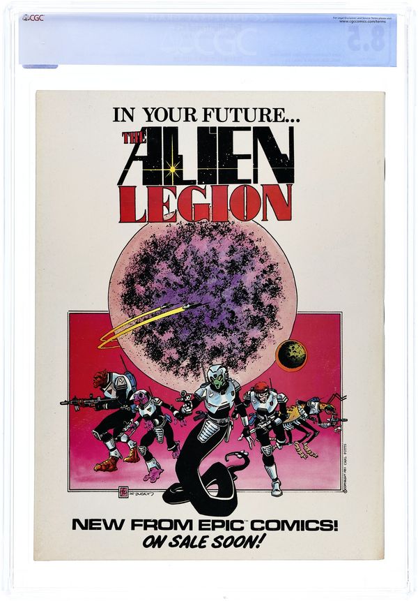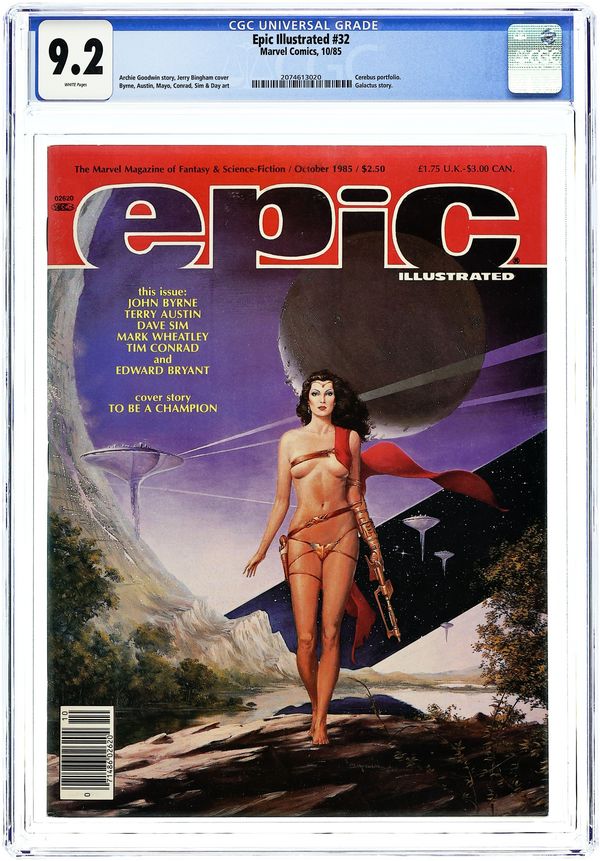 Cover art by Berni Wrightson. The End of the Earth (Chapter Five) (Table of Contents)--The Last Galactus Story, script and pencils by John Byrne, inks by Terry Austin. Selling Insurance starring Cerebus, script by Dave Sim, pencils by Dave Sim and Gerhard (backgrounds), inks by Dave Sim and Gerhard. The Girl Next Door starring Cerebus, script by Dave Sim, pencils by Dave Sim and Gerhard (backgrounds), inks by Dave Sim and Gerhard. Infinity: Where Rock and Fantasy Art Meet article, art by Glenn Pepple, Anita Barbour, Daina Graziunas, Jim Starlin, Berni Wrightson, Jeffrey Jones, Alin Wilson, Jon Jay Muth, Dan Green, and Alex Bialy. Cobalt- 60 story, script by Larry Todd, art by Mark Bode. Unicorn Autumn text story by Archie Goodwin, art by Alix Berenzy. Mediaview article by Dennis O'Neil. The Sign, script by Jo Duffy, pencils by Kent Williams. An Epic History featuring Dreadstar article by James P. Starlin. Raven Banner Marvel Graphic Novel Preview, script by Alan Zelenetz, art by Charles Vess. Journey to Outer Earth, script and art by Rick Geary. Toadswart story, script and art by Tim Conrad. The Fix, script and art by Pepe Moreno. 100 pgs. June, 1985. $2.50. Cover price $2.50.