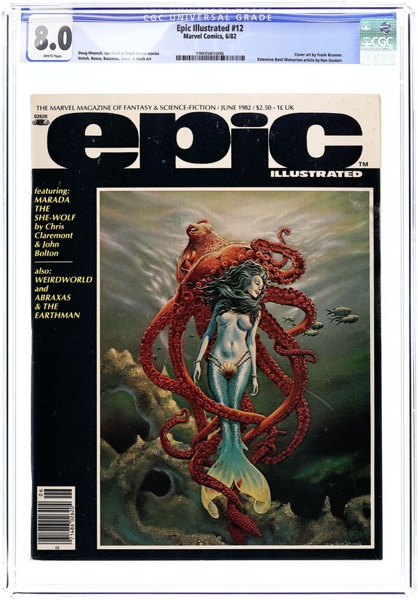 Cover art by Richard Corben. Almuric, script by Roy Thomas, art by Tim Conrad; Robert E. Howard adaptation. Hope's End poem by Marv Wolfman, art by Daina Graziunas. Monkey See, script by Steve Bissette and Rick Veitch (plot), art by Steve Bissette and Rick Veitch. Fantasy and the Fantastic in European Comics article. Whis'par (Metamorphosis Odyssey Chapter Chapter IV), script and art by James P. Starlin. Siegfried and the Dragon, script and art by P. Craig Russell; Richard Wagner adaptation. Interview with Glen A. Larson with art by Fred Hope and Dave Pelsu with black and white photographs. Sinner, script and art by Archie Goodwin. Seven Moons' Light Casts Complex Shadows, script by Samuel R. Delany, art by Howard Chaykin. Tarn's World, script by Archie Goodwin, art by Robert Wakelin. The True Game, script and art by Ernie Colon. 92 pgs. Summer, 1980. $2.00. Cover price $2.00.
