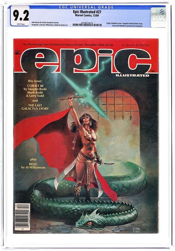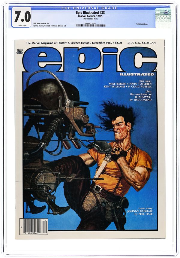 Epic Illustrated was touted as a new experience in adult fantasy and science fiction adventure. Published by Marvel Comics, this magazine was aimed at a more mature audience. Issue #7 includes: Holocaust by Neal Adams, Epus by Pepe Moreno, Metamorphosis Odyssey: Requiem & Nightfire by Jim Starlin, The Egg by Tim Caldwell and Jeff Potter, The Llehs by Graham Marks and John Bolton, U.F.O. by Tim Conrad, and The Comedy by Dean Motter. Also includes Barry Smith interview by Archie Goodwin. Cover art by Barry Smith. Cover price $2.00.