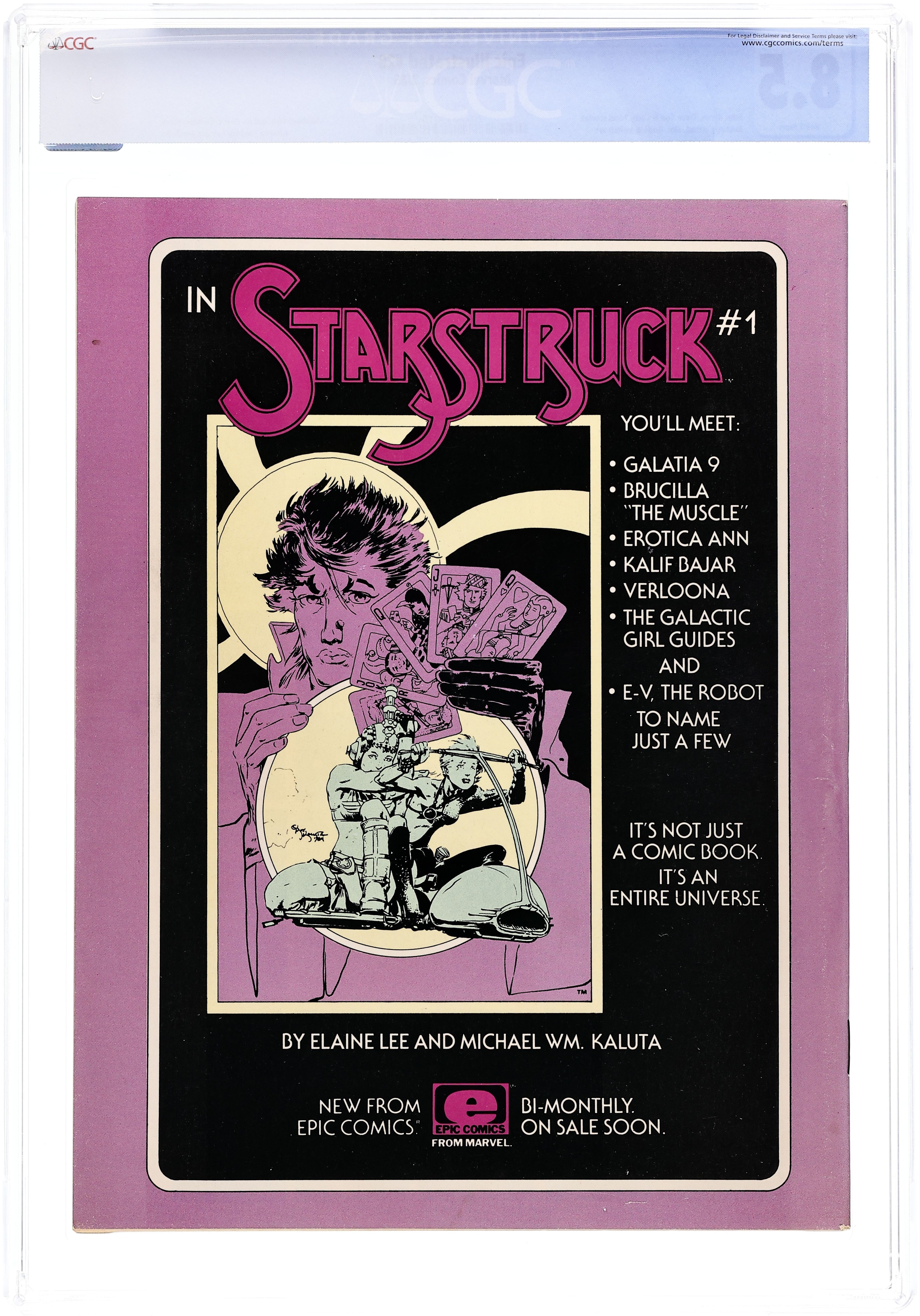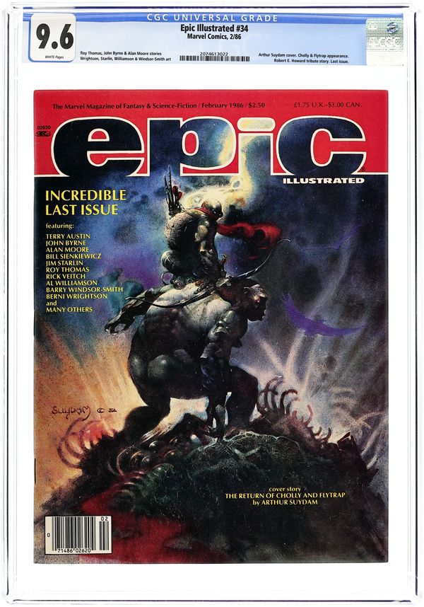 Final Issue; Cholly & Flytrap Cover by Arthur Suydam; "The Beast" by Paolo Eluteri Serpieri; "Love Doesn't Last Forever" by Alan Moore & Rick Veitch; "Works in Progress" by Barry Windsor-Smith; "Out of Phase" by Archie Goodwin & Al Williamson; "Doctor Watchstop: Wasting Time" by Ken Macklin; "The Last Galactus Story: Chapter Nine" by John Byrne (story & art), Terry Austin (inks) & Glynis Oliver (colors); "Horizon Lights" by Jo Duffy & T. Sagara; "They Just Fade Away" by Berni Wrightson; "The Return of Cholly & Flytrap" by Arthur Suydam; "Amber 1" by Jim Starlin; "Death of a Legend" a story of the final days of Robert E. Howard by Roy Thomas & S. Plunkett; "Slow Dancer" by Bill Sienkiewicz; Submissions from the Atlanta Fantasy Fair Competition; Cover price $2.50.