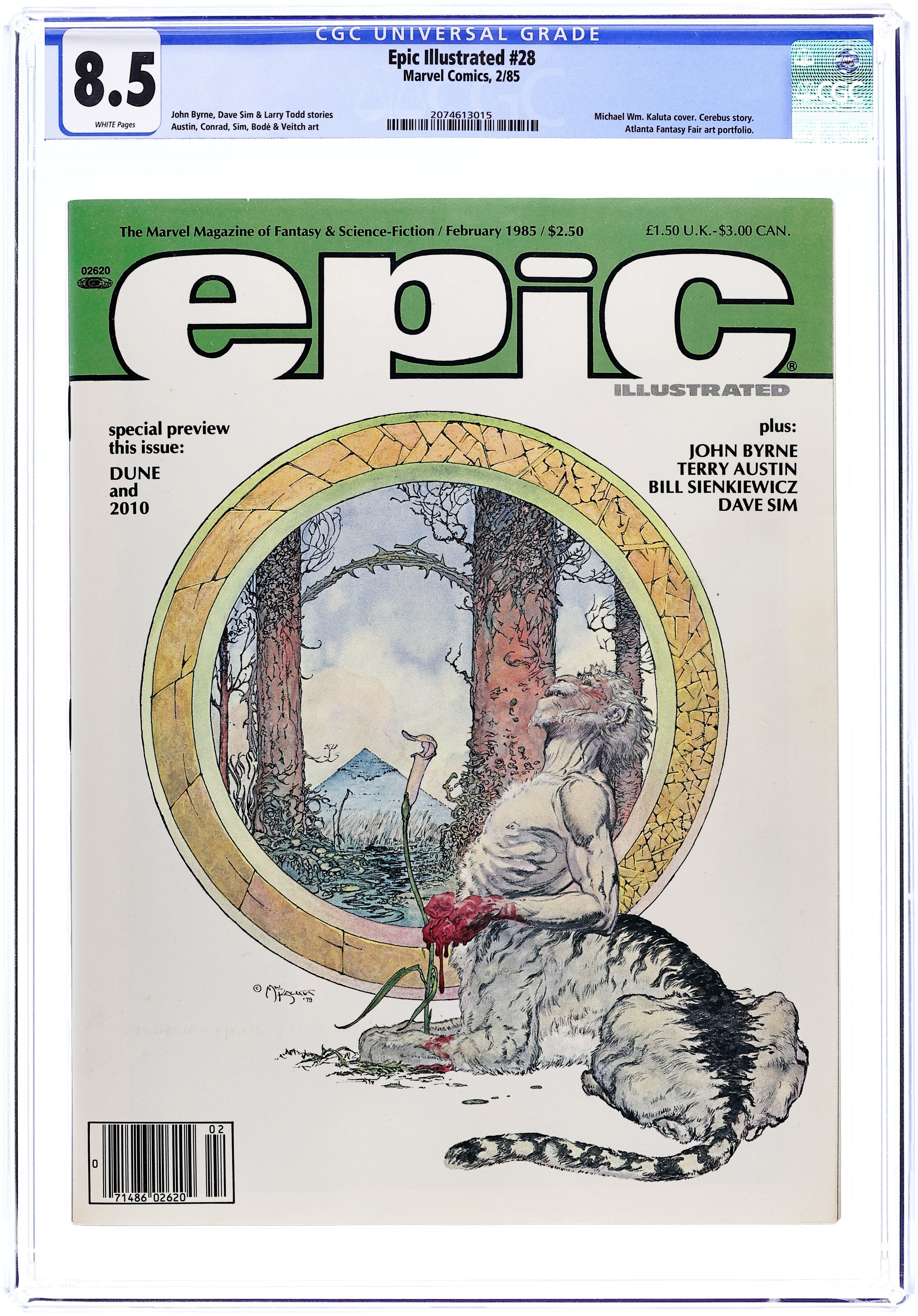 Cover art by Michael Kaluta. Return of the Exile (Chapter Three)--The Last Galactus Story, script and pencils by John Byrne, inks by Terry Austin. Cobalt- 60 story, script by Larry Todd, art by Mark Bode. The Atlanta Fantasy Fair Portfolio. A Friendly Reminder starring Cerebus, script by Dave Sim, pencils by Dave Sim and Gerhard (backgrounds), inks by Dave Sim and Gerhard. Treasure Hunt, script by Laurie S. Sutton, art by Ron Fontes. Training Cycle, script and art by Steve Sabella. Mediaview article by Dennis O'Neil. The Everlasting Tag, script and art by Rick Veitch. Dragonslander text story, script by Robert Rodi, art by Kent Williams. Ashes to Ashes (Chapter IV) starring Toadswart, script and art by Tim Conrad. Film into Comic: Dune and 2010, art by Bill Sienkiewicz, Joe Barney, Larry Hama, and Tom Palmer. All's Well starring Gedeon Plexus, script and art by Zoran Vanjaka. 100 pgs. Feb, 1985. $2.50. Cover price $2.50.
