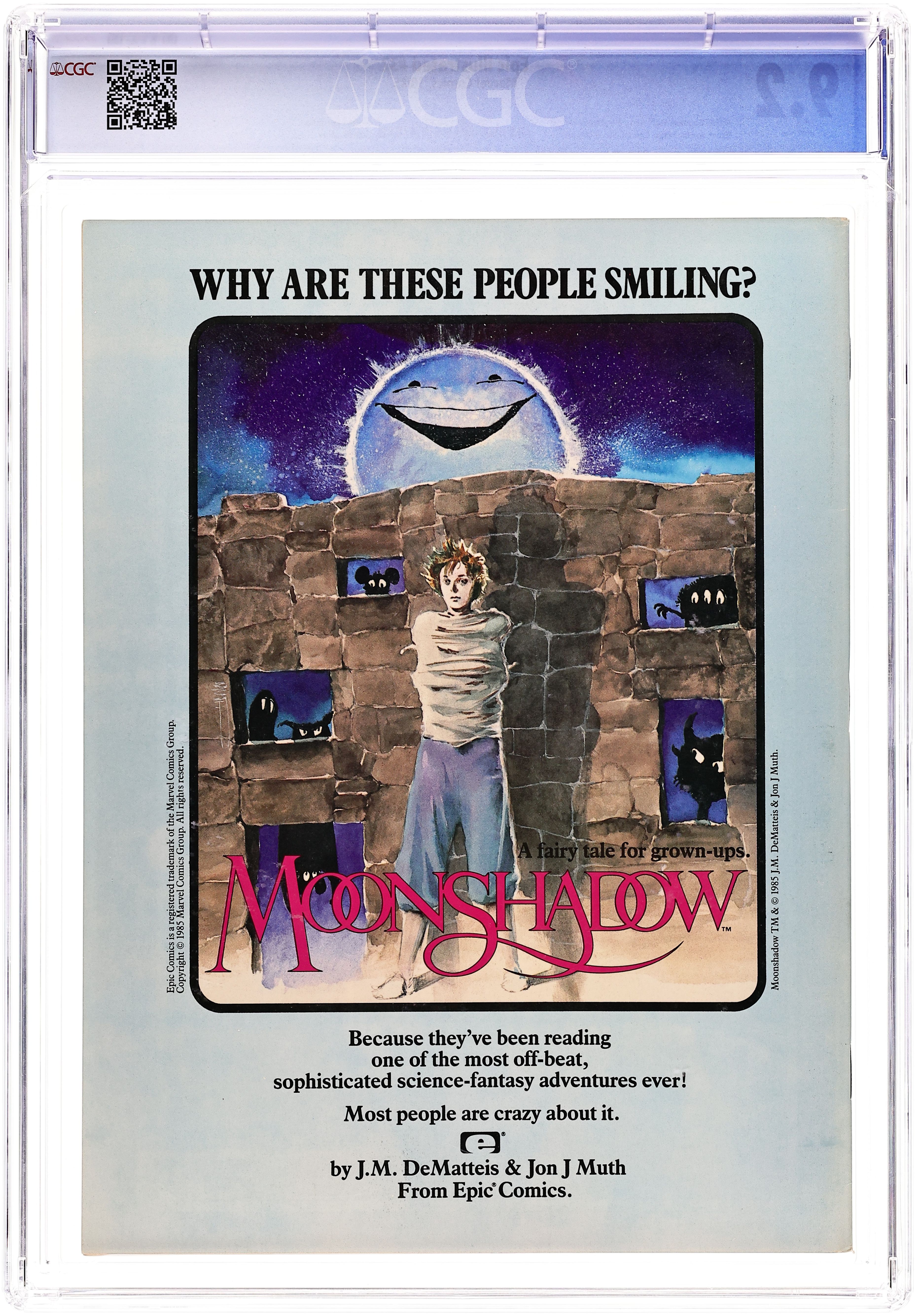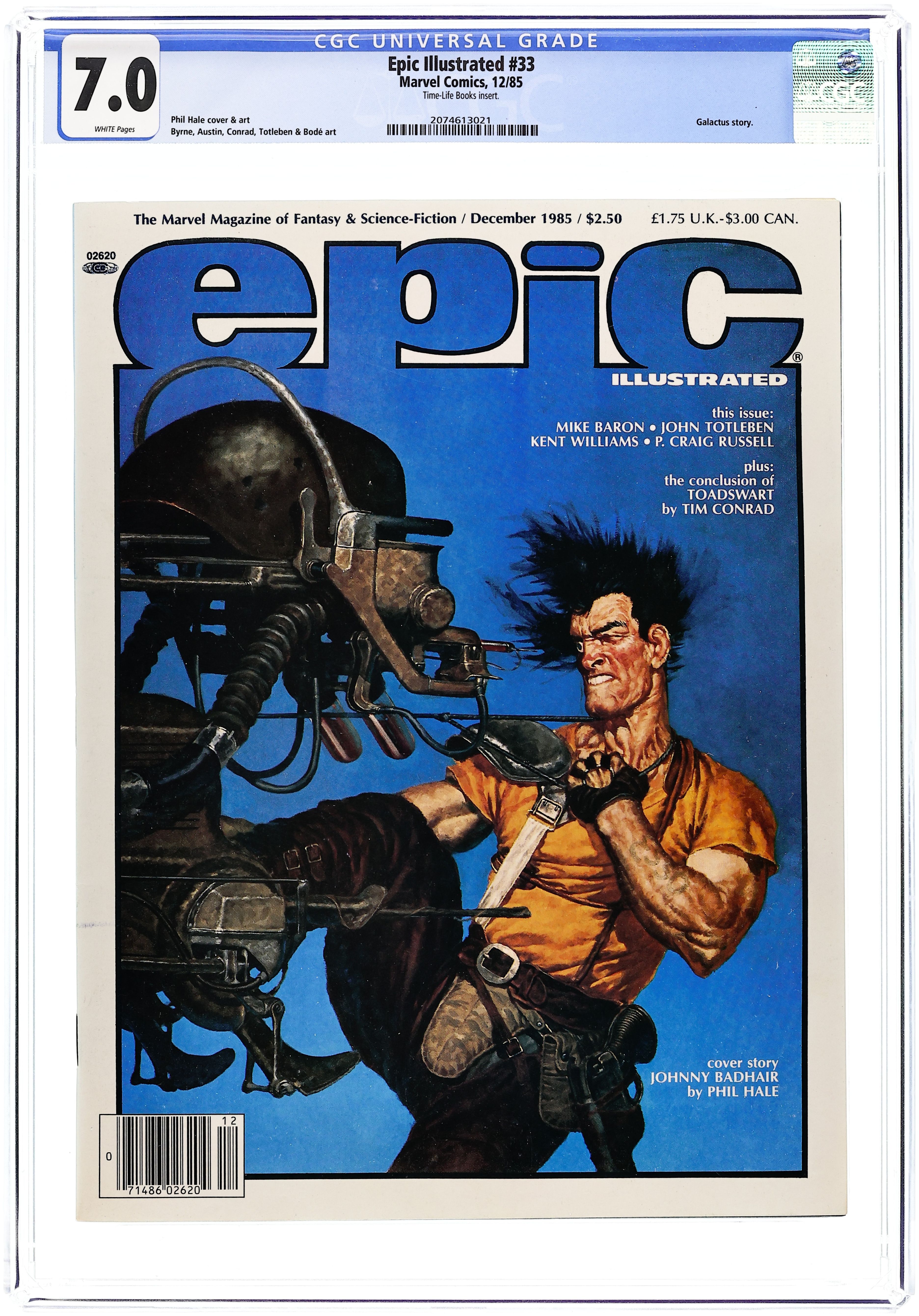 Cover pencils by Phil Hale. The Dweller in Darkness (Chapter Eight)--The Last Galactus Story, script and pencils by John Byrne, inks by Bob Wiacek. Reaching Out starring Dr. Watchstop, script and art by Ken Macklin. Beating the Heat starring Dr. Watchstop, script and art by Ken Macklin. Illustrated text piece on Tim Conrad's portfolio. Briar Rose, script by Lynn Parrish, art by Kent Williams. Final Passage (Chapter VIII) starring Toadswart, script and art by Tim Conrad. Mediaview article by Dennis O'Neil. Fish Story, script by Mike Baron, art by John Totleben. Ein Heldentraum, script by Patrick Mason, art by P. Craig Russell; Goethe adaptation. Snowmen, script and pencils by Kent Williams. Snickers That's Entertainment, script by Kevin Duane, art by Mark Bode. The Champion, script by Doug Moench and Gene Day, art by Dan Day. Johnny Badhair, script and pencils by Phil Hale. 100 pgs. Dec, 1985. $2.50. Cover price $2.50.