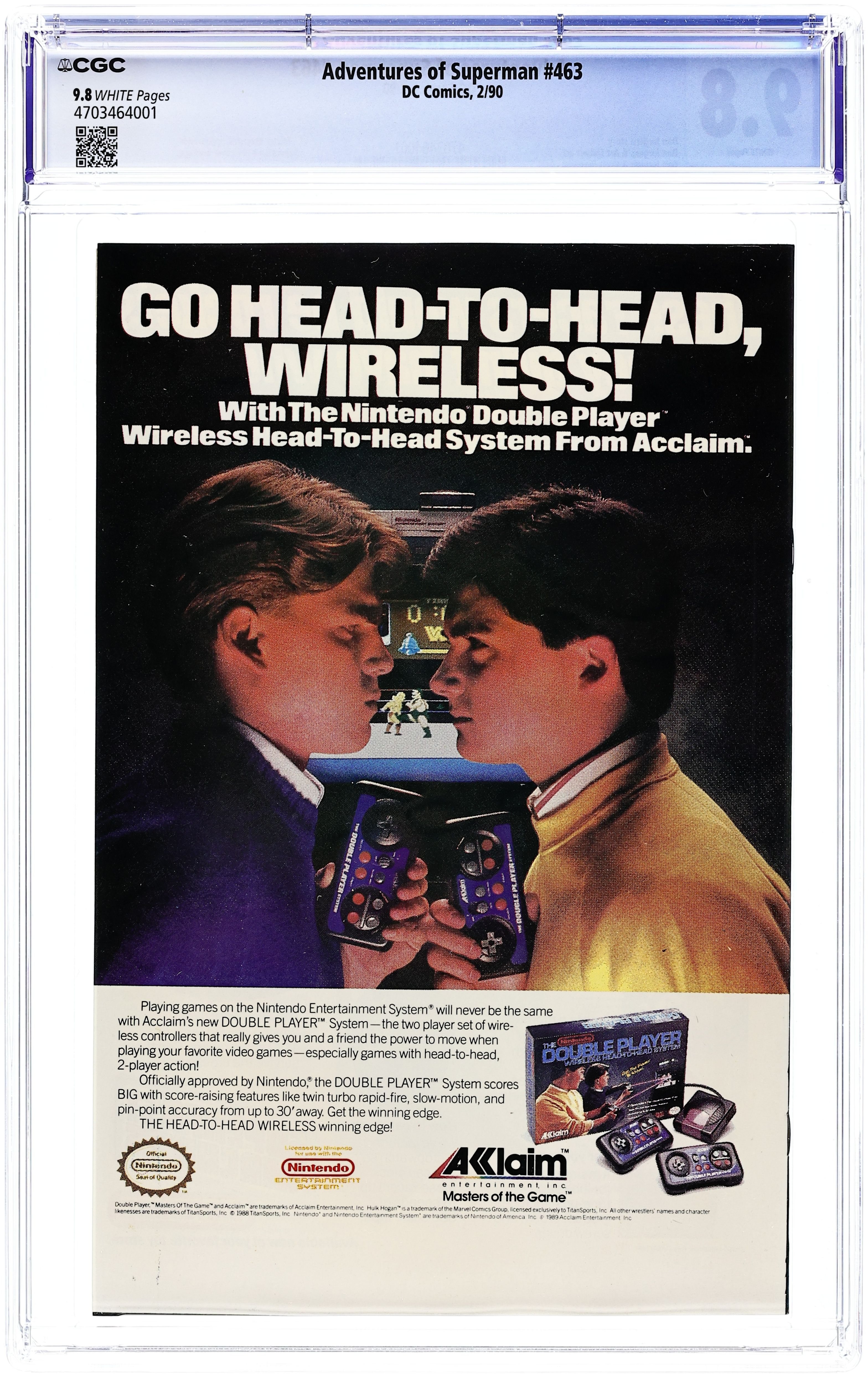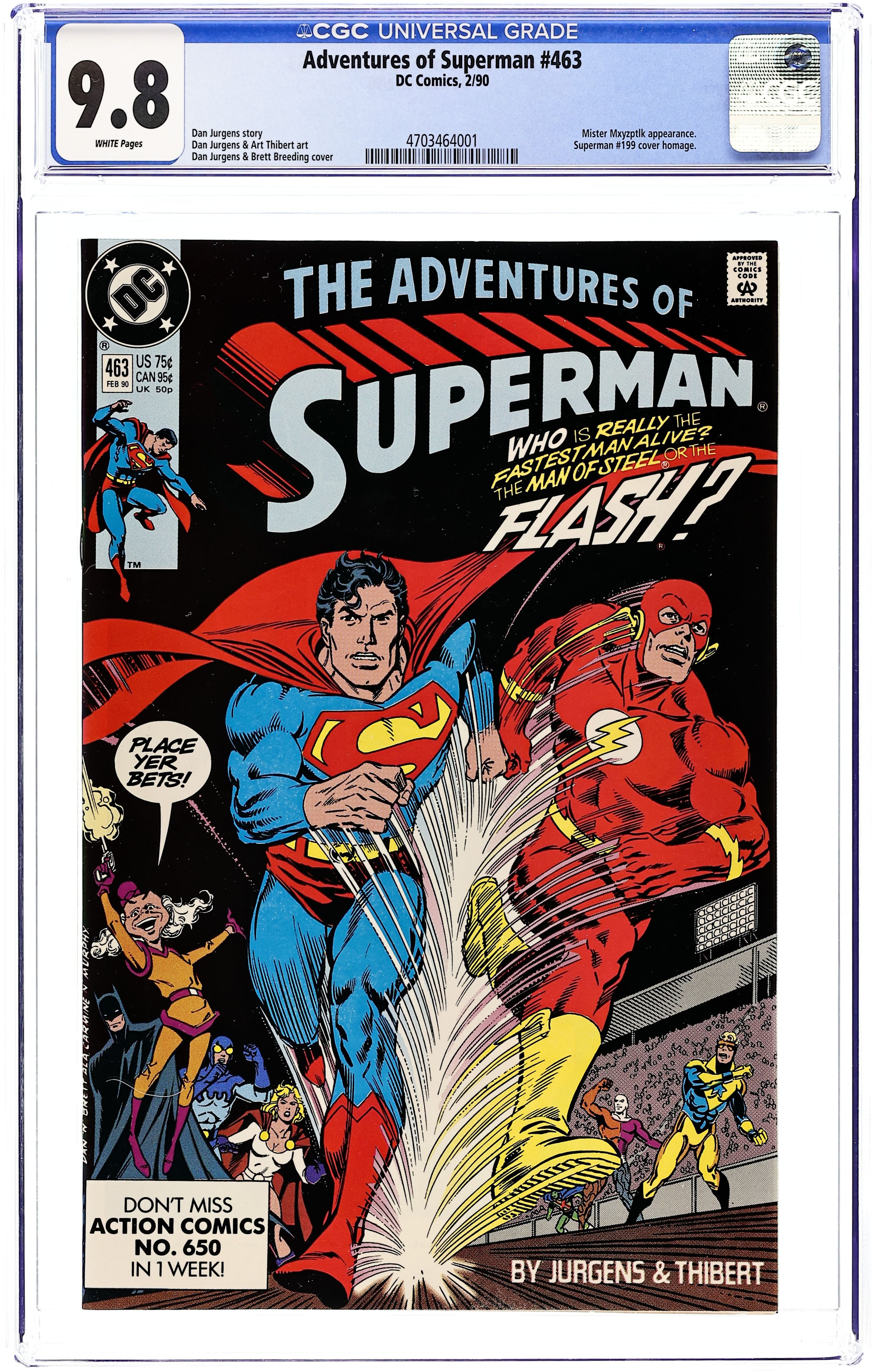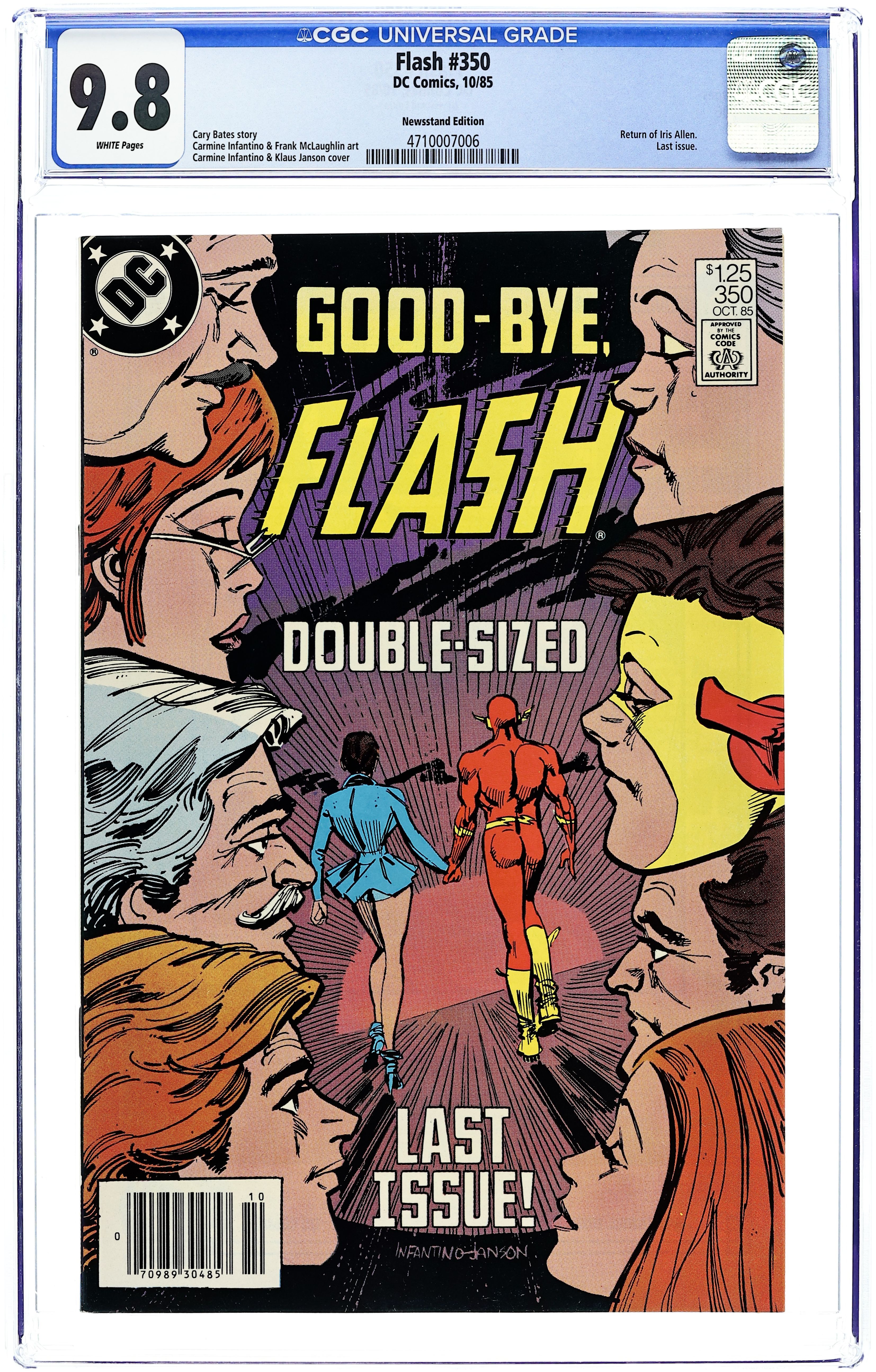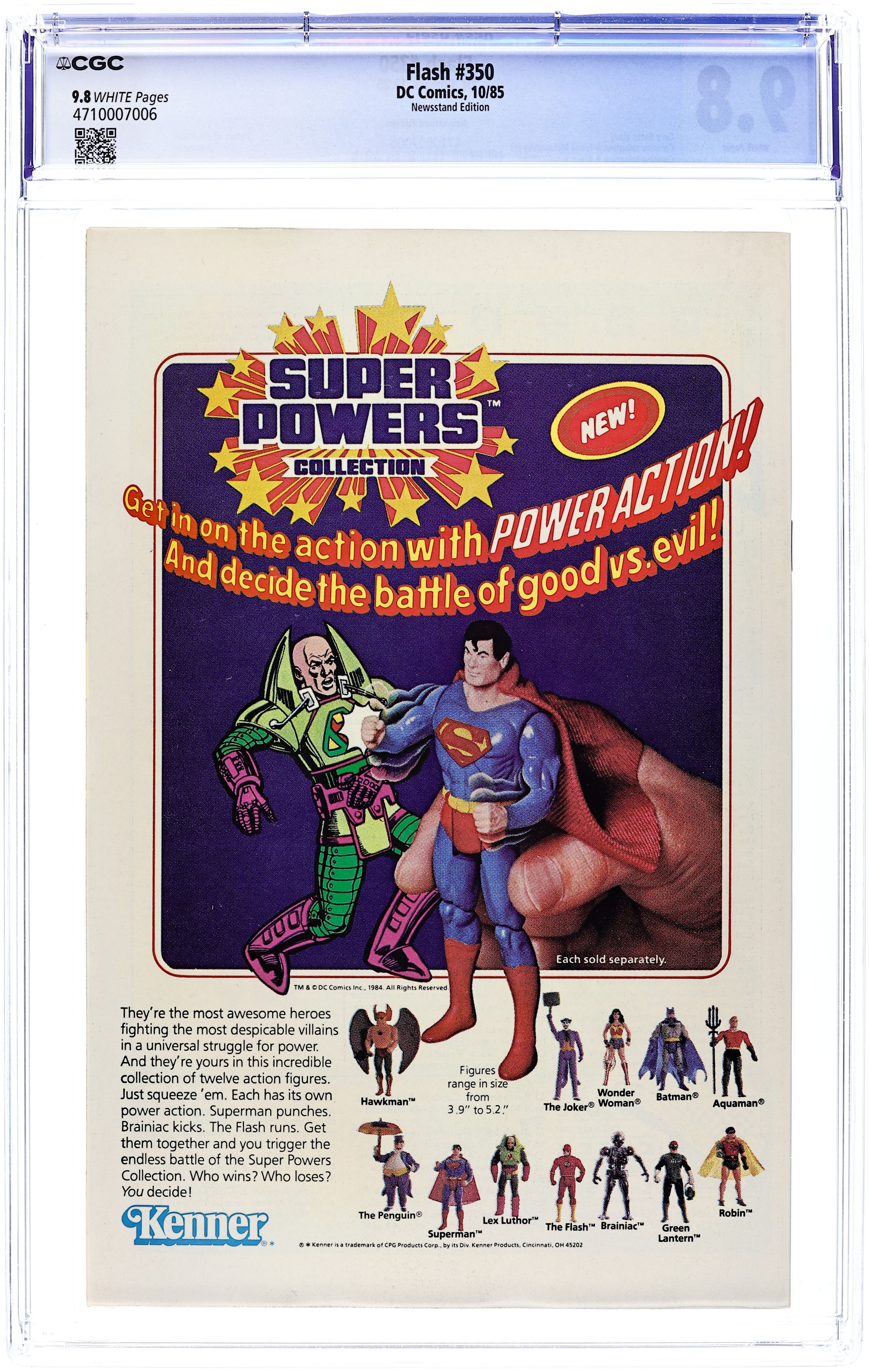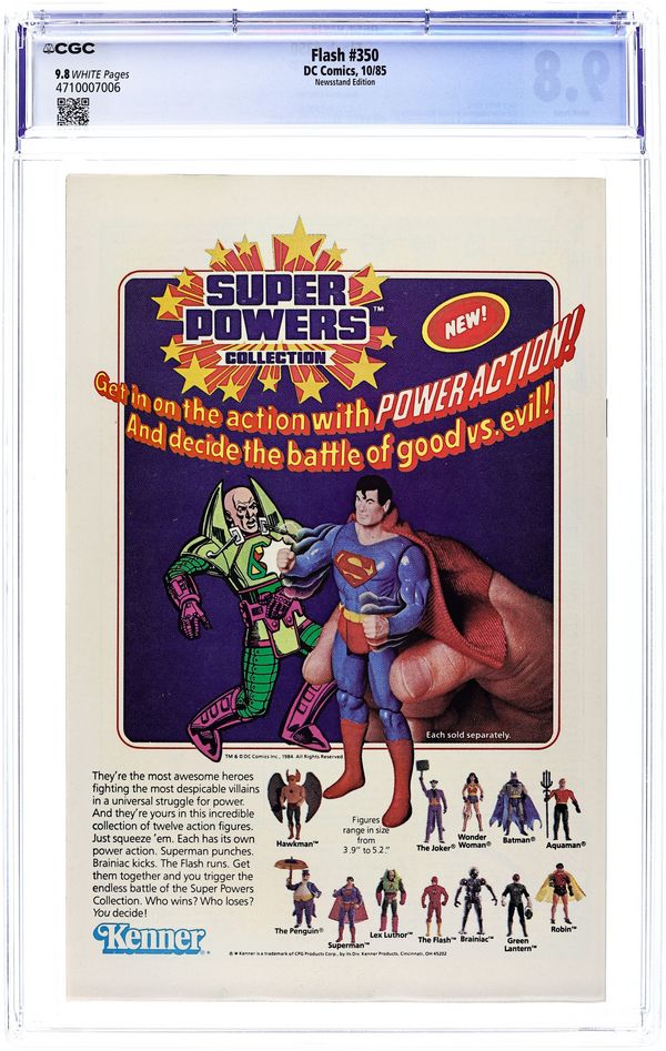 Direct Edition. Crisis on Infinite Earths cross-over. Zapped by an alien ray, Superman hops dimensions and teams up with Superboy-Prime to battle Polarians on Earth-Prime in the 24-page "Year of the Comet." Continued in Adventures of Superman (1939) #414. Script by Elliot S! Maggin, art by Curt Swan & Al Williamson. Plus: the 16-page "Origin of Superboy-Prime" by Maggin, Swan & Williamson. Cover by Eduardo Barreto. Cover price $1.25.