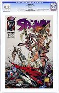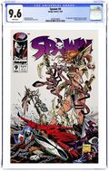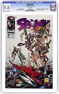 Newsstand Edition. "Home!" Story by Frank Miller. Art by Todd McFarlane. Two factions of cyborgs are battling over turf. Their gang-war has spilled over into Spawn's alleys and he is not pleased. However, sometimes subtlety is a far more effective weapon than brute force, as these cybernetic killers are about learn. Includes a B&W poster of Spawn, Big Guy, and Rusty by Geof Darrow. Cover price $1.95.