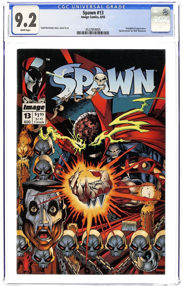 Newsstand Edition. Story and art by Todd McFarlane. "Flashback!" Part 1 of 2. Chapel cameo. Spawn finally learns the identity of the man who pulled the trigger and murdered Al Simmons, and his identity comes as quite a shock. Cover price $1.95.