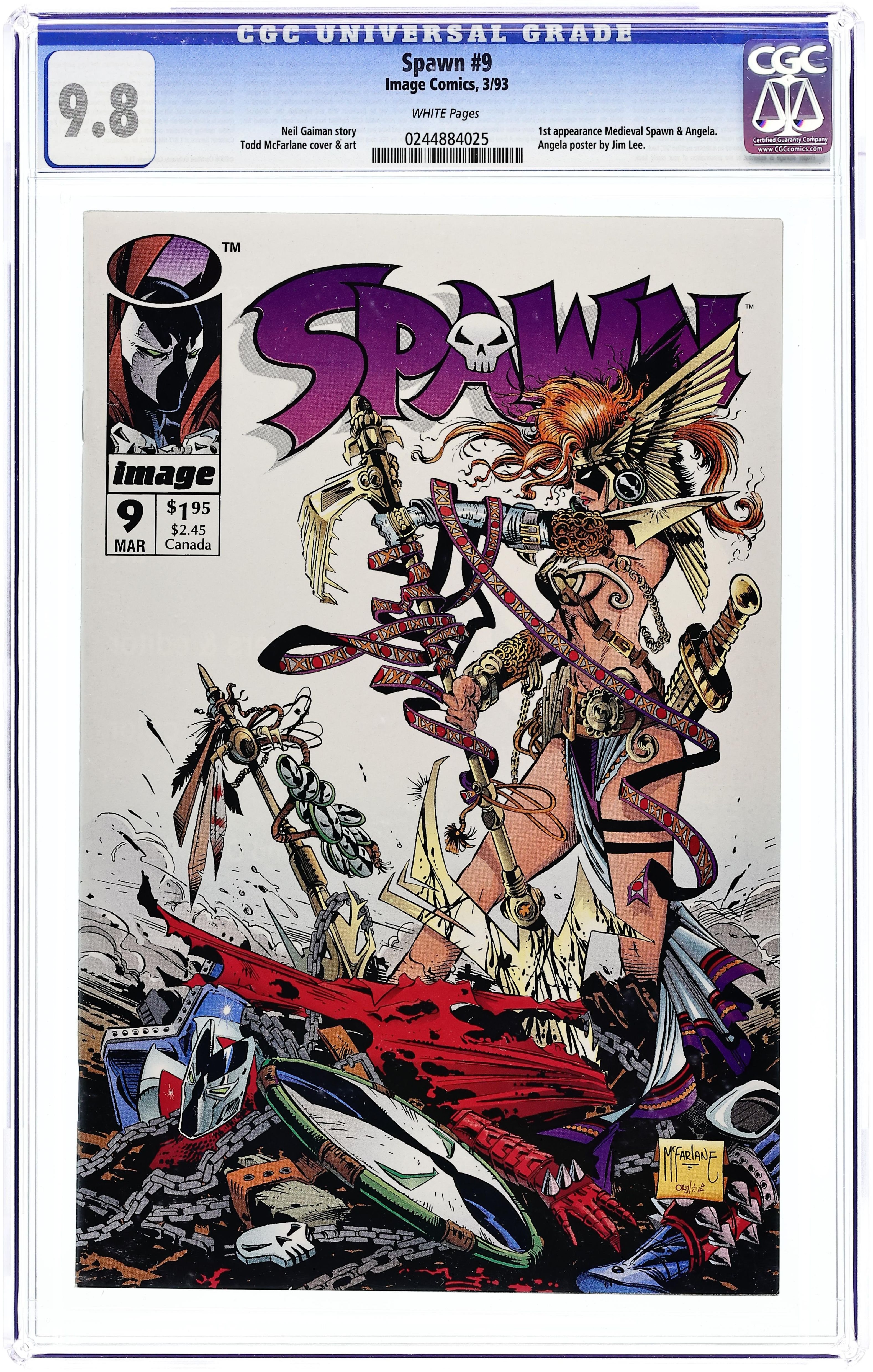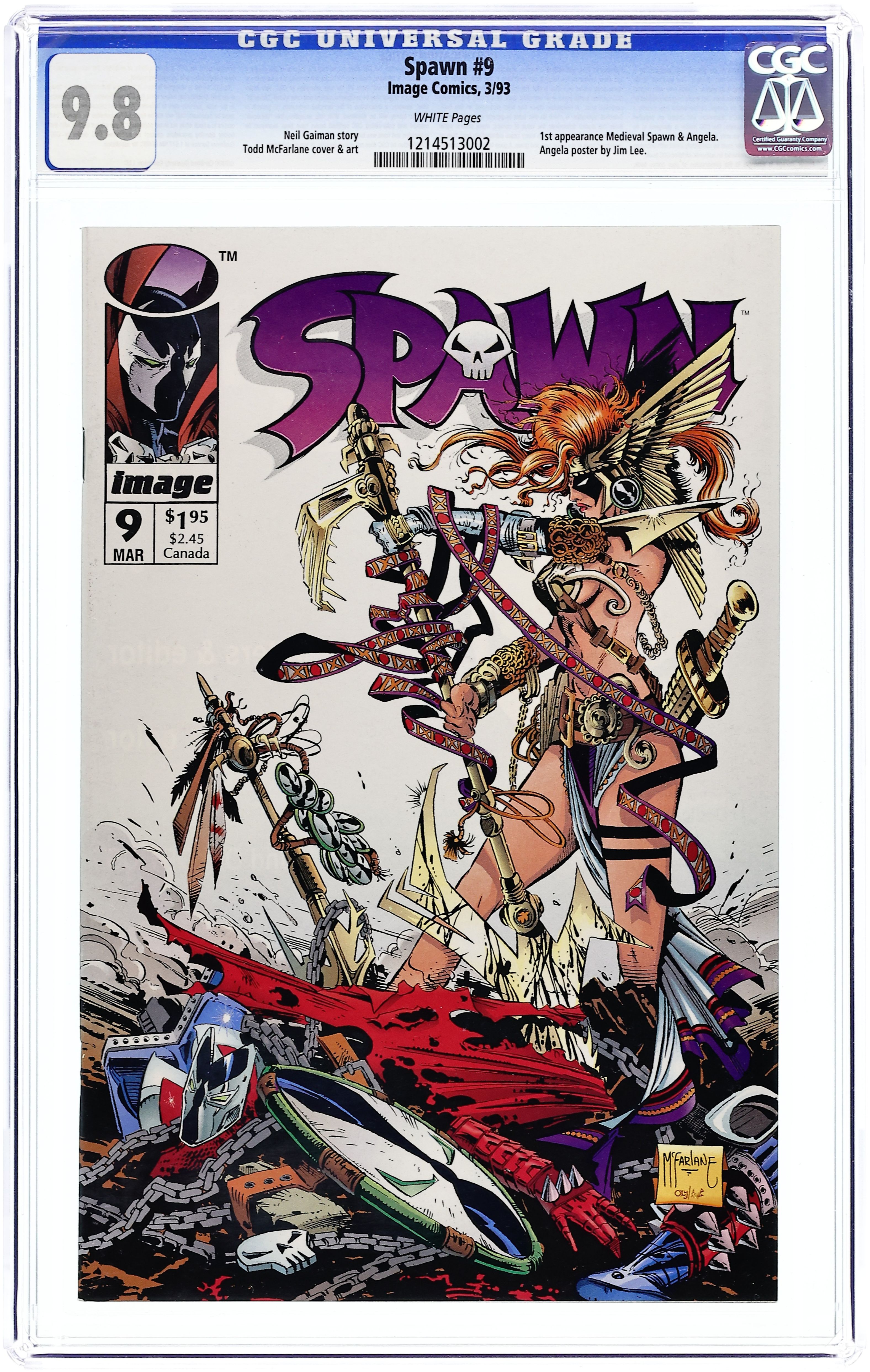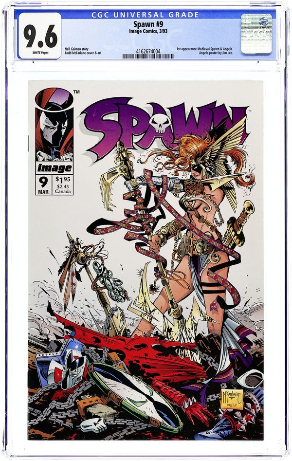 Direct Edition. "Angela!" 1st appearance of Angela, Cagliostro, and Medieval Spawn. Story by Neil Gaiman. Art by Todd McFarlane. Spawn is attacked by Angela, a warrior of Heaven who has been hunting Hellspawns for centuries. Includes a B&W poster of Angela by Jim Lee and Todd McFarlane. Cover price $1.95.