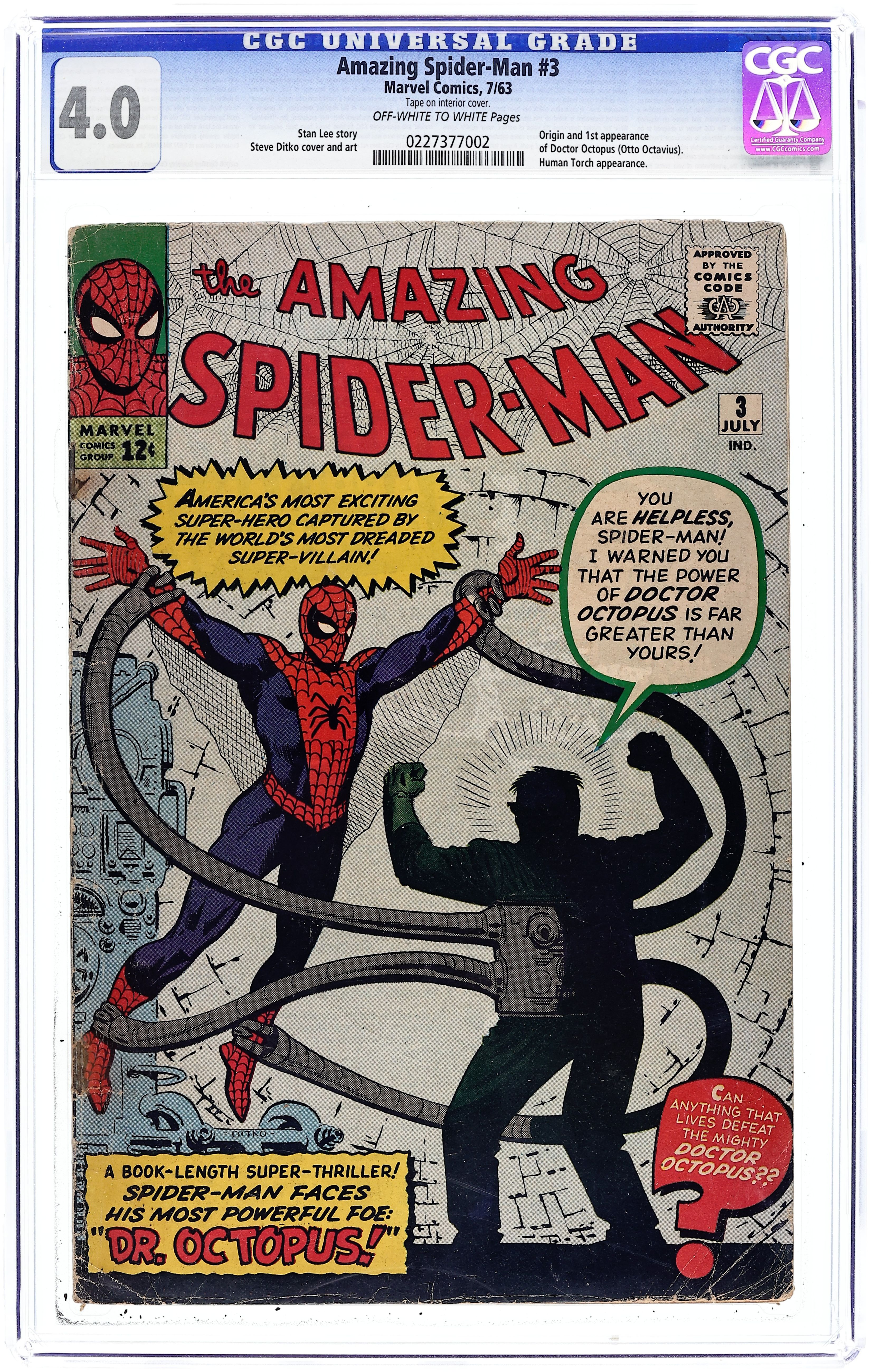 Cover art by Steve Ditko. First appearance of Dr. Octopus in Spider-Man Versus Doctor Octopus, script by Stan Lee, art by Steve Ditko; When an experiment goes wrong, Otto Octavius gains control of his robotic arms and decides to take over an atomic facility, but Spider-Man stops him. Spider-Man pin-up page by Ditko. Reprinted in Marvel Tales # 140. First issue with a letters column (including a letter by MyComicShop president Buddy Saunders!). 36 pgs. $0.12. Cover price $0.12.