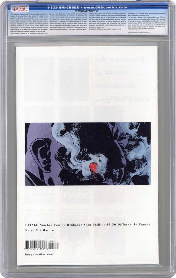 story ED BRUBAKER art & cover SEAN PHILLIPS colors DAVE STEWART The second issue of the hottest new series of 2012 is here! In modern times, Nicholas Lash searches for answers about the mysterious woman who ruined his life, while in the mid-1950s, reporter Dominic Raines is drawn down that same murderous path... The award-winning team of Brubaker and Phillips keeps the heat on high in this epic horror noir.""(W) Ed Brubaker (A/CA) Sean Phillips Cover price $3.50.