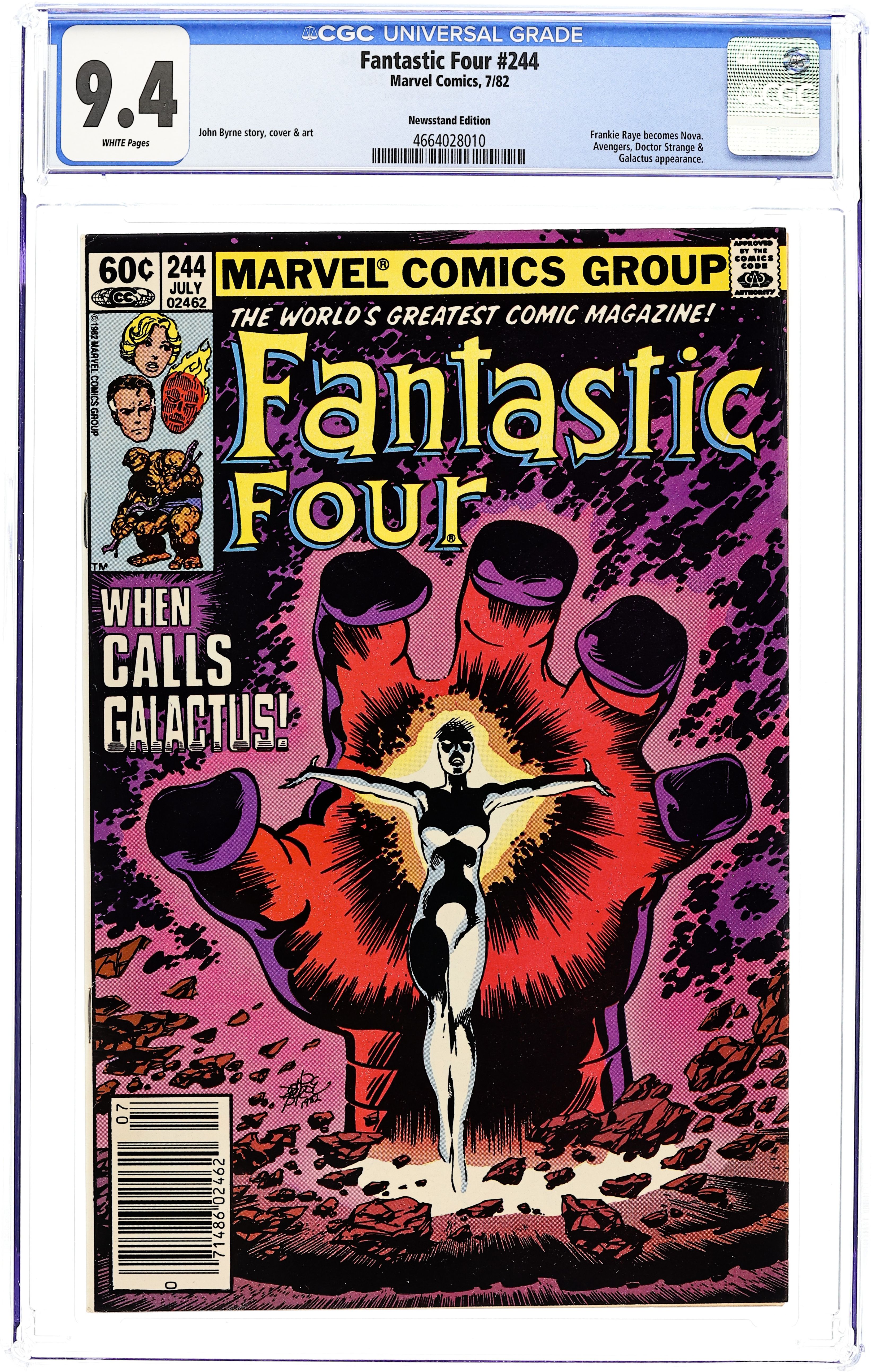 Starts Feb 2 Direct Edition. "Beginnings and Endings" Part 3 of 3. Script and Art by John Byrne. Cover by John Byrne. After an unprecedented victory over Galactus, the Avengers and the Fantastic Four face a major ethical decision: should they try to save the Ravager of Worlds or let him perish as his energies dwindle? Reed decides on the former and constructs a giant machine to revitalize Galactus! However, the Devourer of Worlds needs one more thing to complete his recovery...a new herald! In a stunning move, Frankie Raye volunteers! So where does that leave the Human Torch? First appearance of Nova (aka Frankie Raye). Cameo appearances by Captain America, Iron Man, Thor, Wasp, and Doctor Strange. (Notes: This trilogy was reprinted in 1989 in the trade paperback titled "Fantastic Four: Trial of Galactus." Reed's decision to save Galactus will come back to haunt the FF beginning in Fantastic Four 257.) 36 pages Cover price $0.60.