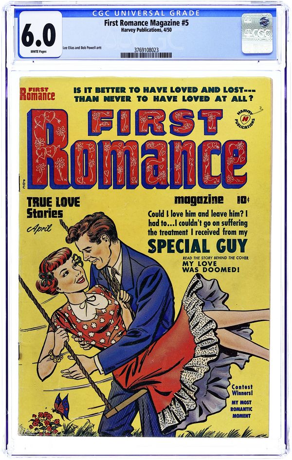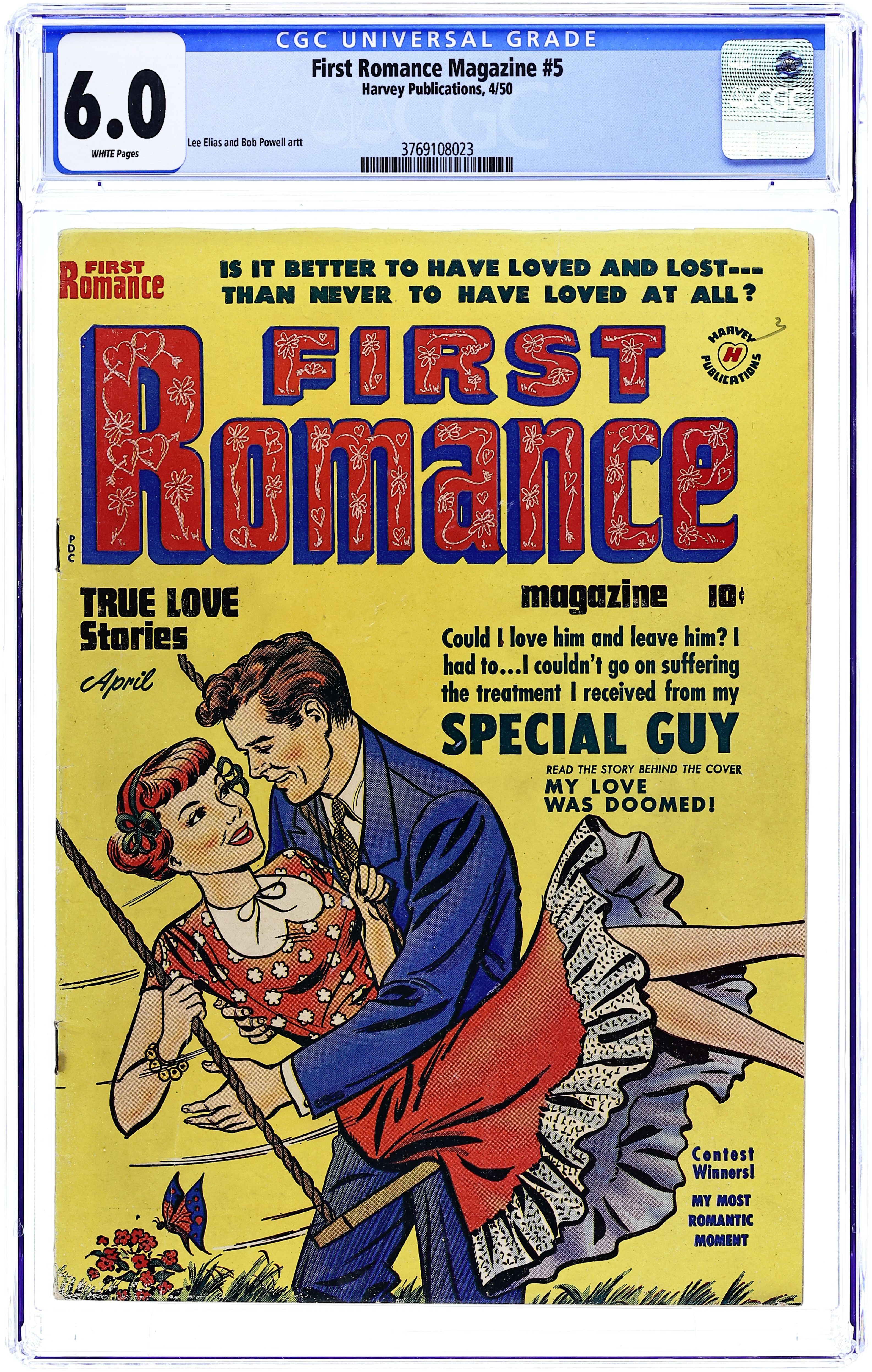 Stories and art by Bob Powell and others. Tales of love and heartbreak in 1950s America from publisher Harvey. Country housewife Ginny regrets not marrying her first love, wealthy Ed. Connie breaks up with nerdy Horace in search of a "real man," until she learns just how much of a real man Horace is. Ray and Mona want to marry, but her father's new assignment in Germany may cancel all of that. I Married a Farmer; Romantic Antics; My Love Scene; Strange Romantic Customs; Love Takes a Holiday; My Most Romantic Moment; Parting Is Such Sweet Sorrow; Wait for Love; My Love Was Doomed! 36 pages, full color. Cover price $0.10.