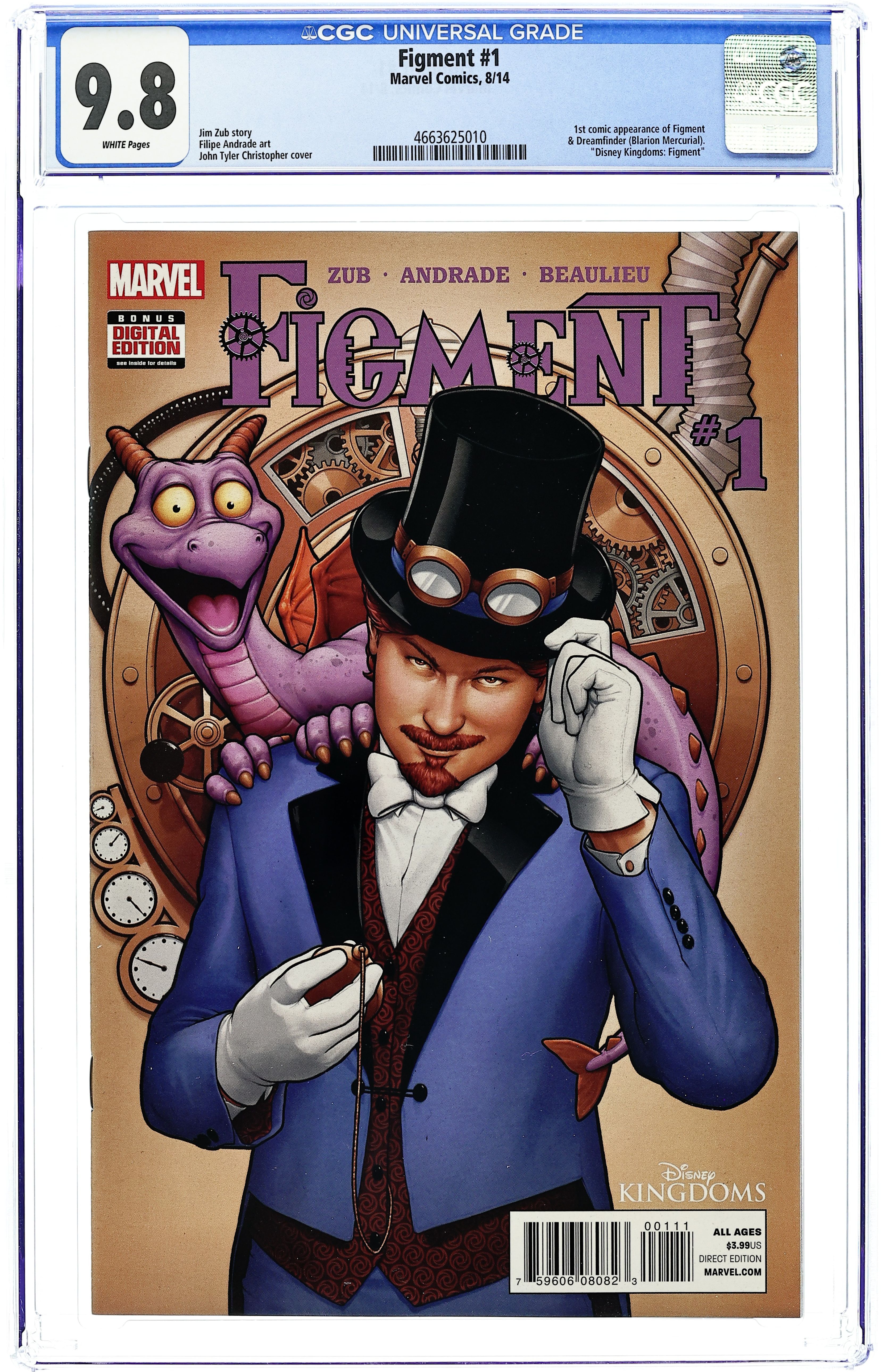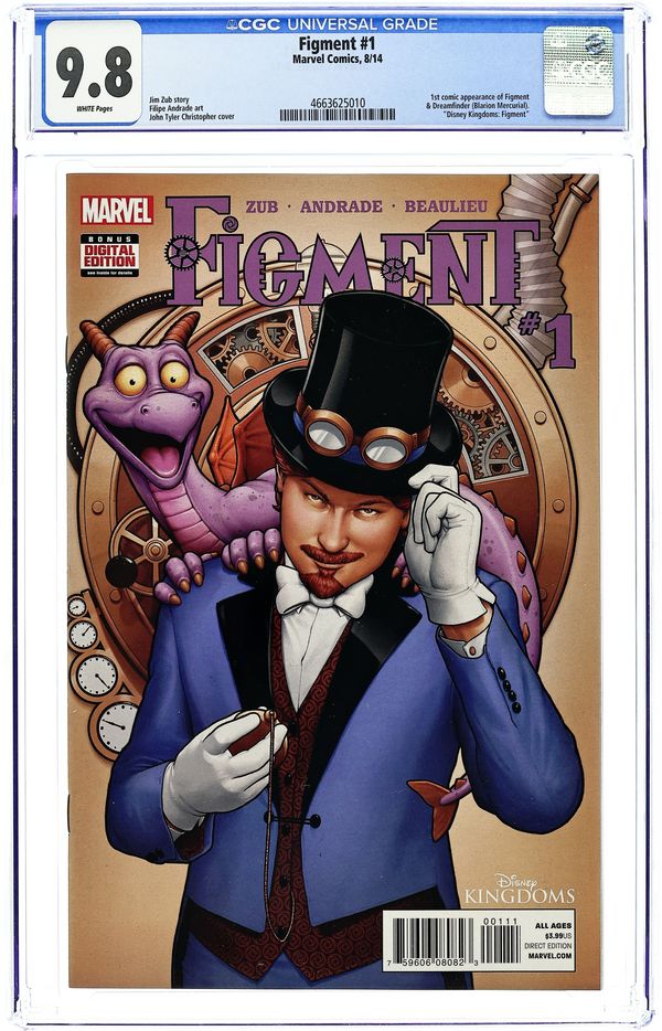 Written by Jim Zub. Art by Filipe Andrade. Cover by John Tyler Christopher. THE NEXT DISNEY ADVENTURE IS HERE - STARRING ONE OF DISNEY'S MOST POPULAR CHARACTERS! Dive into a steampunk fantasy story exploring the never-before-revealed origin of the inventor known as Dreamfinder, and how one little spark of inspiration created a dragon called Figment. What is the Academy Scientifica-Lucidus? Who is Blarion Mercurial? What is the Integrated Mesmonic Spark Convertor? Find out as we give a Marvel spin to Epcot's mind-bending attraction, Journey Into Imagination! 28 pages, full color. Cover price $3.99.