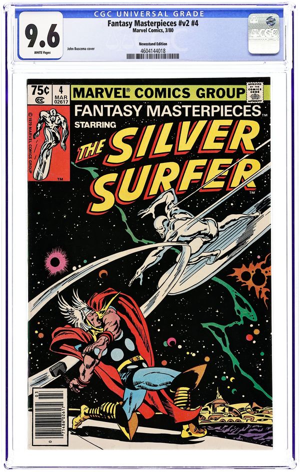 Newsstand Edition. Reprints Silver Surfer (1969 1st Series) #4. "The Good, the Bad, and the Uncanny!" Written by Stan Lee. Pencils by John Buscema. Inks by Sal Buscema. Guest-starring Thor. When the Silver Surfer ventures to fabled Asgard, home of the Norse Gods, a misunderstanding sets the Sentinel of the Spaceways against the mighty God of Thunder. It's the Power Cosmic vs. godly might. It's Thor vs. the Silver Surfer in a battle that will truly shake the heavens! Cover price $0.75.