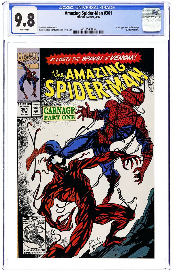 First Printing. Newsstand Edition. First (full) appearance of Carnage in "Savage Genesis!" Part 1 of 3. Script by David Michelinie. Pencils by Mark Bagley. Inks by Randy Emberlin. Cover by Mark Bagley and Randy Emberlin. Blood runs in the streets as a serial killer roams New York City! And as the web-slinger investigates the murders, he notices a very disturbing similarity to another killer's modus operandi! In a burned-out building in Brooklyn, the spectacular one comes face-to-face with his new homicidal foe...Carnage! Can the wall-crawler end Cletus Kasady's rampage in their very first encounter? Cameo appearances by Aunt May and Mary Jane Watson. Flashback cameo by Venom. (Note: This three-part story was reprinted in 2011 in the trade paperback: Spider-Man -- The Vengeance of Venom.) 36 pages, full color. $1.25 cover price. NOTE: Most of these were distributed with slight printer tears in the bottom edge of the cover. Cover price $1.25.