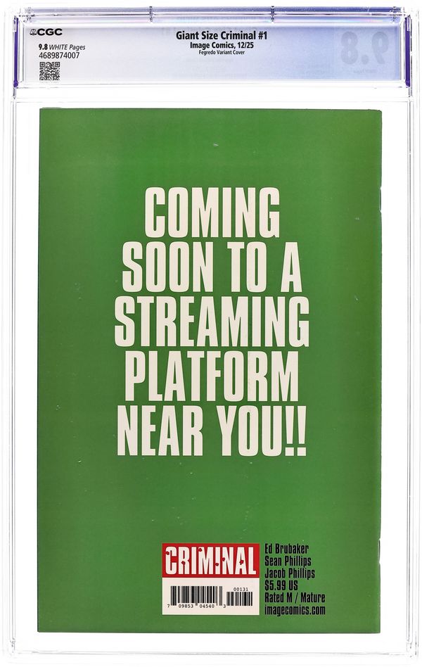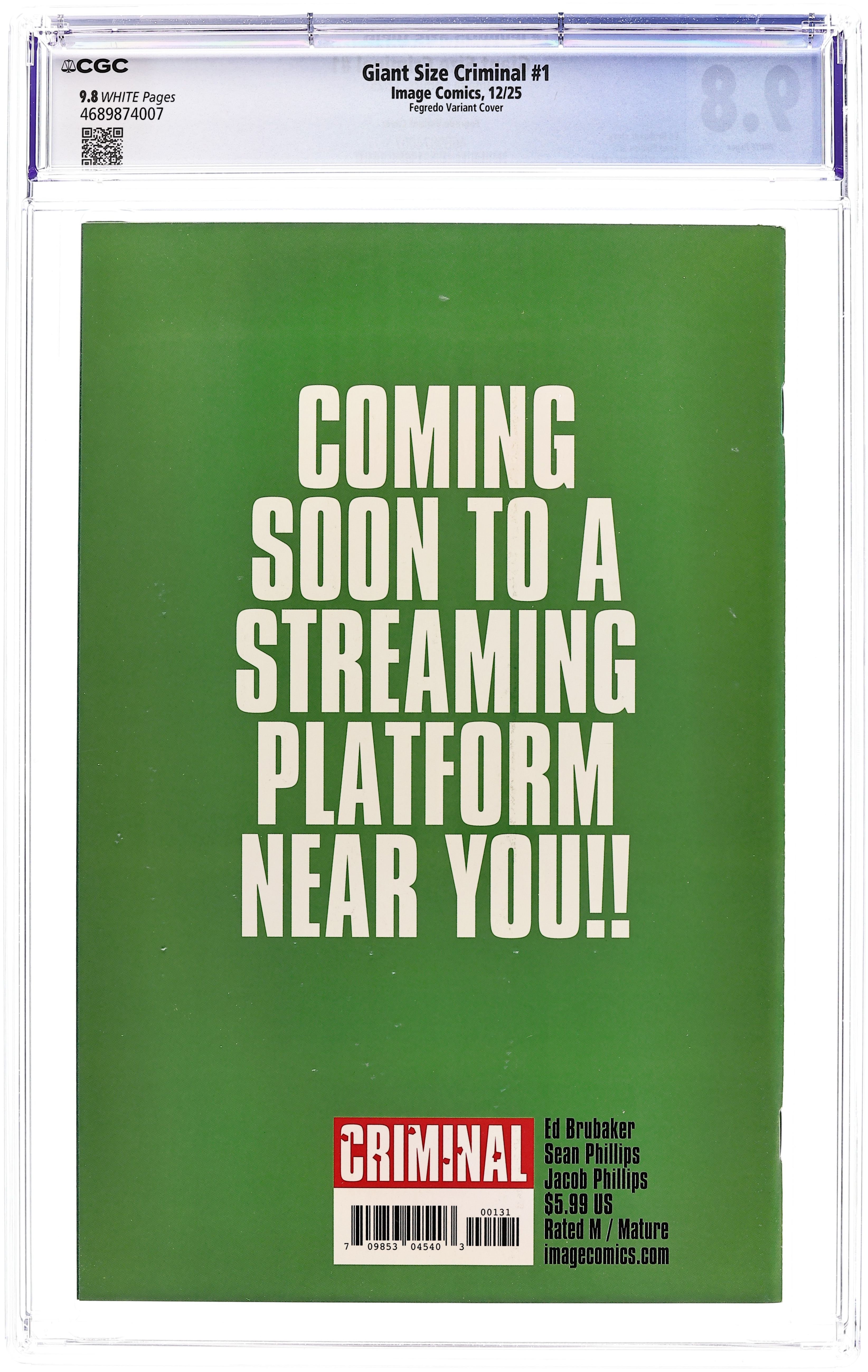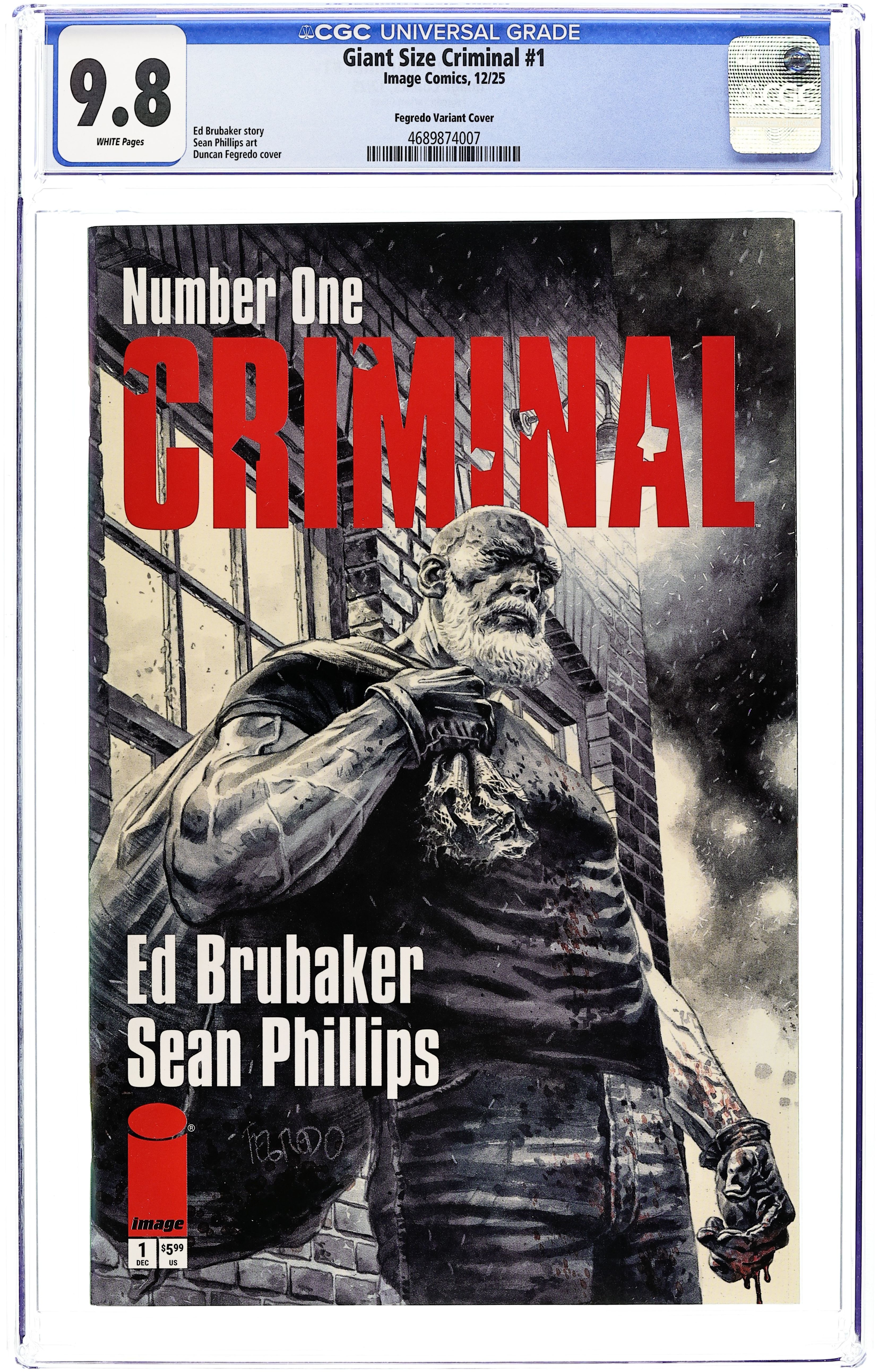 Limited 1 for 10 Retailer Incentive Variant Cover.(W) Ed Brubaker (A) Sean Phillips (CA) Duncan Fegredo THE FIRST NEW CRIMINAL SINGLE ISSUE IN OVER FIVE YEARS ARRIVES ON THE EVE OF THE STREAMING TV SERIES PREMIERE This oversized, annual-style issue is packed with everything CRIMINAL fans love from BRUBAKER & PHILLIPS—and much more. Headlining the issue is a novella-length story starring fan-favorite character RICKY LAWLESS (a major player in the upcoming TV adaptation) as he goes solo on his latest heist—what could possibly go wrong? But that's just the beginning, you’ll also get: A CRIMINAL tabletop RPG module written by KIERON GILLEN and illustrated by SEAN PHILLIPS Behind-the-scenes insights into the CRIMINAL TV series from showrunner Brubaker himself A fully illustrated guide to the world of CRIMINAL and its key characters This GIANT SIZE CRIMINAL one-shot is the perfect entry point for new readers—and just in time for X-mas, it's an even better stocking-stuffer for the diehard Brubaker and Phillips fan in your life. Exclusively in print and only available at comic shops—our way of saying thanks to retailers! Cover price $5.99.