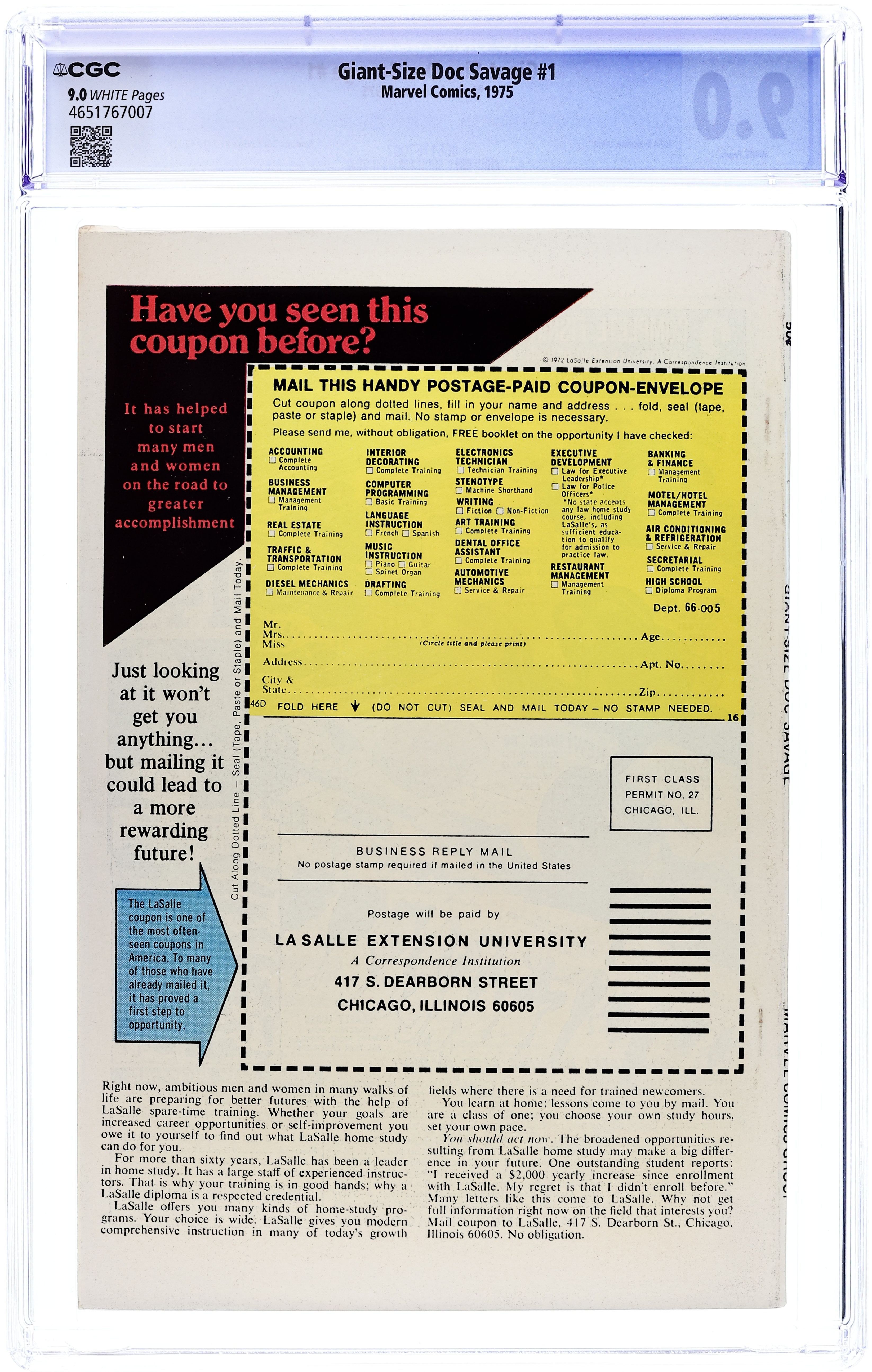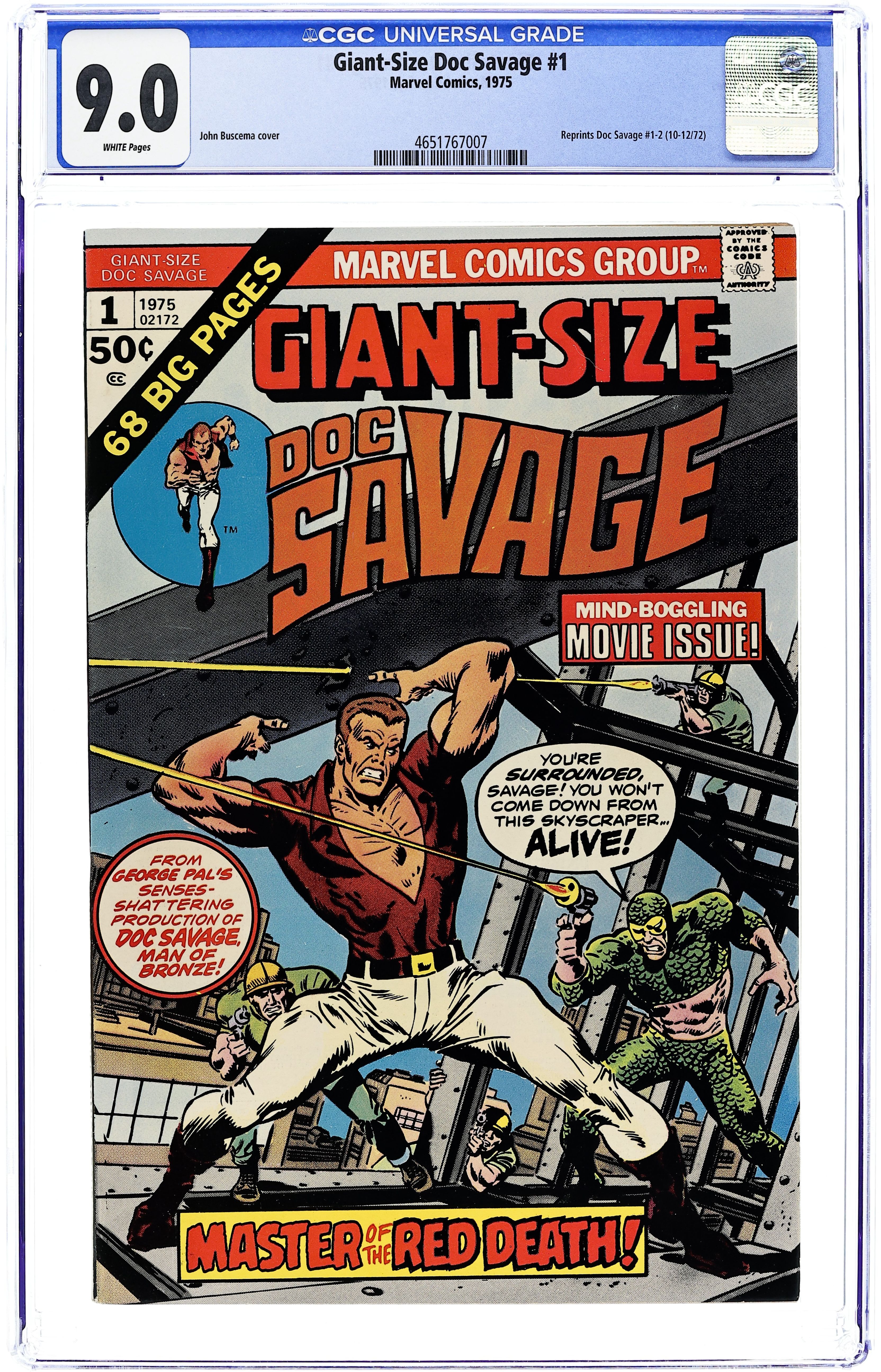 68-page giant. Reprints Doc Savage #1 and 2: "The Man of Bronze!" Plot by Roy Thomas, script by Steve Englehart, pencils by Ross Andru, inks by Jim Mooney. "Master of the Red Death!" Script by Englehart, pencils by Mooney, inks by Ernie Chan (as "Ernie Chua"). Also, a five-page text piece about Doc Savage and the gang by Robert Sampson, accompanied by illustrations from the comics. Two pin-ups (probably by Tony DeZuniga). 2-page cover gallery reproducing the covers to Doc Savage 2-8. John Buscema cover pencils. Cover price $0.50.