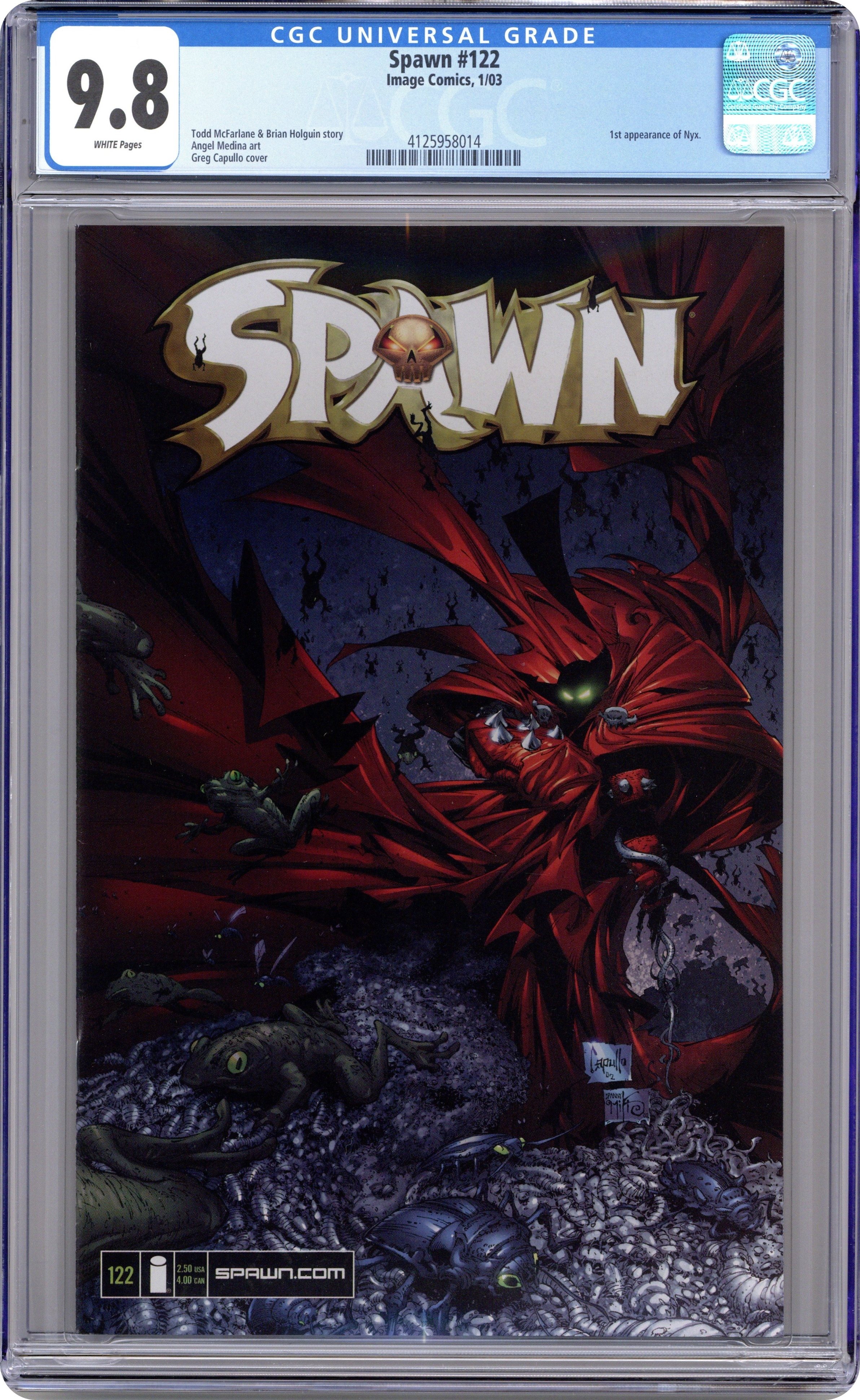 Written by BRIAN HOLGUIN & TODD McFARLANE art by ANGEL MEDINA & DANNY MIKI cover by GREG CAPULLO. CONCEPT: Al Simmons, once the U.S. government's greatest soldier and most effective assassin, was mercilessly executed by his own men. Resurrected in a flawed agreement with the powers of darkness, Simmons was reborn as a creature from the depths of Hell. Disfigured, homeless and alone, the warrior now known as Spawn wanders the shadowy alleys of New York City in search of his past life.THIS ISSUE: "Devil to Pay," Part 1?She betrayed Al Simmons by stealing the power of the Hellspawn?a power that Simmons never wanted in the first place. But a betrayal is a betrayal, despite its intent, and now Nyx must face the wrath of Spawn. Weakened, battered and disillusioned after her recent adventure, Nyx soon realizes that her only chance for survival may lie with the whims of an ally recently freed from Hell. Cover price $2.50.