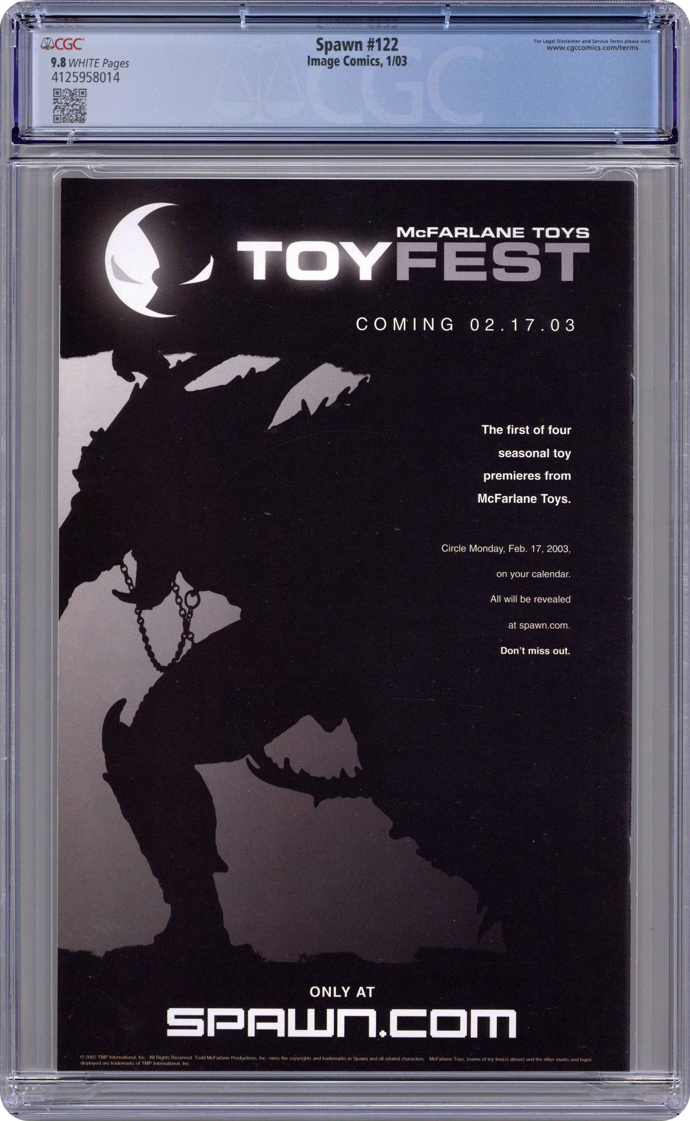 Direct Edition. Written by Brian Holguin and Todd McFarlane. Art by Angel Medina and Danny Miki. Cover by Greg Capullo and Todd McFarlane. Ongoing monthly series In stores the week of June 25th The Concept: Al Simmons, once the U.S. government's greatest soldier and most effective assassin, was mercilessly executed by his own men. Resurrected from the ashes of his own grave in a flawed agreement with the powers of darkness, Simmons is reborn as a creature from the depths of Hell. Disfigured, homeless and alone, this warrior now known as Spawn wanders the shadowy alleys of New York City in search of his past life. This Issue: "Mad Shadows, part 1"?Childhood memories blend with adult terror: A bizarre rash of attacks have recently occurred in the city-attacks that seem to mimic scenes from classic horror films and stories. Could an obsessed new kind of serial killer be behind the brutal assaults? Or could something far stranger and far more dangerous be responsible? One way or another, Spawn is determined to find out. FC 32pp $2.50 Cover price $2.50.