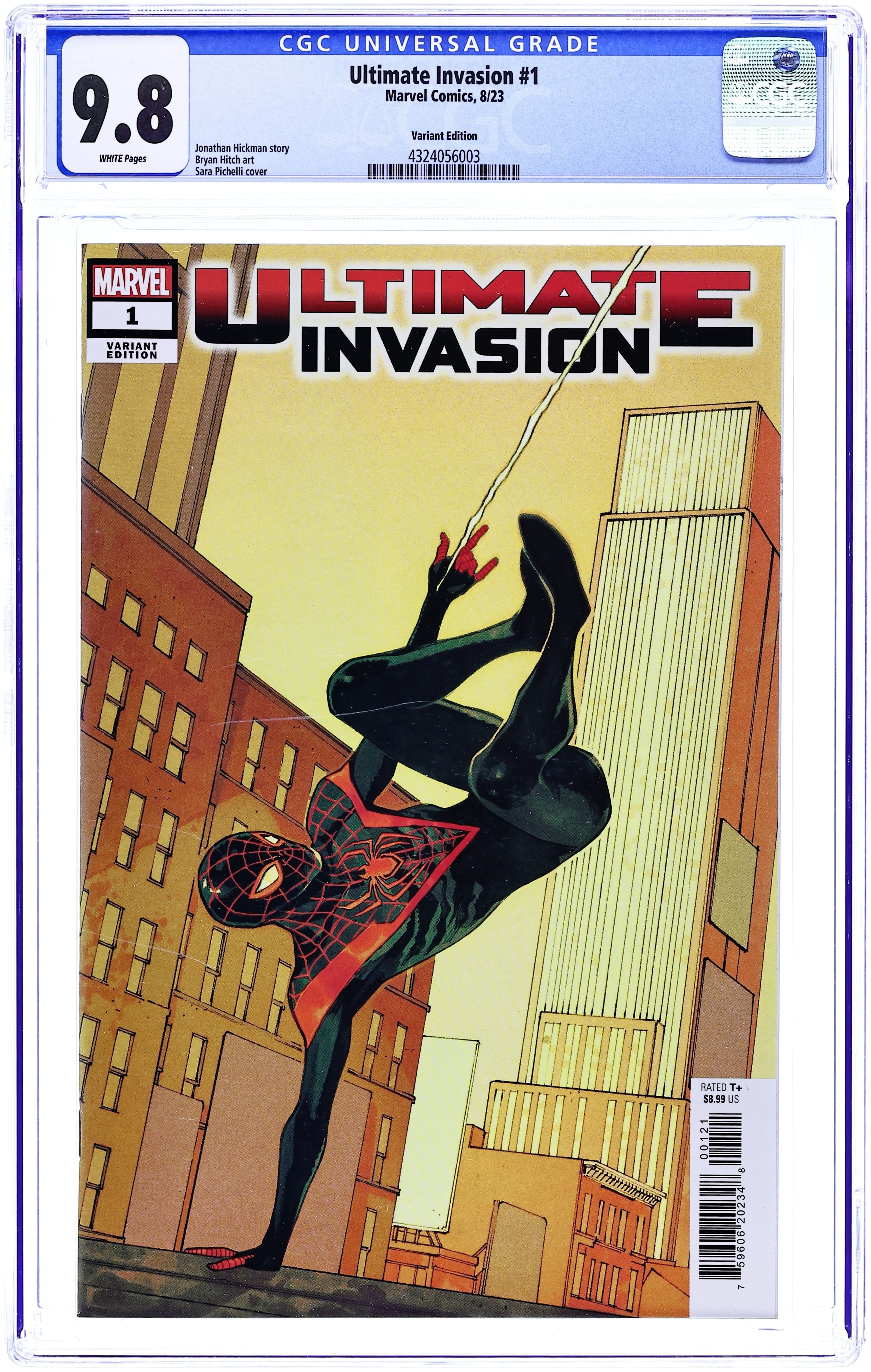 Limited 1 for 50 Retailer Incentive Variant Cover. Written by Jonathan Hickman. Art and Cover by Bryan Hitch. THE TRANSFORMATION OF THE MARVEL UNIVERSE BEGINS! Superstar creators Jonathan Hickman and Bryan Hitch team up! The Illuminati must form once again to stop the Maker from his plans to destroy - or perhaps rebuild - the universe, with Miles Morales at the center of it all! Bryan's work on THE ULTIMATES helped redefine super hero comics for the 2000s - wait until you see what he and Jonathan have in store for this decade! Including new data pages by Jonathan Hickman - plus exclusive behind-the-scenes material on the world-building that has gone into this project! 56 pages, full color. Rated T+ Cover price $8.99.