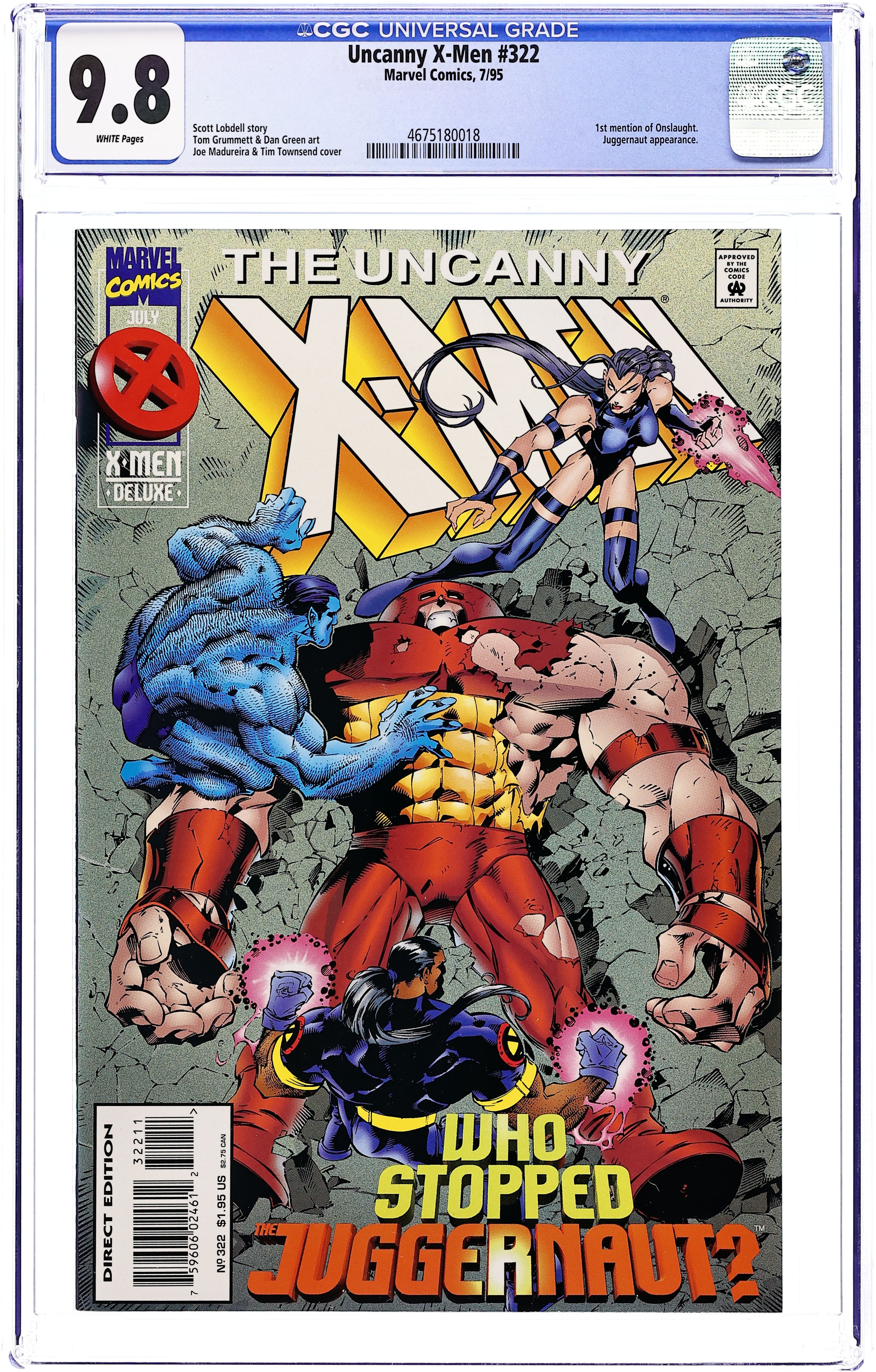 Deluxe Direct Edition. Cover by Joe Madureira and Tim Townsend. Dark Walk, script by Scott Lobdell, art by Tom Grummett, Dan Green, Mark Pennington, Al Milgrom, and Matt Ryan; Charlotte shows Archangel a crime scene where mutants apparently killed humans during a hate crime; Jean talks to her dad about her dead sister; Wolvie tells Storm that his humanity is slipping away; Beast, Bishop and Psylocke are coming out of the movies (Pulp Fiction) when Juggernaut falls out of the sky in front of them; Juggy is disoriented, confused and very afraid of somebody called Onslaught. Statement of Ownership average # of copies in preceding 12 months: 723,067. 36 pgs., full color. $1.95. Cover price $1.95.