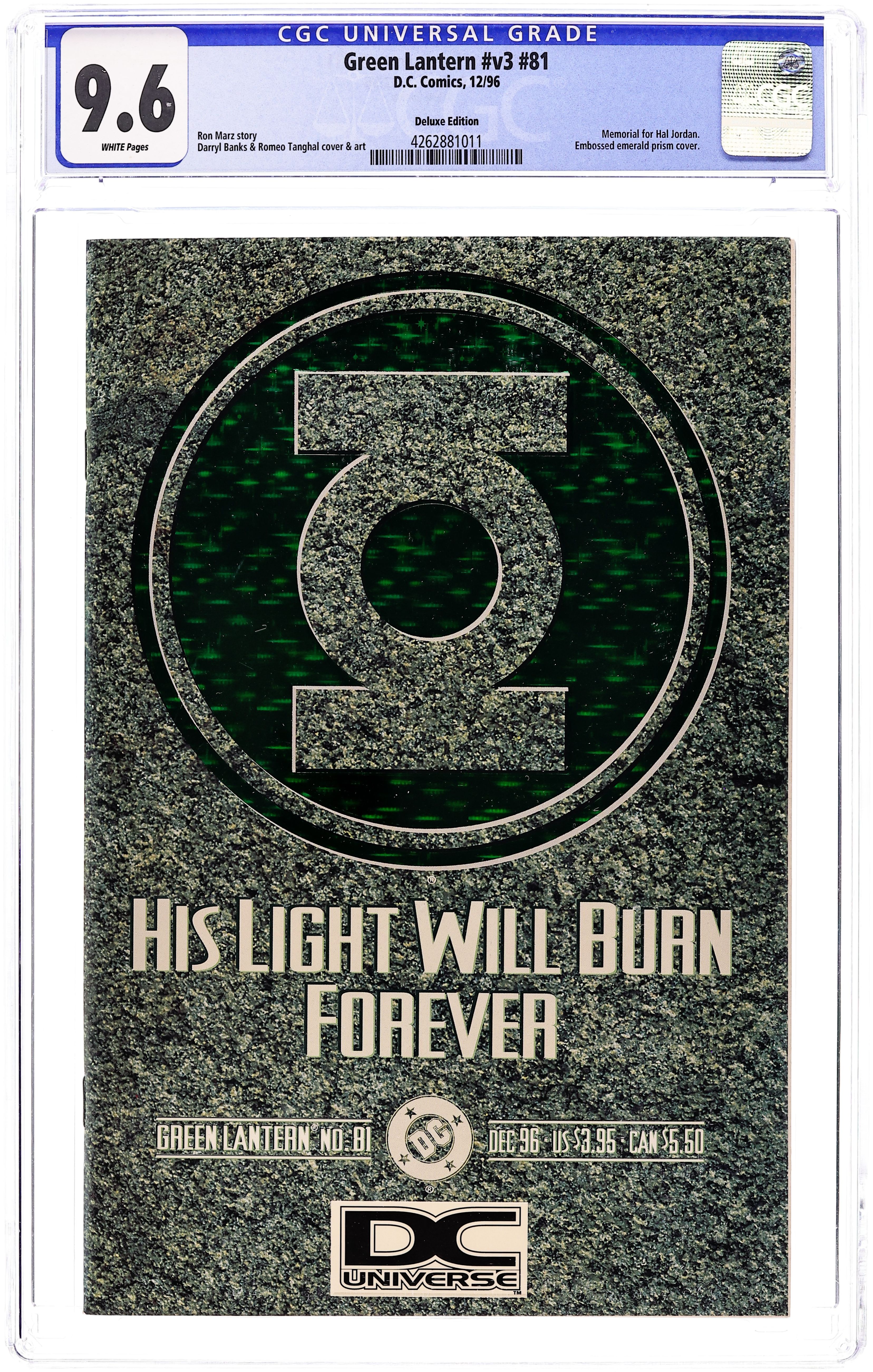 "DC Universe" Deluxe Edition. Embossed Cardstock Edition Cover. Final Night tie-in. (Uncredited) "Funeral for a Hero!" Guest-starring the JLA, Young Justice, the Marvel Family, Nightwing, New Titans, Max Mercury, Blue Beetle, Booster Gold, Deadman, the Swamp Thing, Firestorm, Donna Troy, and more. Story by Ron Marz. Art and cover by Darryl Banks and Romeo Tanghal. In the aftermath of epic events of the Final Night (1996) #4, Green Lantern and the heroes of the DCU mourn the loss of a true hero. Cover price $3.95.