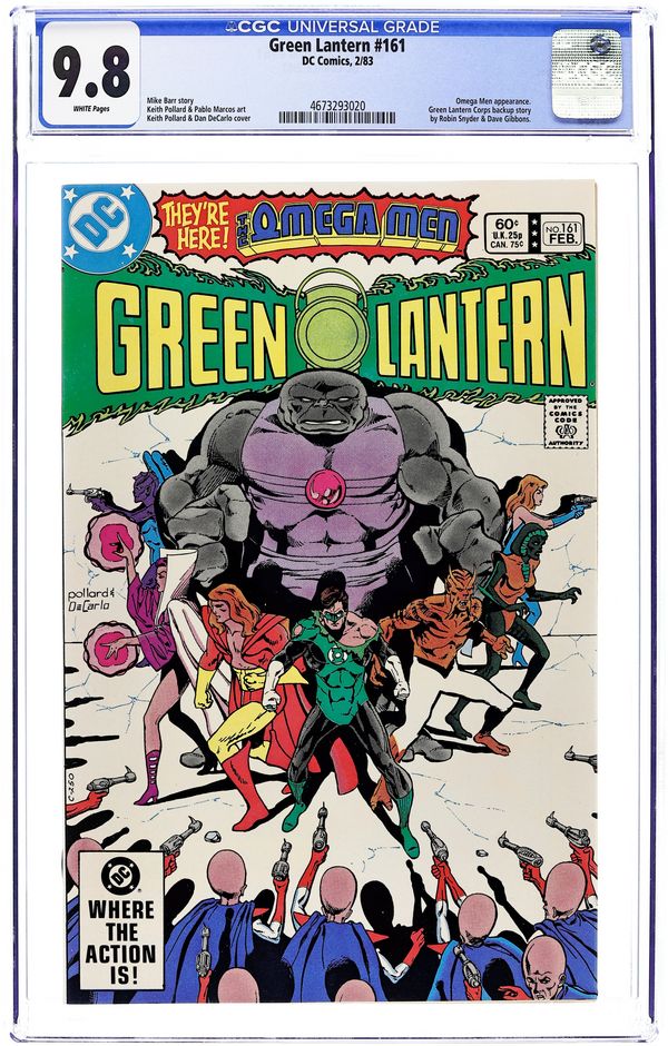Newsstand Edition. 1st appearance of Omega Men. "The Lurkers in the Shadow." While vacationing in Canada, Green Lantern and Carol Ferris are captured by the Omega Men, who make their first appearance. Script by Marv Wolfman, art by Joe Staton. Cover by George Pérez. Cover price $0.50.