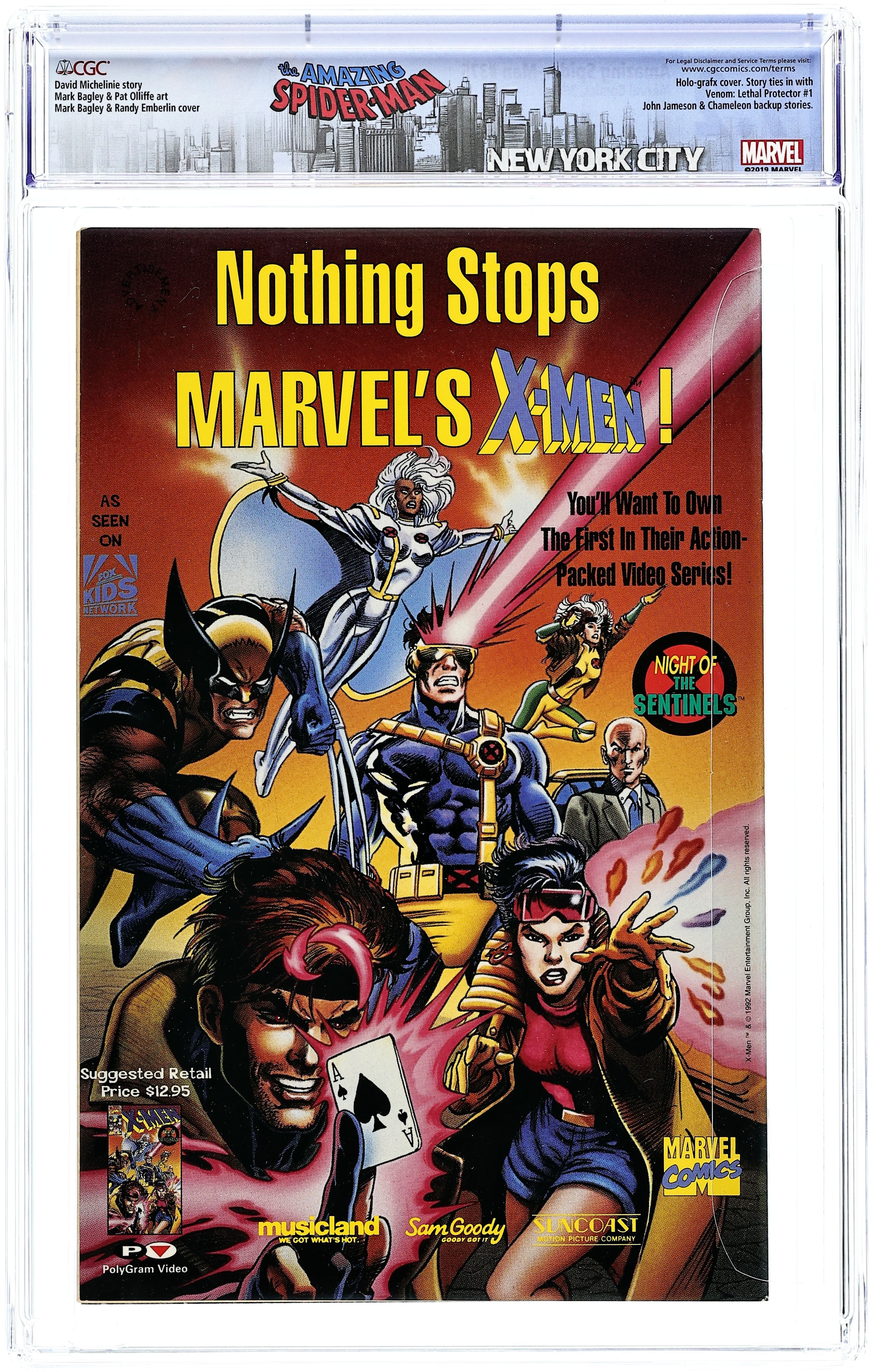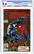 Newsstand Edition. 30th Anniversary issue of Amazing Spiderman #1. "The Bride of Venom" Part 2 of 2. Script by David Michelinie. Pencils by Mark Bagley. Inks by Randy Emberlin. Gold foil holografix cover by Mark Bagley and Randy Emberlin. Inside an abandoned Brooklyn amusement park, the Lethal Protector holds Richard and Mary Parker captive! The disturbed Venom thinks he's just doing what's best for Peter's parents! But that's not going to work! No way, no how! So, the wall-crawler heads to the park knowing a fierce fight awaits! However, the web-slinger may have help this time from a very unlikely source...Eddie Brock's ex-wife! Wow, will there be a family reunion atop the Ferris wheel? Or perhaps a funeral beneath it? One way or another, the Amazing Spider-Man and Venom battle for the last time! Cameo appearances by Silver Sable, Battlestar, Mary Jane Watson, and J. Jonah Jameson. Second story: "True Friends!" Script by Tom DeFalco. Pencils by Patrick Olliffee. Inks by Mark McKenna. Aware of what the Human Torch did to Empire State University, Spider-Man vows to bring his friend to justice. Cameo appearance by Silver Sable. Plot crosses over with Fantastic Four 373 & 374. Third story: "The Monster Within" Script by Eric Fein. Art by Dan Panosian. JJJ tries to get his son, John Jameson, started in the field of journalism. Fourth story: "Echoes..." Script by Terry Kavanagh. Pencils by Aaron Lopresti. Inks by Don Hudson. The Chameleon visits the grave of Kraven the Hunter. (Notes: Venom appears next in the first issue of his Lethal Protector (1993) series. The letters page includes a statement of ownership: average print run 660,958. average paid circulation 544,900.) 68 pages. Cover price $3.95.