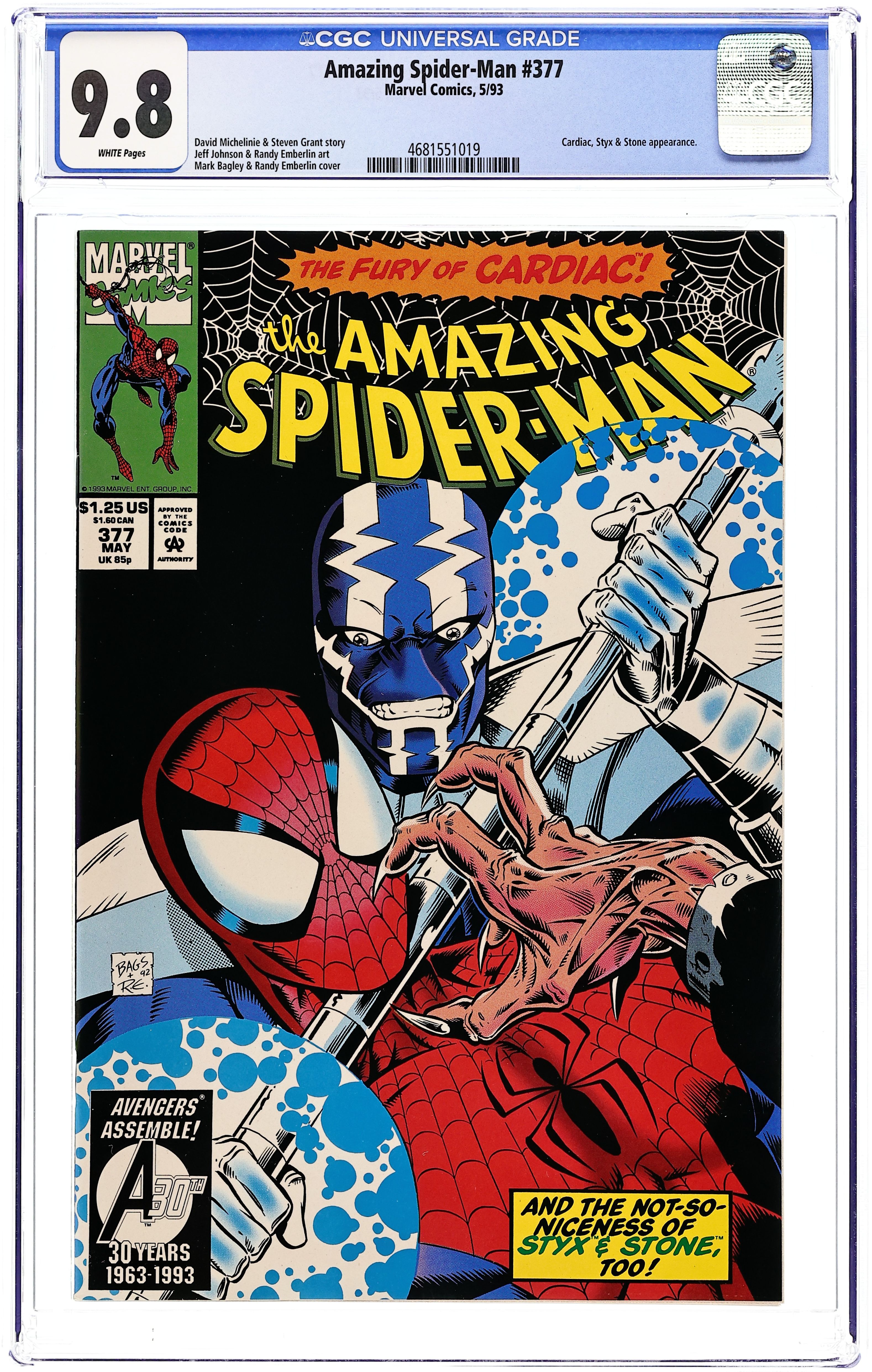 "Dust to Dust" Part 2 of 2. Plot by David Michelinie. Script by Steven Grant. Pencils by Jeff Johnson. Inks by Randy Emberlin. Cover by Mark Bagley and Randy Emberlin. After their tenacious battle last issue, Cardiac determines that Styx has to be eliminated! So to that end Dr. Elias Wirtham tricks Stone into bringing Styx to a New Jersey medical facility for treatment. But Cardiac's scheduled tests will put Styx out of action... permanently! Wow, so much for the Hippocratic Oath! Fortunately though, a well-placed spider-tracer leads the web-slinger directly to Cardiac's location! And the Amazing Spider-Man clashes with Cardiac to save Styx and Stone! Talk about an ethical dilemma! Origin of Styx and Stone. Cameo appearances by J. Jonah Jameson, Joe Robertson, Richard Parker, and Mary Parker. (Note: Styx and Stone appear next in the first issue of Spider-Man The Arachnis Project (1994) Limited Series.) 36 pages. $1.25 cover price. Cover price $1.25.