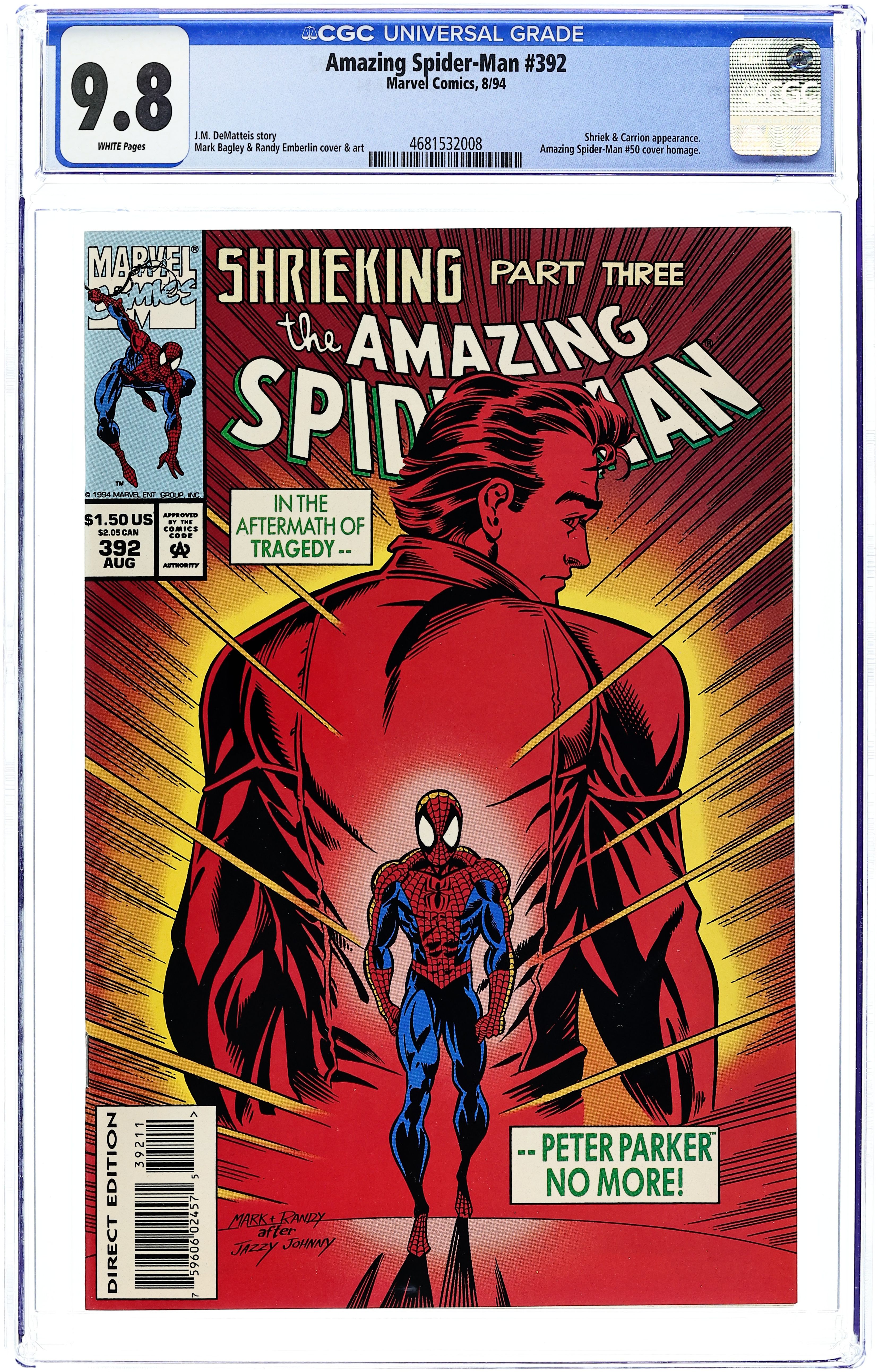 Direct Edition. "The Cocoon!" Shrieking Part 3 of 4. Script by J.M. DeMatteis. Pencils by Mark Bagley. Inks by Randy Emberlin. Cover by Mark Bagley and Randy Emberlin. Crises abound for the mentally and physically exhausted web-slinger! After going down to defeat at the hands of Shriek and Carrion last issue, the beleaguered wall-crawler limps back home to rest! However, his much-needed rest is denied upon learning that his dear Aunt May has suffered a stroke! In Forest Hills Peter grieves with Mary Jane, but he cannot stay for long as Shriek is still at large. Finally in Astoria in Carrion's mother's house, the amazing one catches up with Shriek! Can the Spectacular Spider-Man silence Shriek once and for all? (Note: The cover pays homage to John Romita Sr.'s classic cover to Amazing Spider-Man 50.) 36 pages. Cover price $1.50.