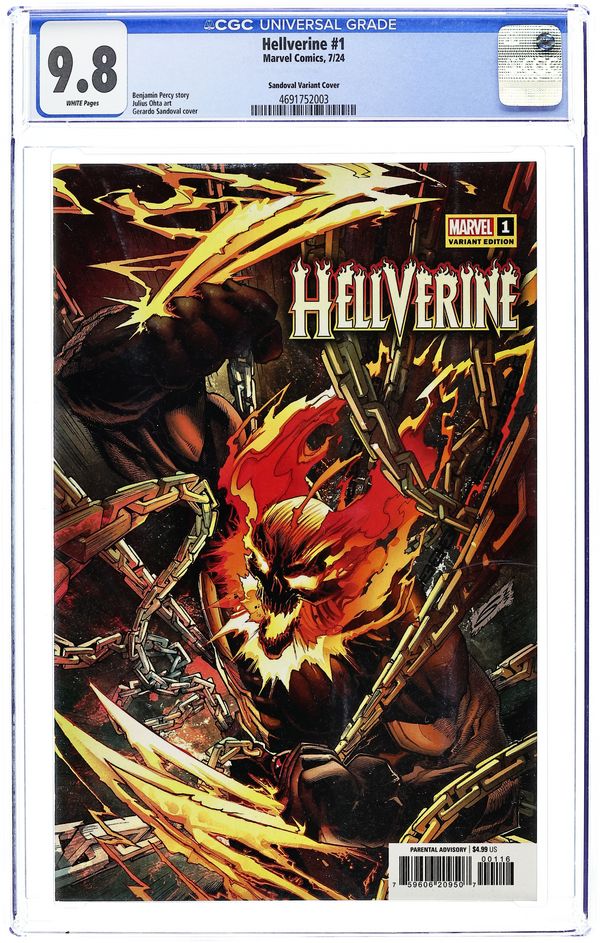Limited 1 for 25 Retailer Incentive Variant Cover. Written by Benjamin Percy. Art by Julius Ohta. Cover by Gerardo Sandoval. RIDE TO HELL AND BACK IN HELLVERINE'S FIRST EVER SOLO SERIES! Because you demanded it - the return of the HELLVERINE! When a DEMONIC FORCE known as BAGRA-GHUL first came to earth, it brought LOGAN and GHOST RIDER together to hunt it before it possessed WOLVERINE. But now, in the present day, what event will put the Hellverine back on the streets…and is he slashing his hellfire claws for good or evil? And, introducing the ALL-NEW HELLFIRE WARRIORS! 36 pages, full color. Rated Parental Advisory Cover price $4.99.